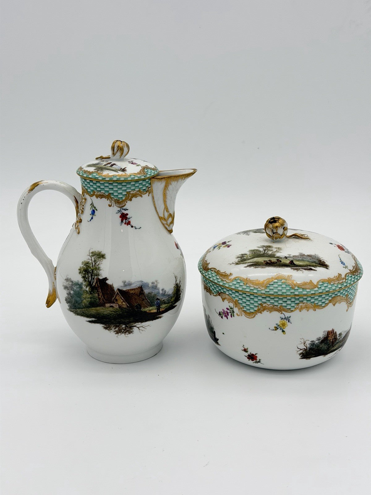 Rare Meissen C.1720 Porcelain Painted Country Scene Milk Jug & Sugar Bowl Antiqu