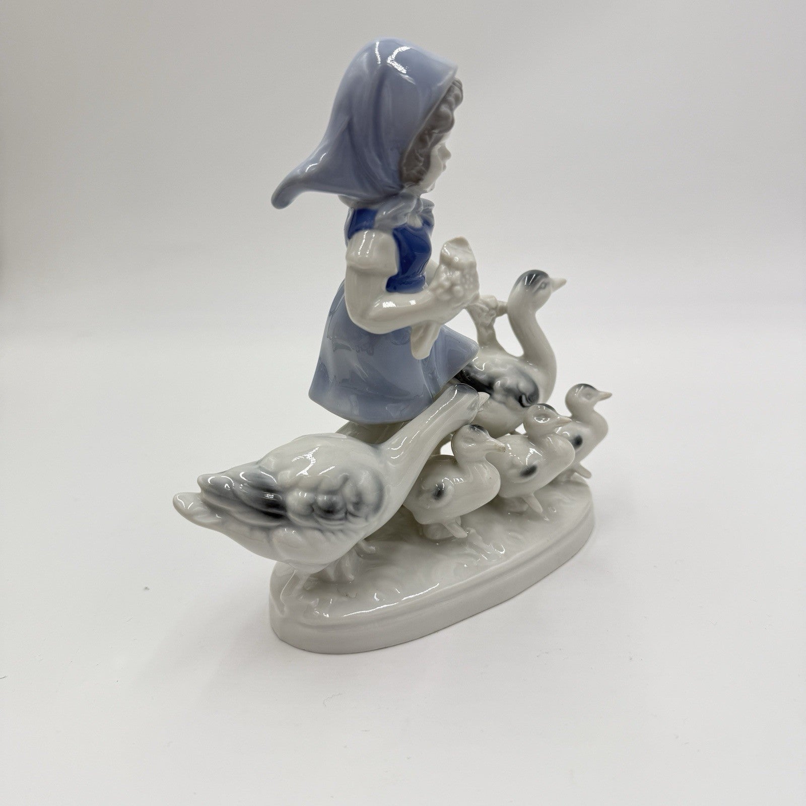 This vintage figurine from Gerold Porzellan Bavaria, Western Germany features a beautiful girl with geese and ducks. The glossy finish and all-over blue color make it a perfect decoration for any room, while the medium size of 5.5 inches in length, 7 inches in height, and 4 inches in width makes it easy to display. The figurine is an original piece, unboxed and unsigned, but still a valuable addition to any collection.