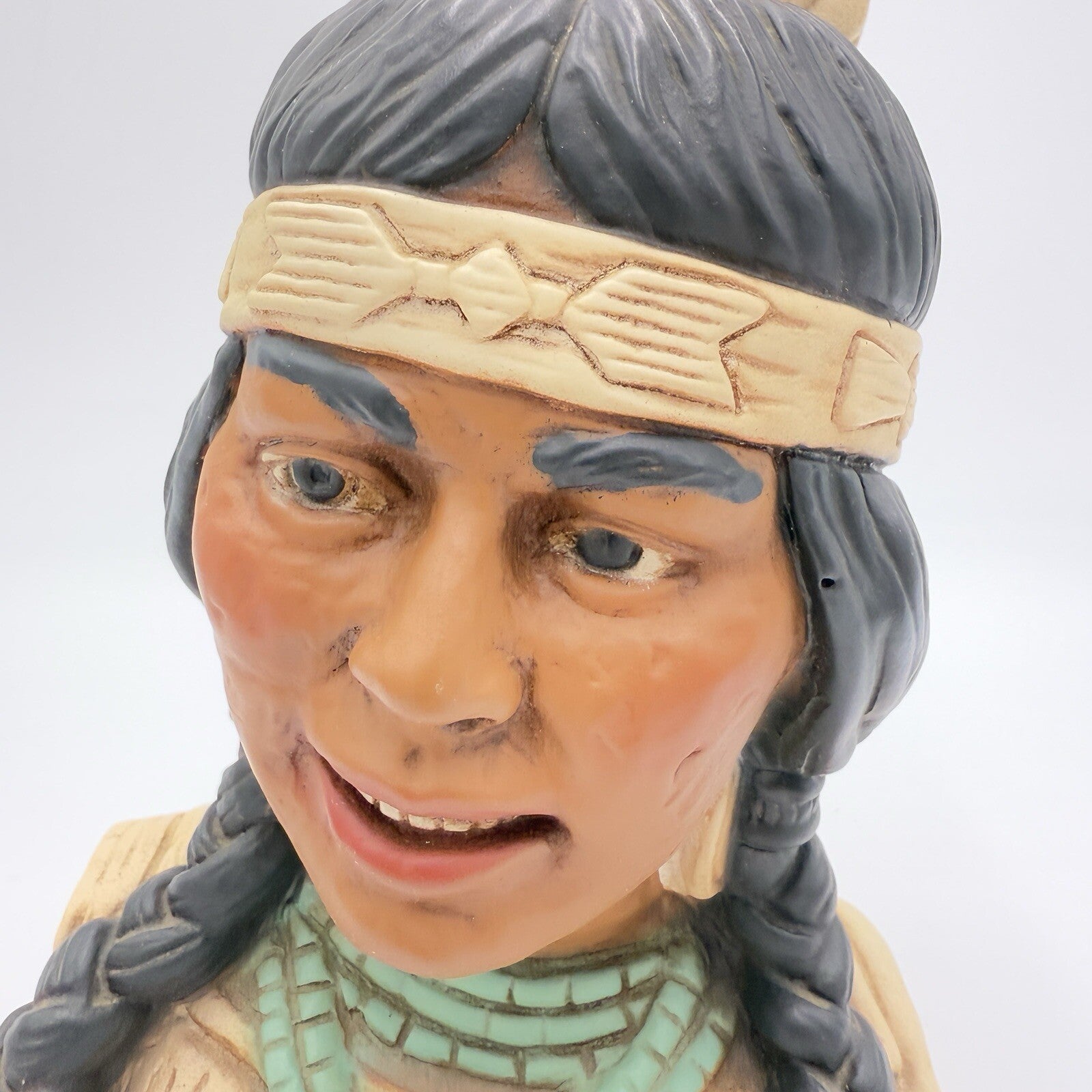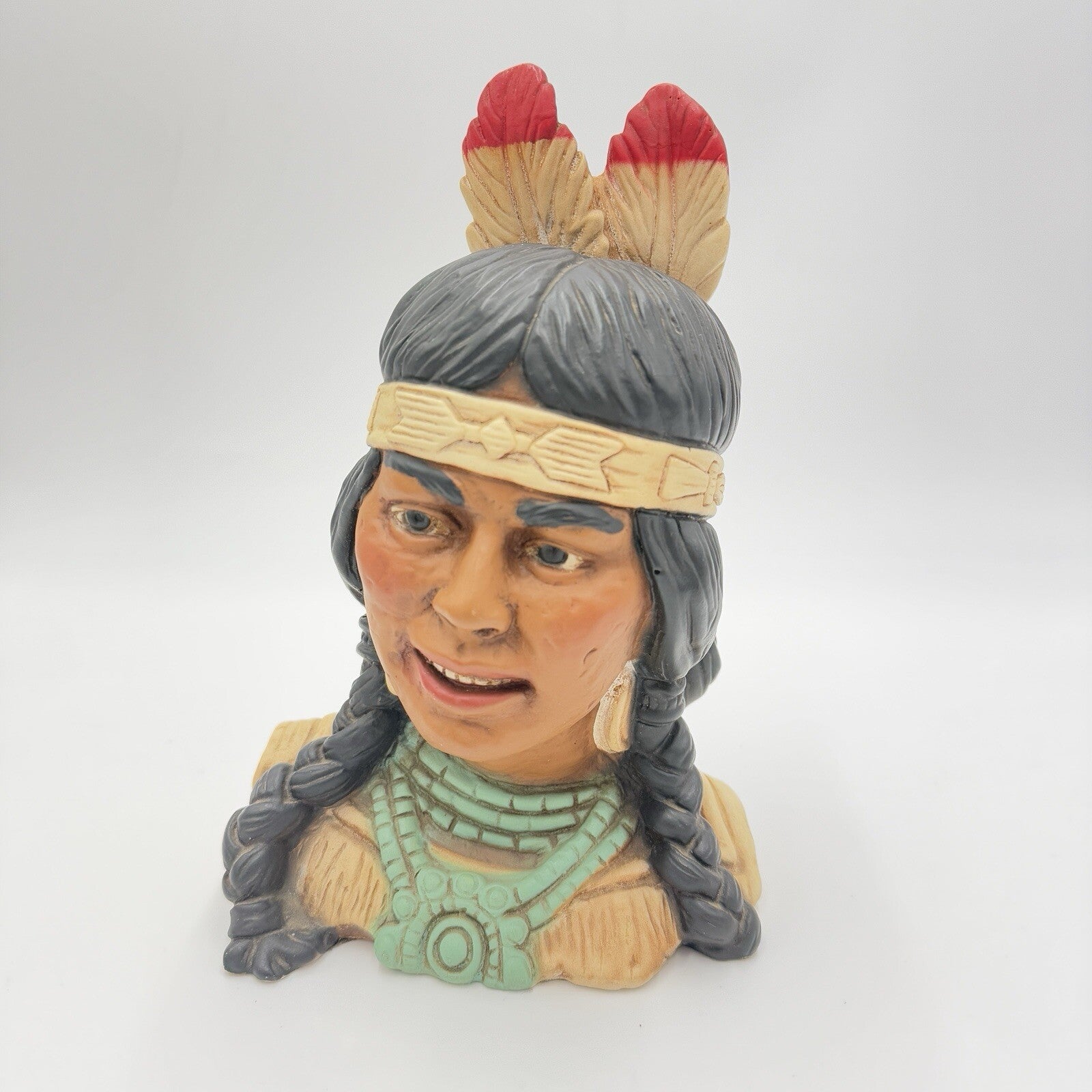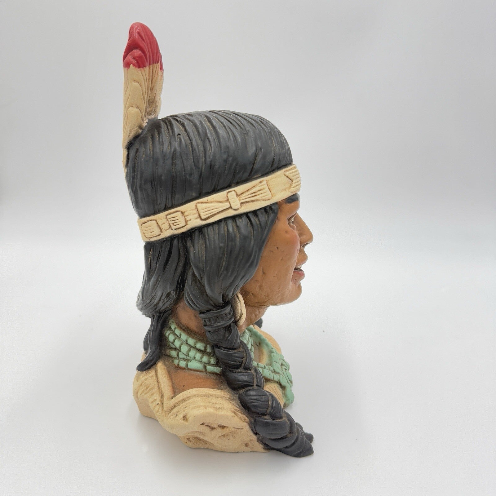 A 1974 sculpture by Universal Statuary Corp depicts a 10" tall female Native American figure. Made of chalk and hand-painted in multicolor, this 3D piece features a 1970s style with a realistic portrayal of a Native American woman. The original artwork from the United States captures the essence of Native American culture, suitable for display in any room.