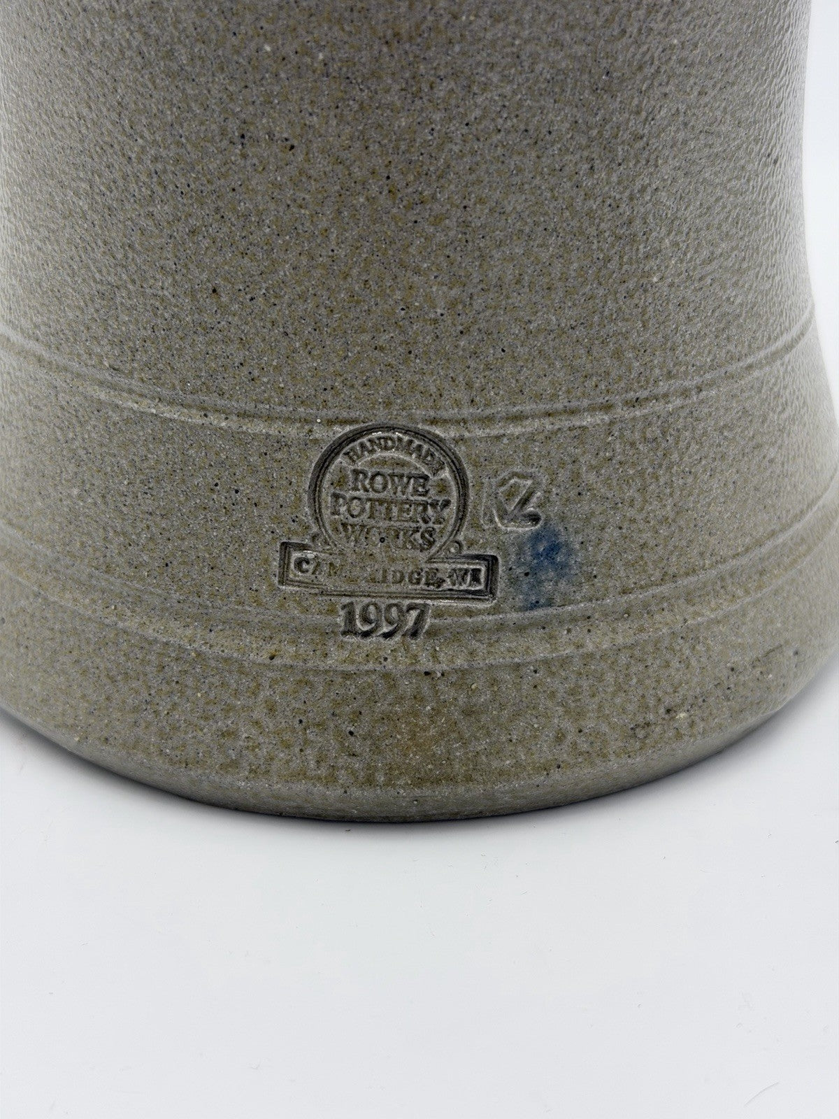 The 1995 Rowe Pottery Works Stoneware Blue Leaves Design Salt Glaze Flower Vase is a unique and decorative piece of North American art pottery. Standing at 9 inches tall, this vase features a beautiful blue color with a salt glaze finish, adding to its rustic charm. Signed by the artist and produced in the 1990s using traditional pottery techniques, this vase captures the essence of nature with its leaf pattern and flower theme, making it a perfect addition to any vintage-inspired decor.