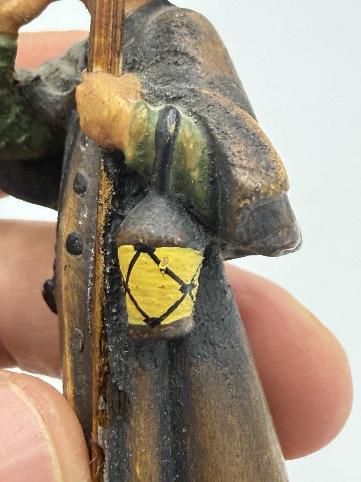 The product is a vintage 4" wooden figurine of a night guard, hand-carved in Italy with a multicolor finish. This rare collectible from the 1950s features intricate carvings and embodies Italian folk art style. The figurine, part of a limited edition collection by ANRI, depicts a man in a unique all-over pattern, making it a perfect addition to any art-themed decor or collection. Ideal for all occasions and crafted with attention to detail, this piece showcases the craftsmanship and charm of Italian sculptural art.