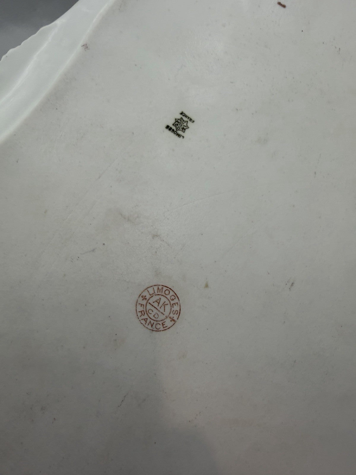 This Antique AK Limoges France Cupid Cherubs Gilded Large Rectangle Platter Porcelain is a stunning piece of vintage decor from the early 1900s. Made in Limoges, France, this floral patterned platter features intricate gilding and cherubs, depicting a neoclassical style. Measuring 12" in length and 8" in width, this multicolored porcelain piece is a unique and decorative addition to any dining or display table. With its glossy finish and original production technique, this Limoges platter is sure to impress collectors and enthusiasts of antique pottery.