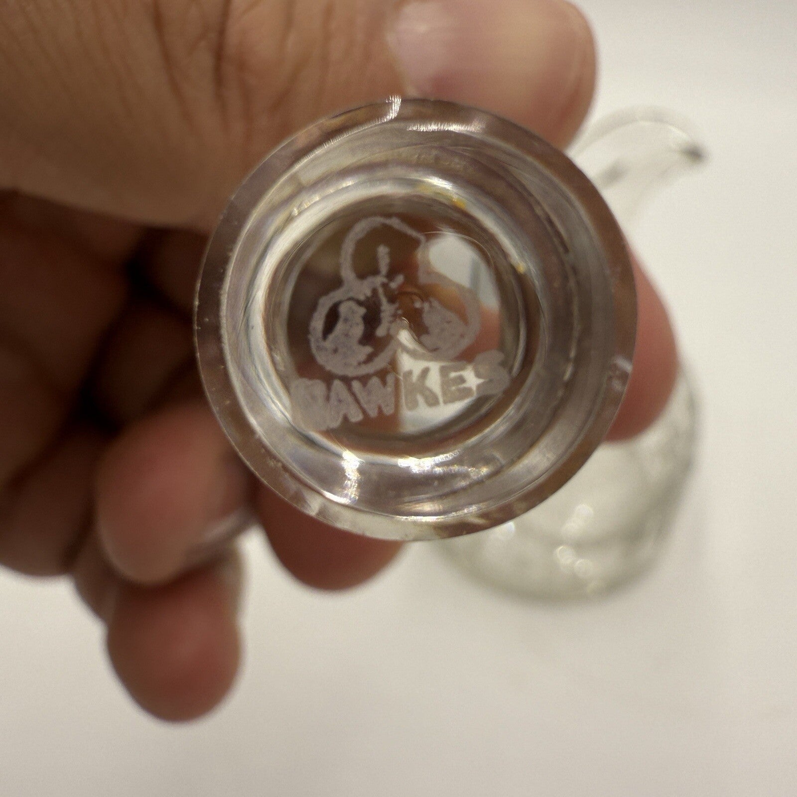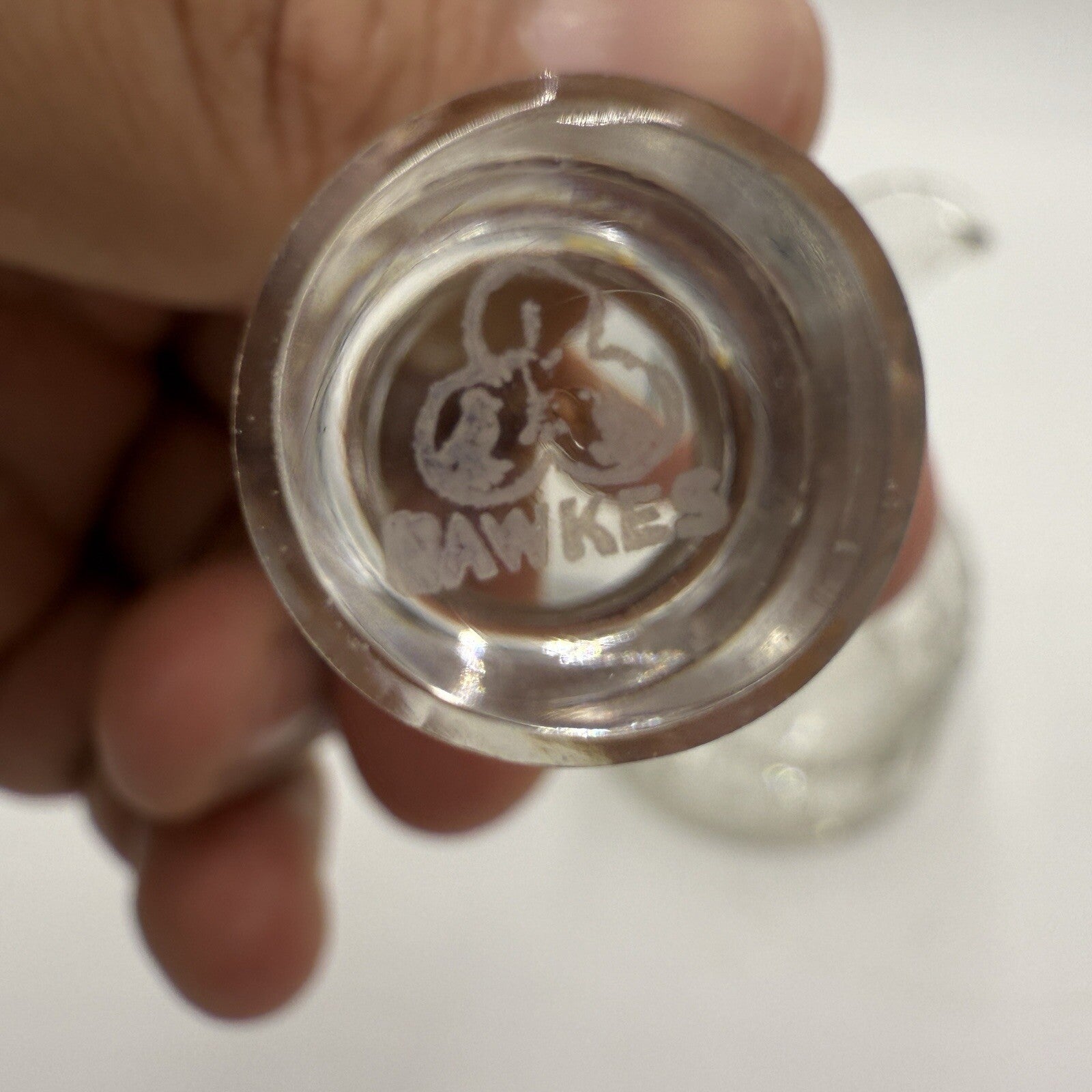 Add a touch of vintage charm to your dining table with this beautiful Hawkes etched oil and vinegar pitcher. Crafted in the United States in 1920, this rare signed piece features a round shape with a clear glass stopper and an incised backstamp. The glossy finish and cut glass production style make it a stunning addition to any collection.