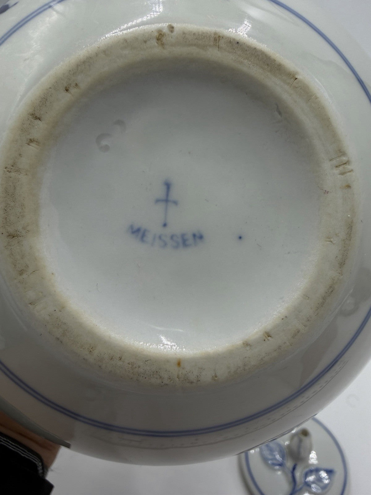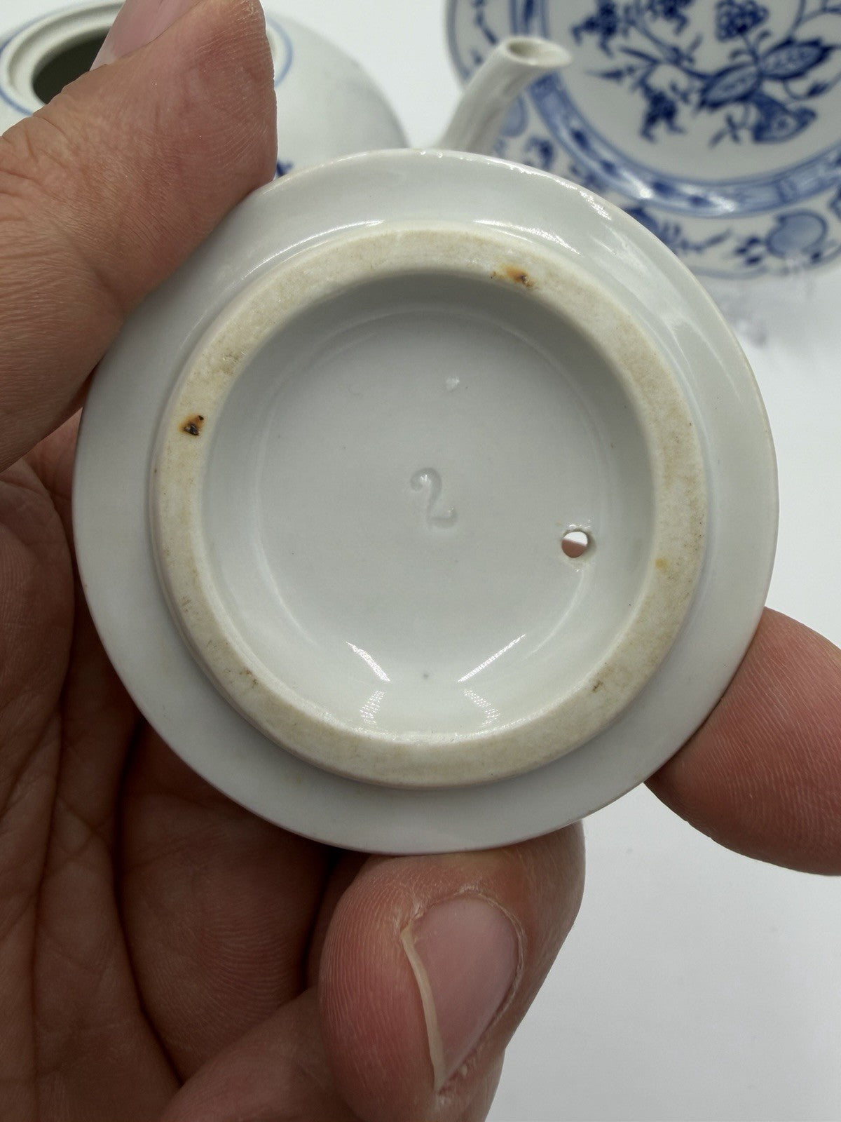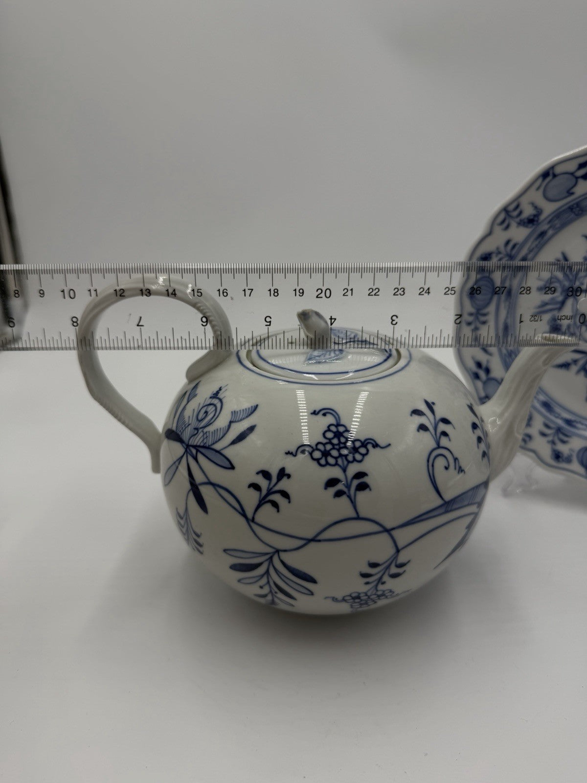 Antique Meissen Porcelain Blue Onion Teapot & Saucer Pot Germany Flower Lid