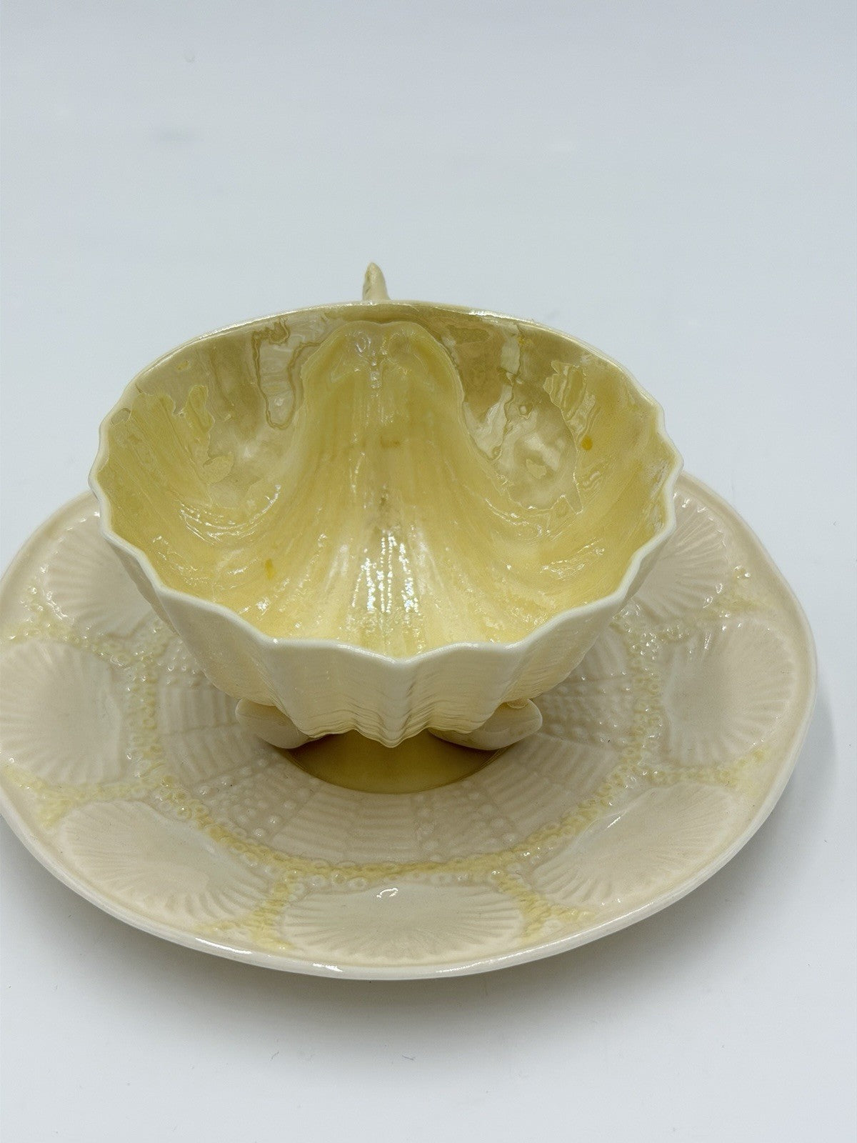 The Belleek Neptune Yellow Seashell Footed Demitasse Tea Cup & Saucer set is a vintage two-piece porcelain tea cup with a saucer, featuring a Neptune pattern in yellow color. This Art Deco style cup is adorned with a handle and has a glossy finish, making it a unique and elegant addition to any tea set collection. Made in Ireland, this Belleek Neptune tea cup is perfect for all occasions, especially those with an Irish theme. Hand wash only to maintain its vintage beauty.