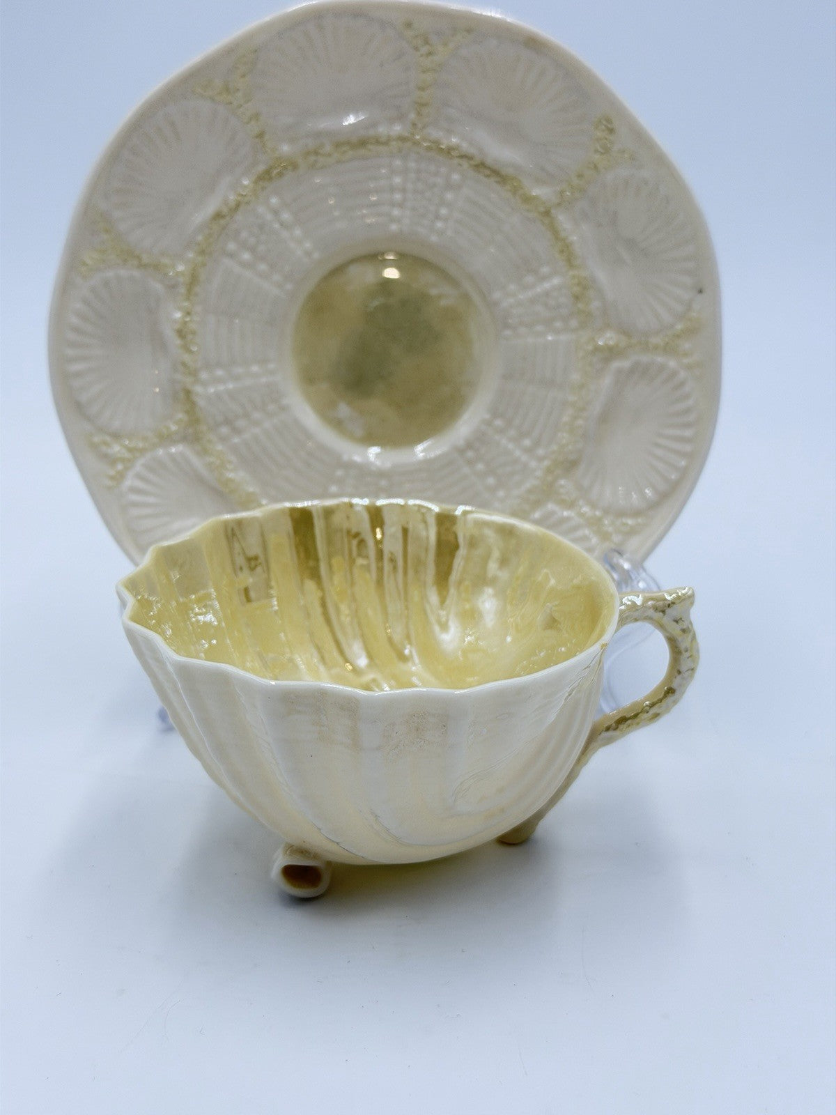 Belleek Neptune Yellow Seashell Footed Demitasse Tea Cup & Saucer Green Mark