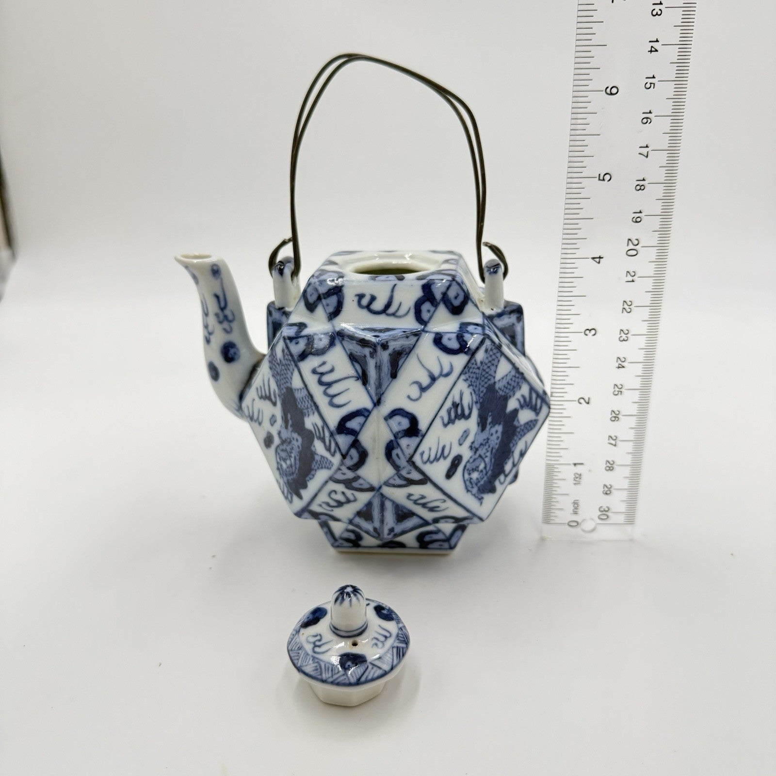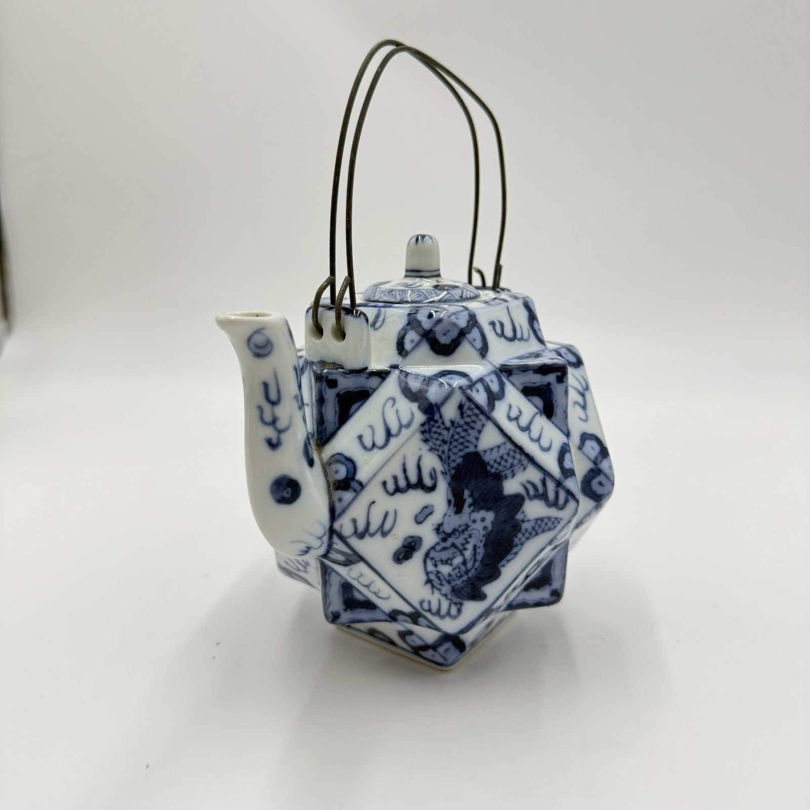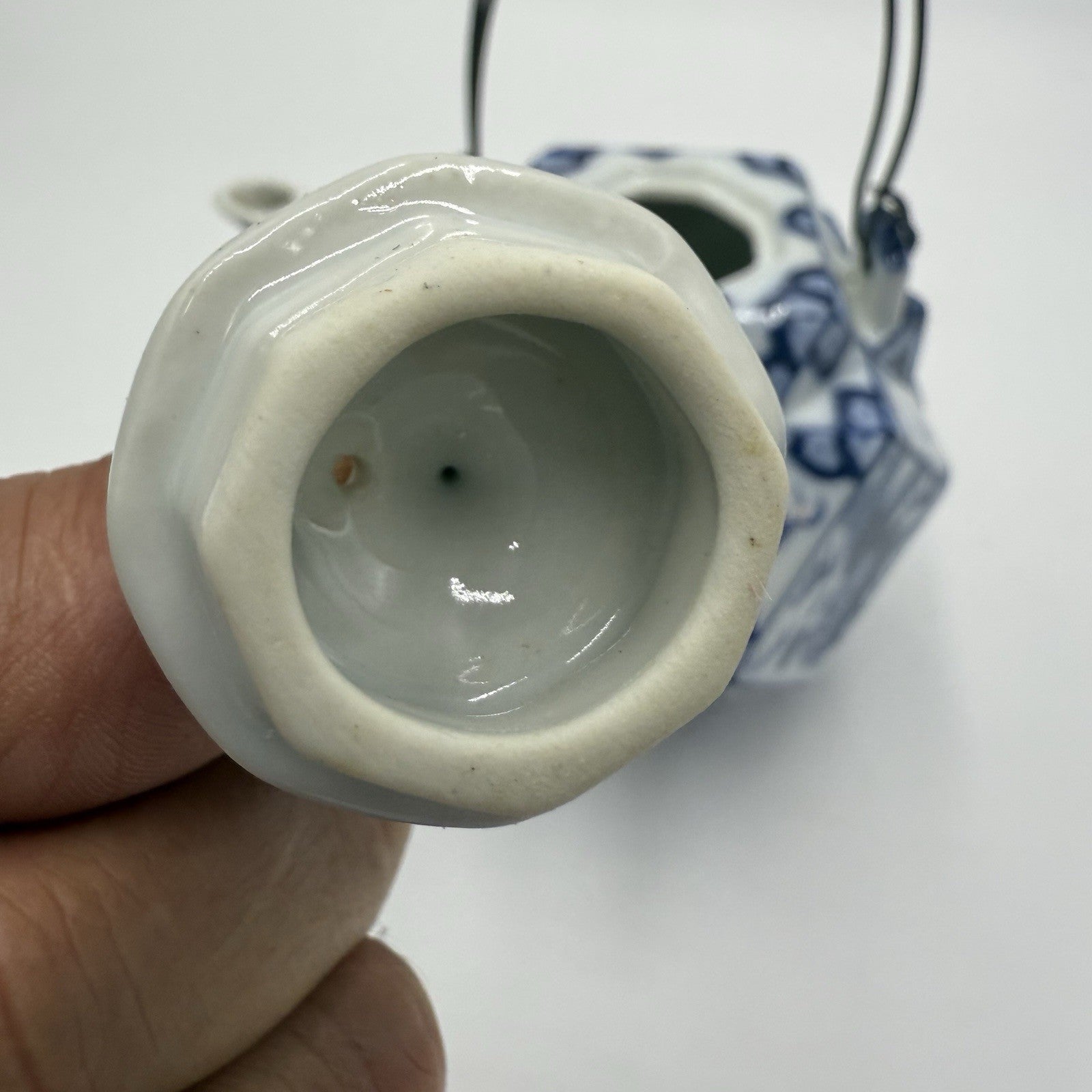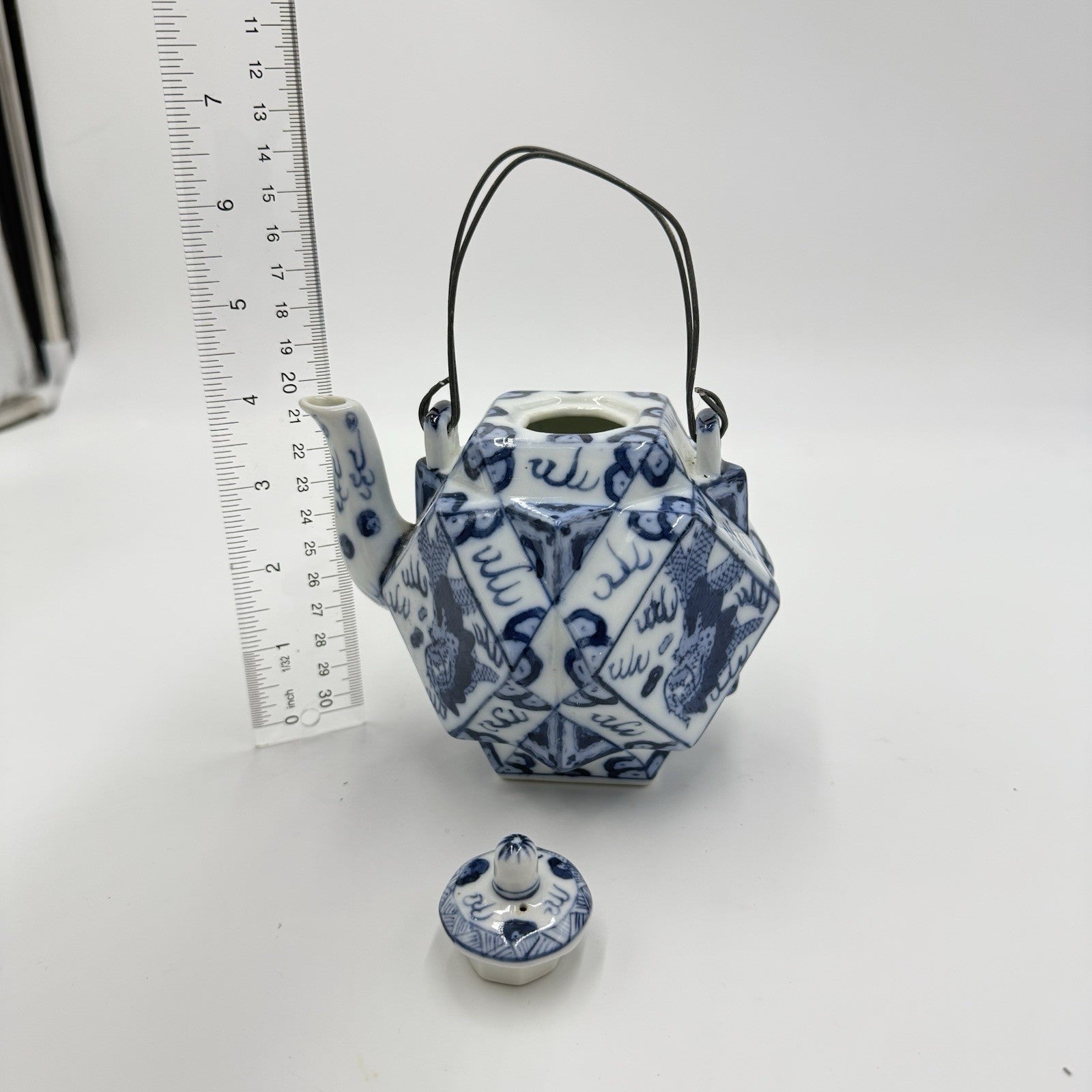 The product is a Chinese glazed blue and white porcelain teapot with painted dragons, featuring the Kangxi mark. This antique original teapot hails from China and is made of porcelain and pottery, showcasing traditional craftsmanship and design elements characteristic of Chinese art. The vibrant blue color adds a touch of elegance to this small teapot, making it a valuable piece for collectors of Asian antiques, particularly those interested in Chinese tea culture and ceramics.