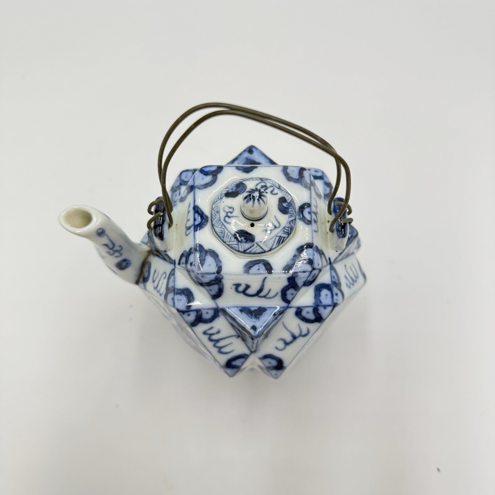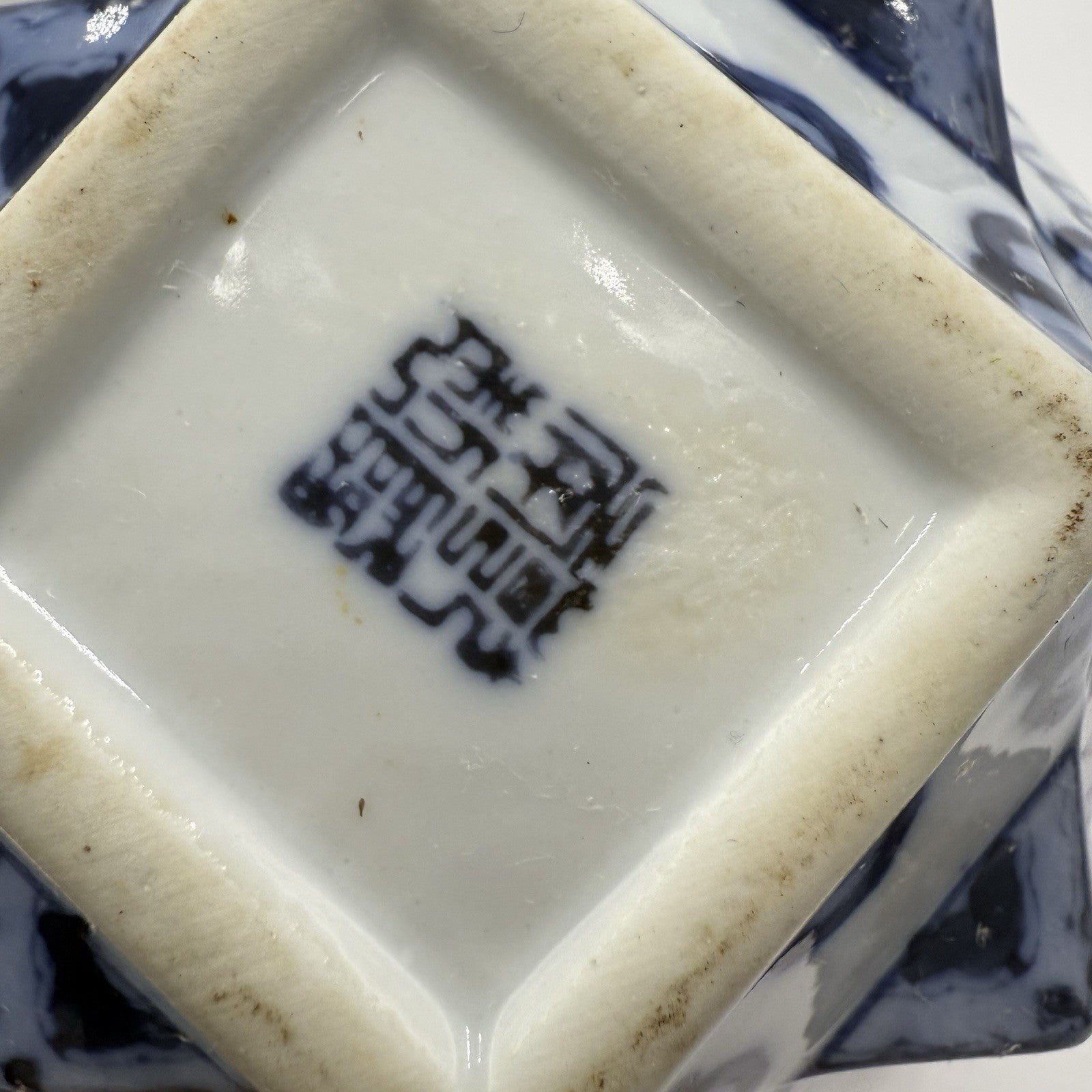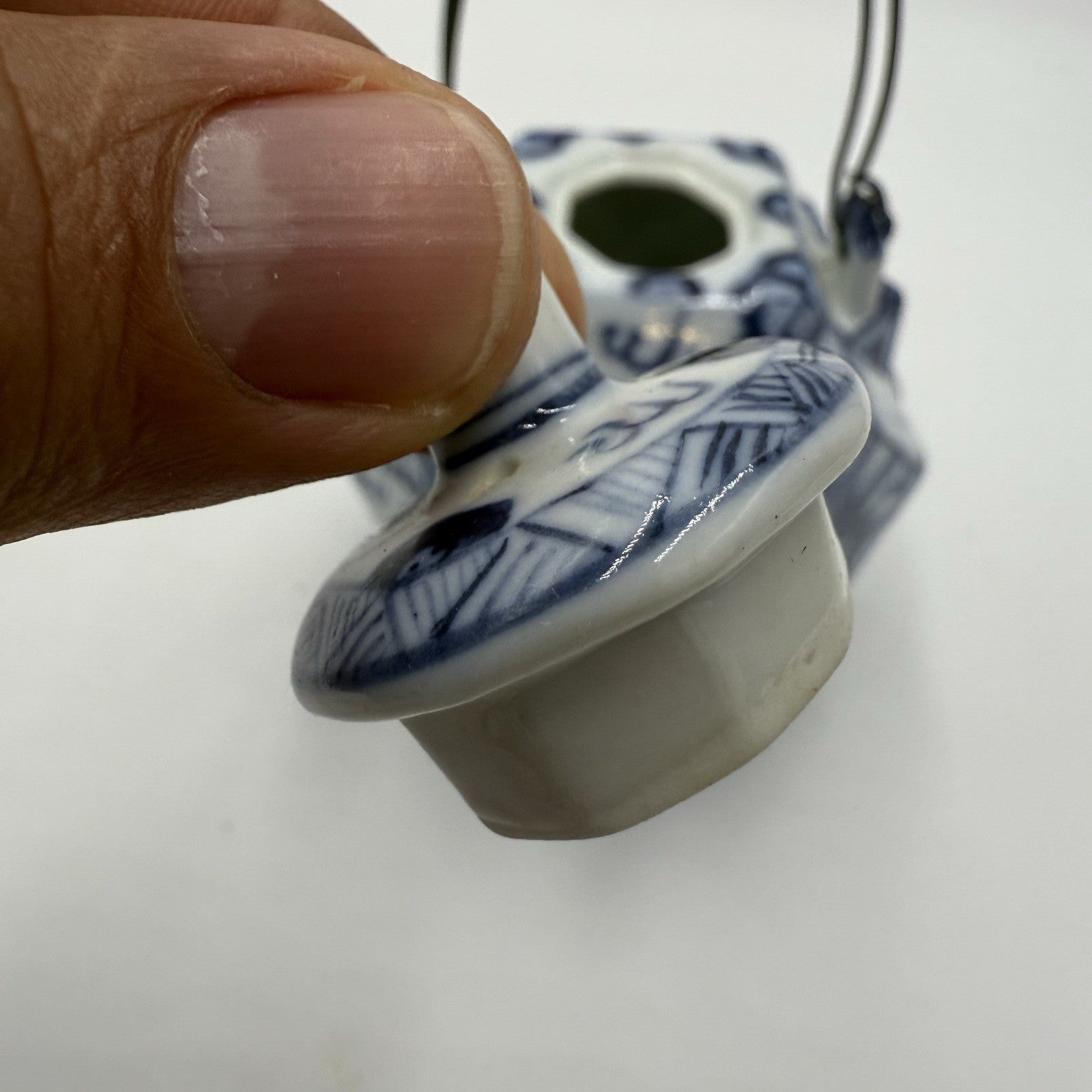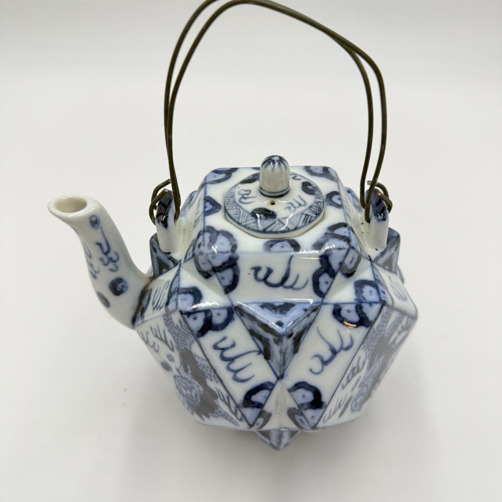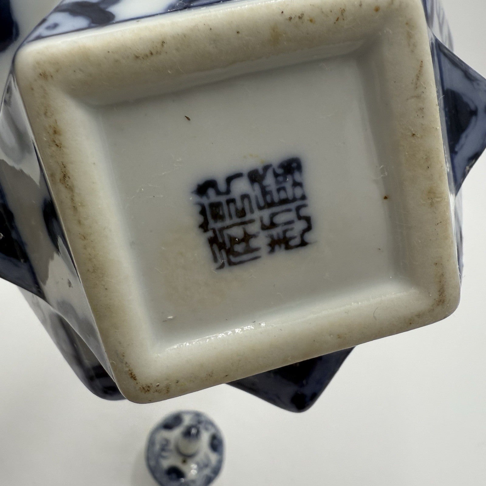 The product is a Chinese glazed blue and white porcelain teapot with painted dragons, featuring the Kangxi mark. This antique original teapot hails from China and is made of porcelain and pottery, showcasing traditional craftsmanship and design elements characteristic of Chinese art. The vibrant blue color adds a touch of elegance to this small teapot, making it a valuable piece for collectors of Asian antiques, particularly those interested in Chinese tea culture and ceramics.