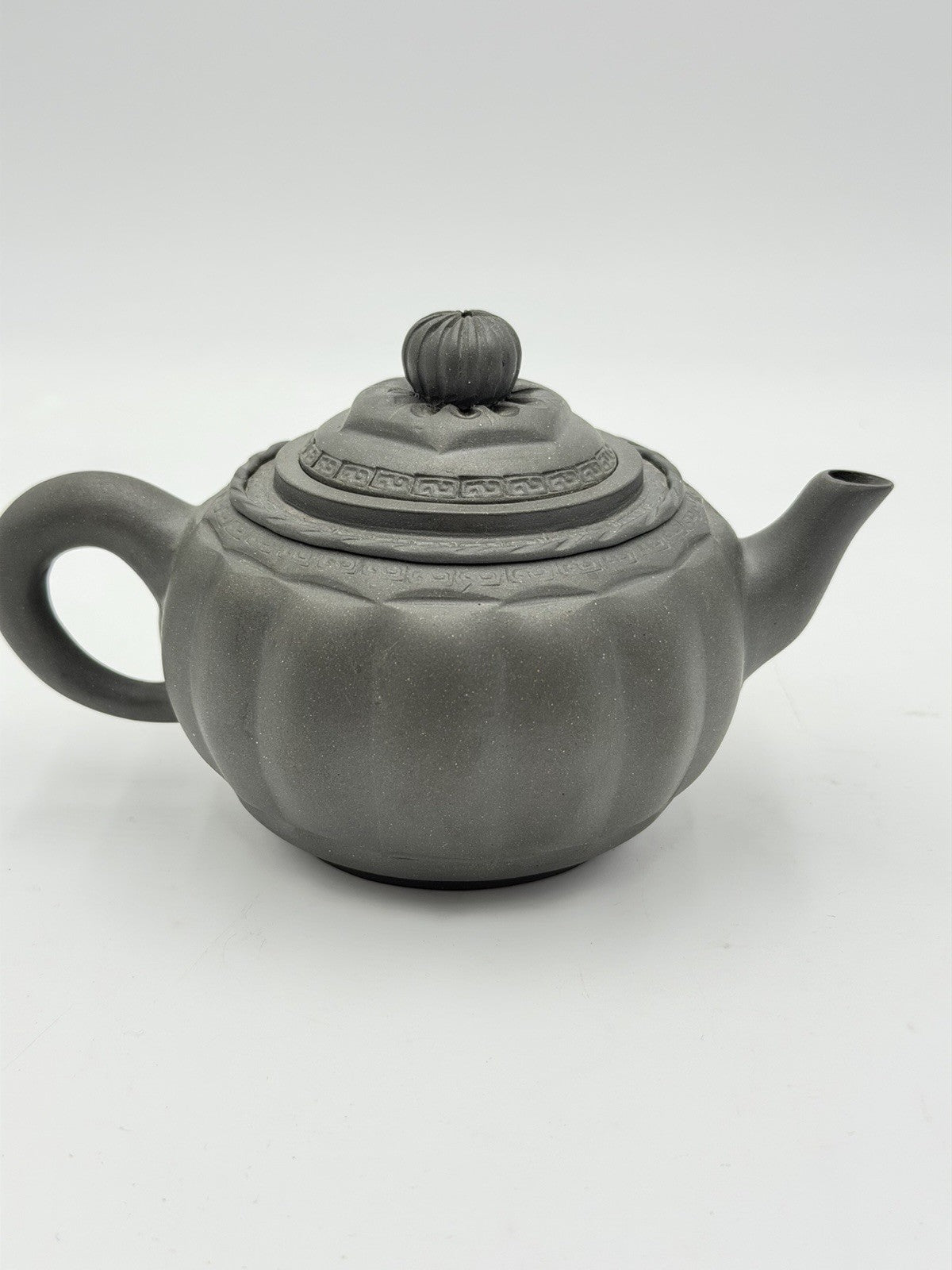 Chinese Yixing zisha clay teapot with ribbed pumpkin body & decorative lid Vtg