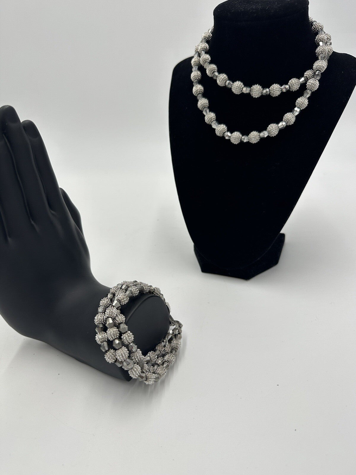 Vintage Crown TRIFARI necklace and bracelet of nubby silver metal and faceted crystal beads. It is in nice vintage condition; clean and complete, signed on the shepherd's hook clasp and also has the 'T' hang tag. The necklace measures 26” L . It's from the 1950s 'Electra Collection'.