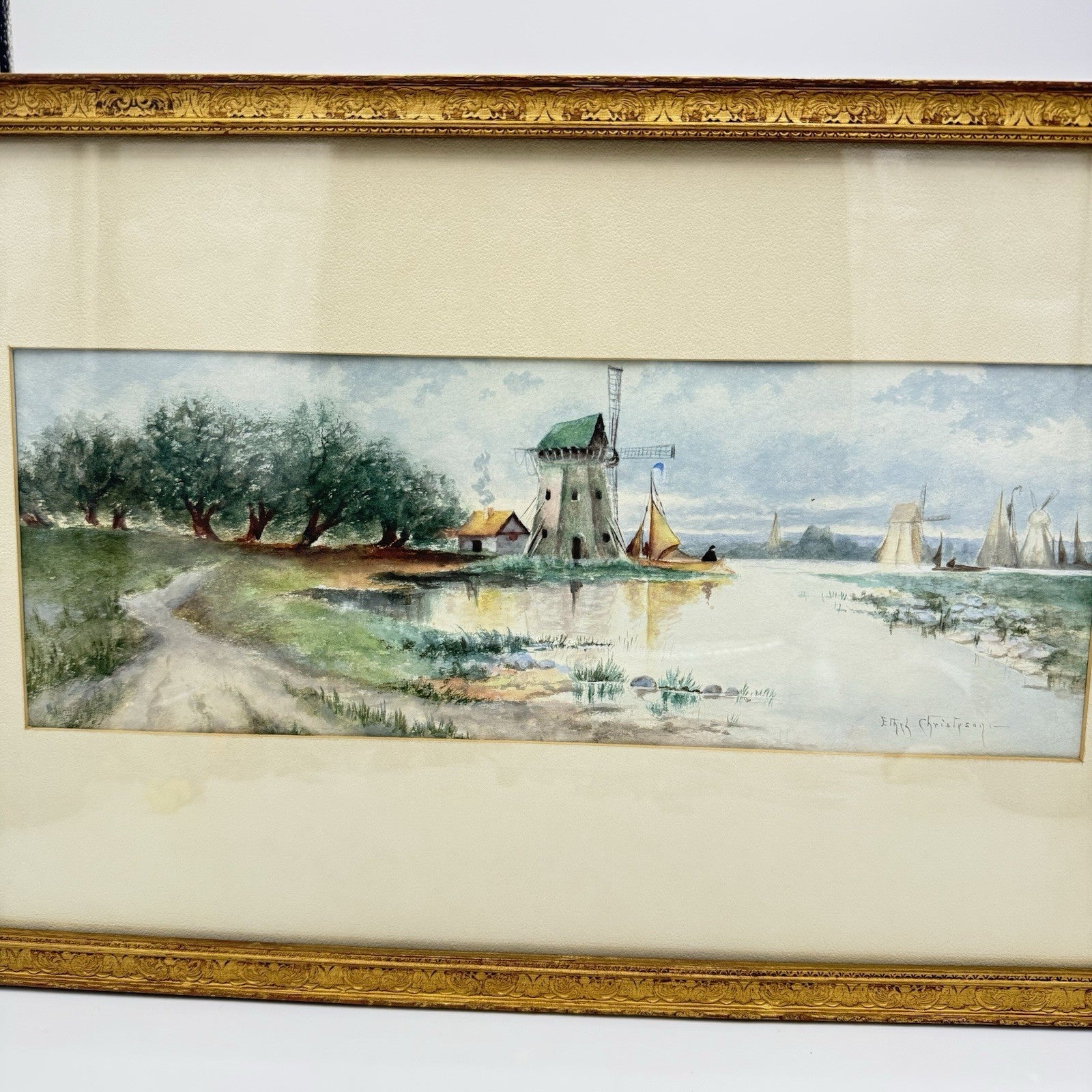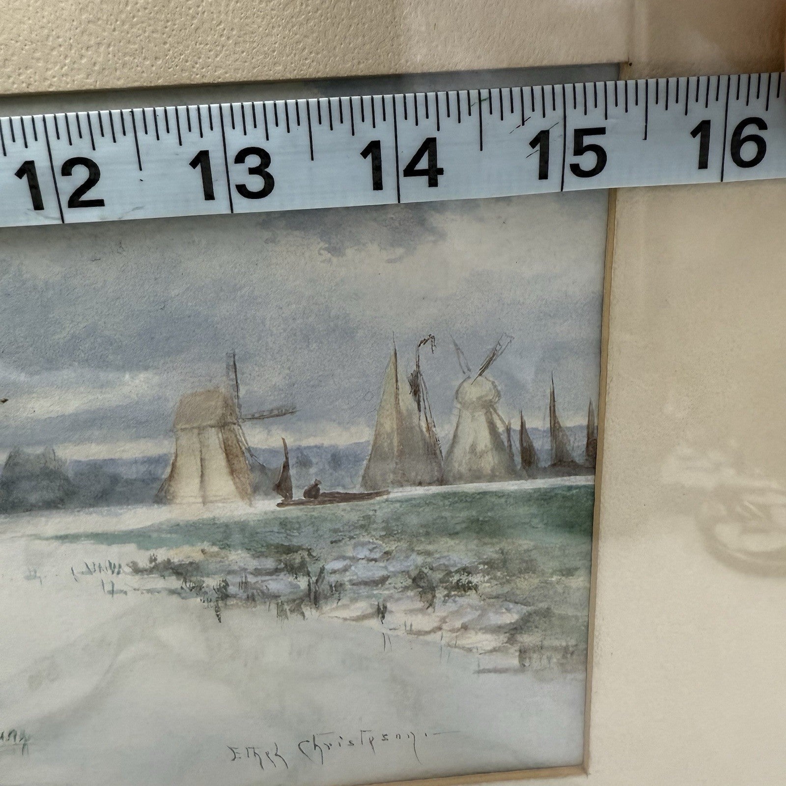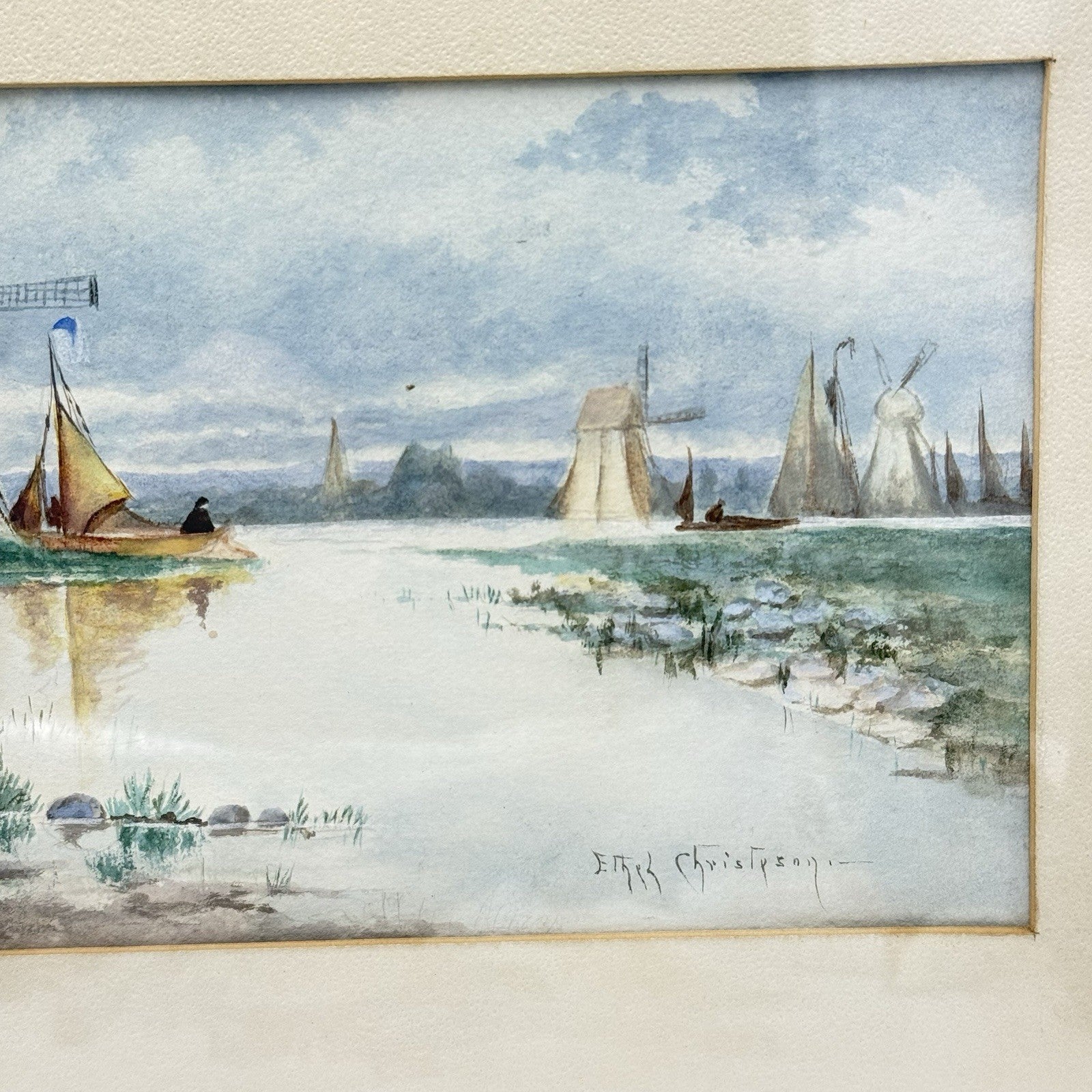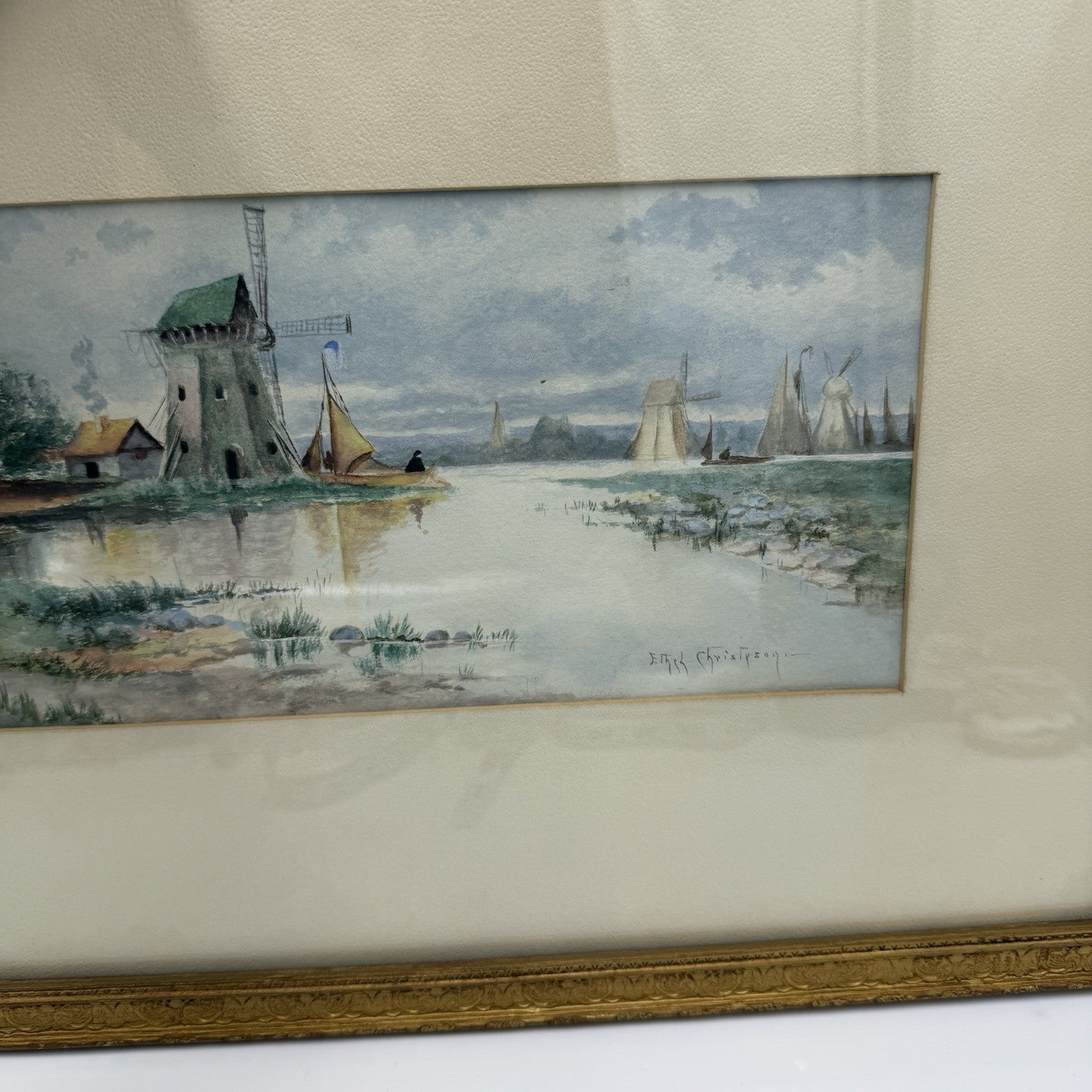 Dutch Scene Windmill & Boats Watercolor Painting signed Ethel Christpson Origin