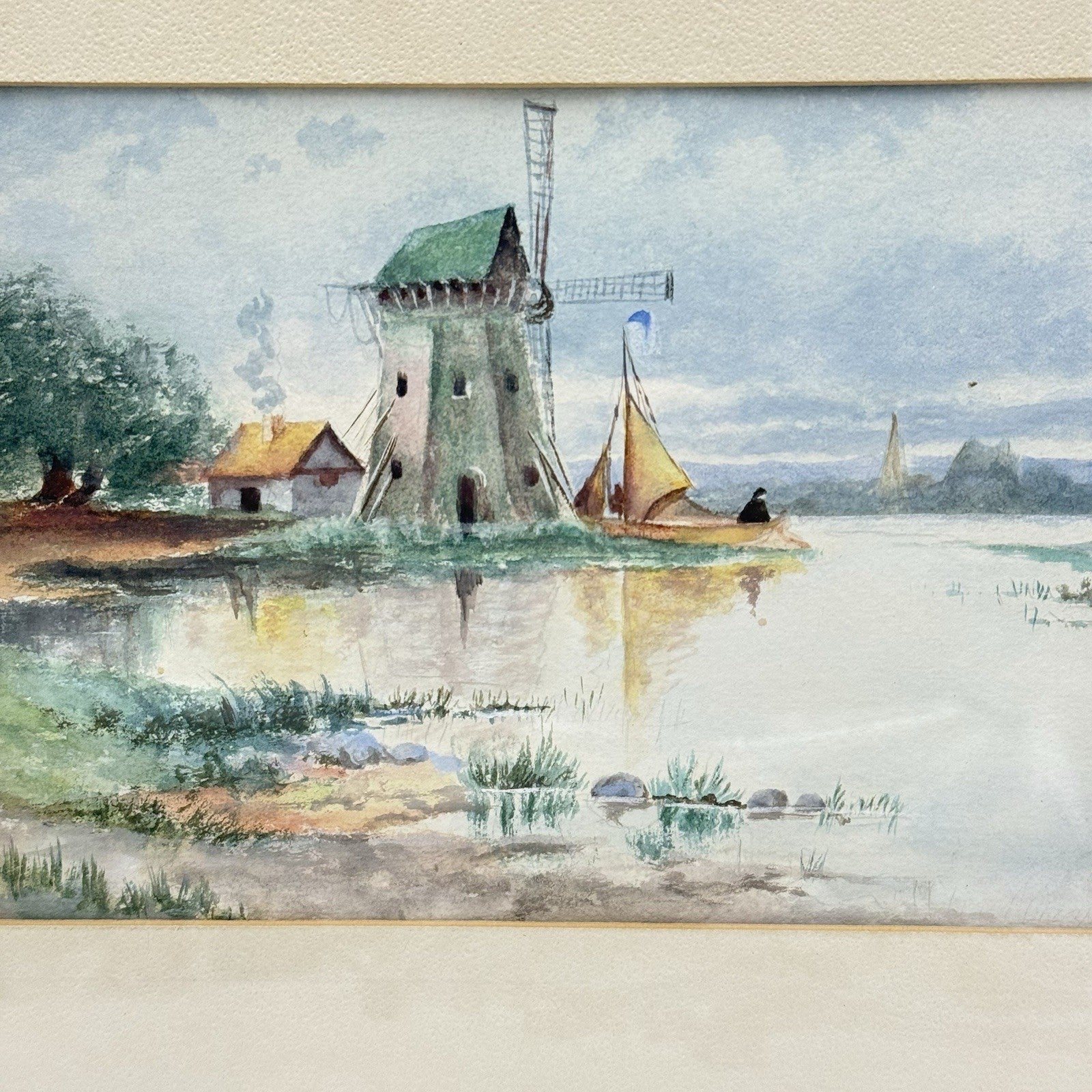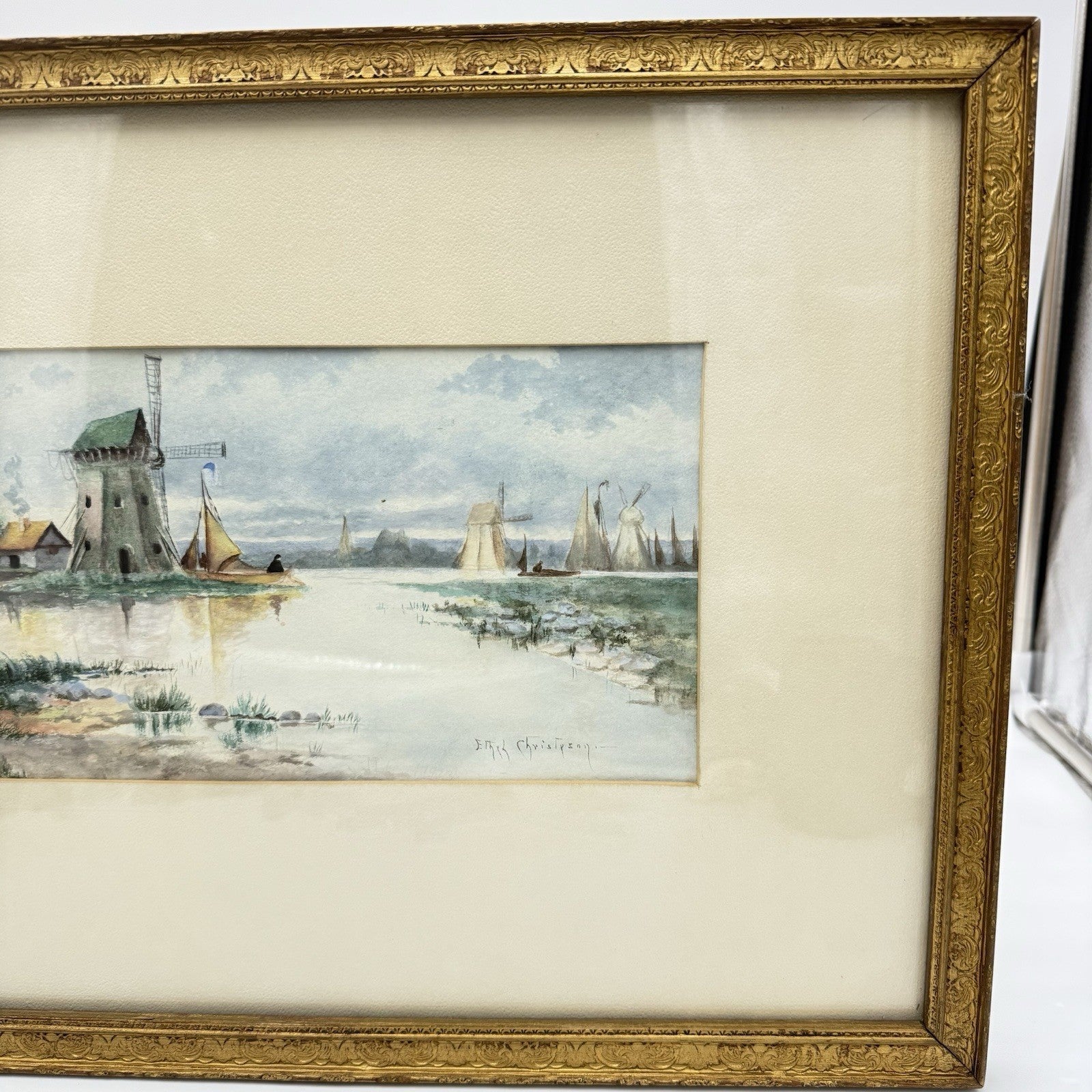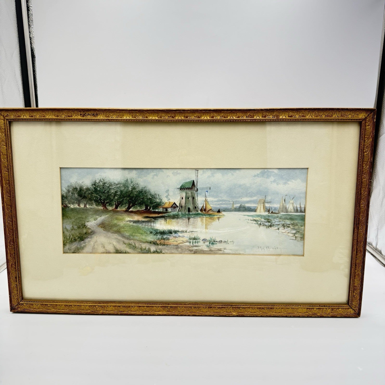 Dutch Scene Windmill & Boats Watercolor Painting signed Ethel Christpson Origin