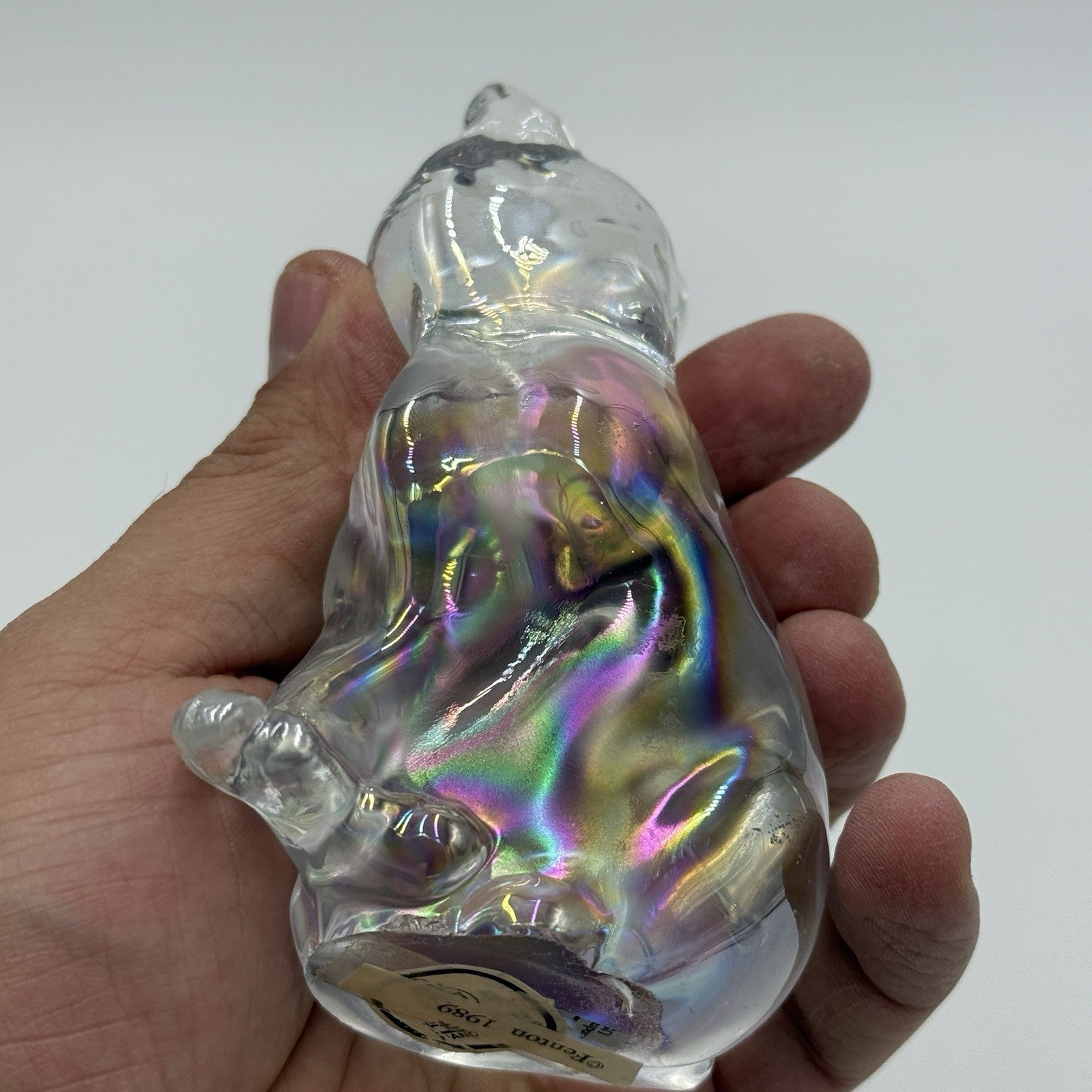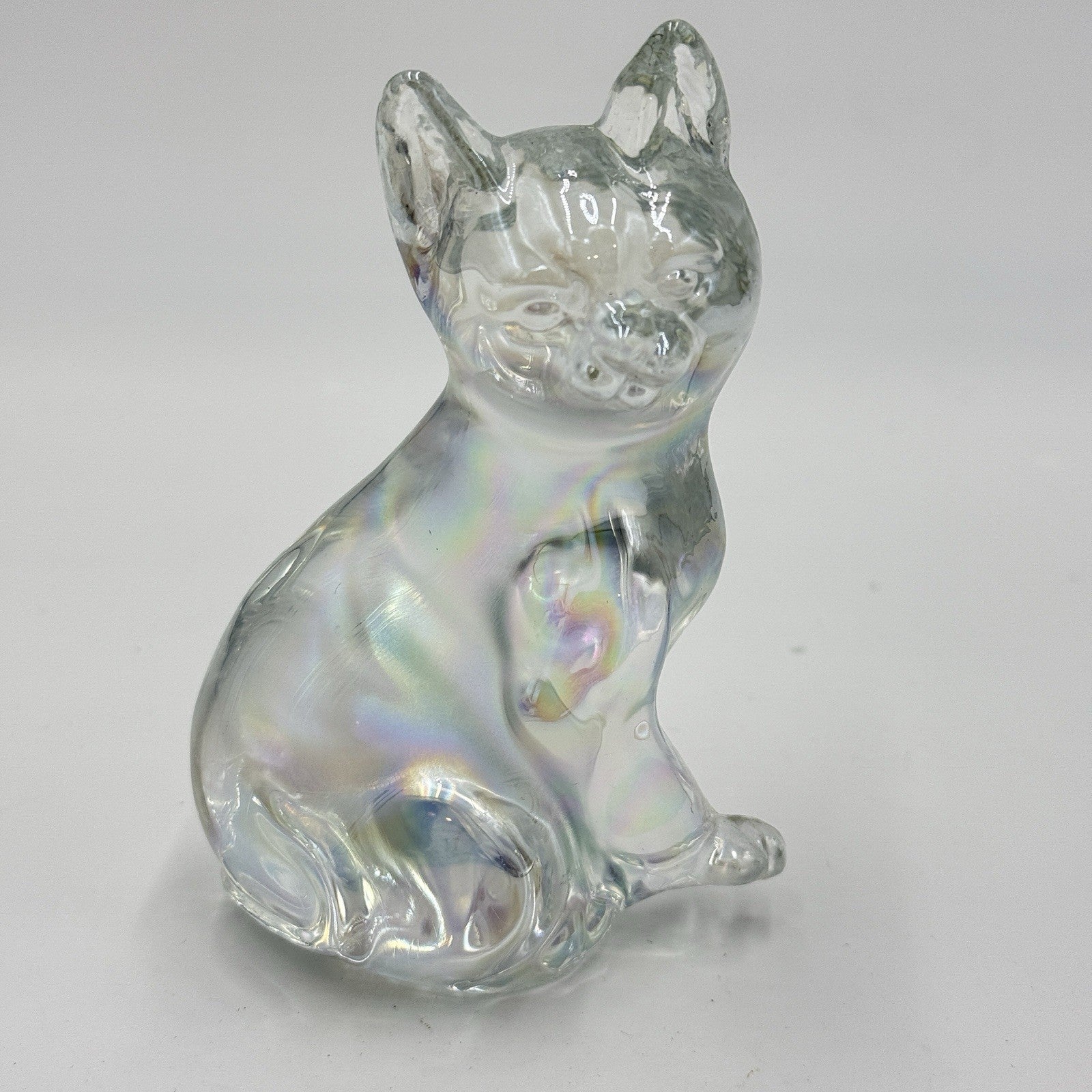 This beautiful Fenton figurine features a cute cat sitting in a paperweight shape. The iridescent and clear carnival glass material gives it a stunning 3D effect and decorative features that make it a perfect addition to any mid-century modern or cat-themed collection.