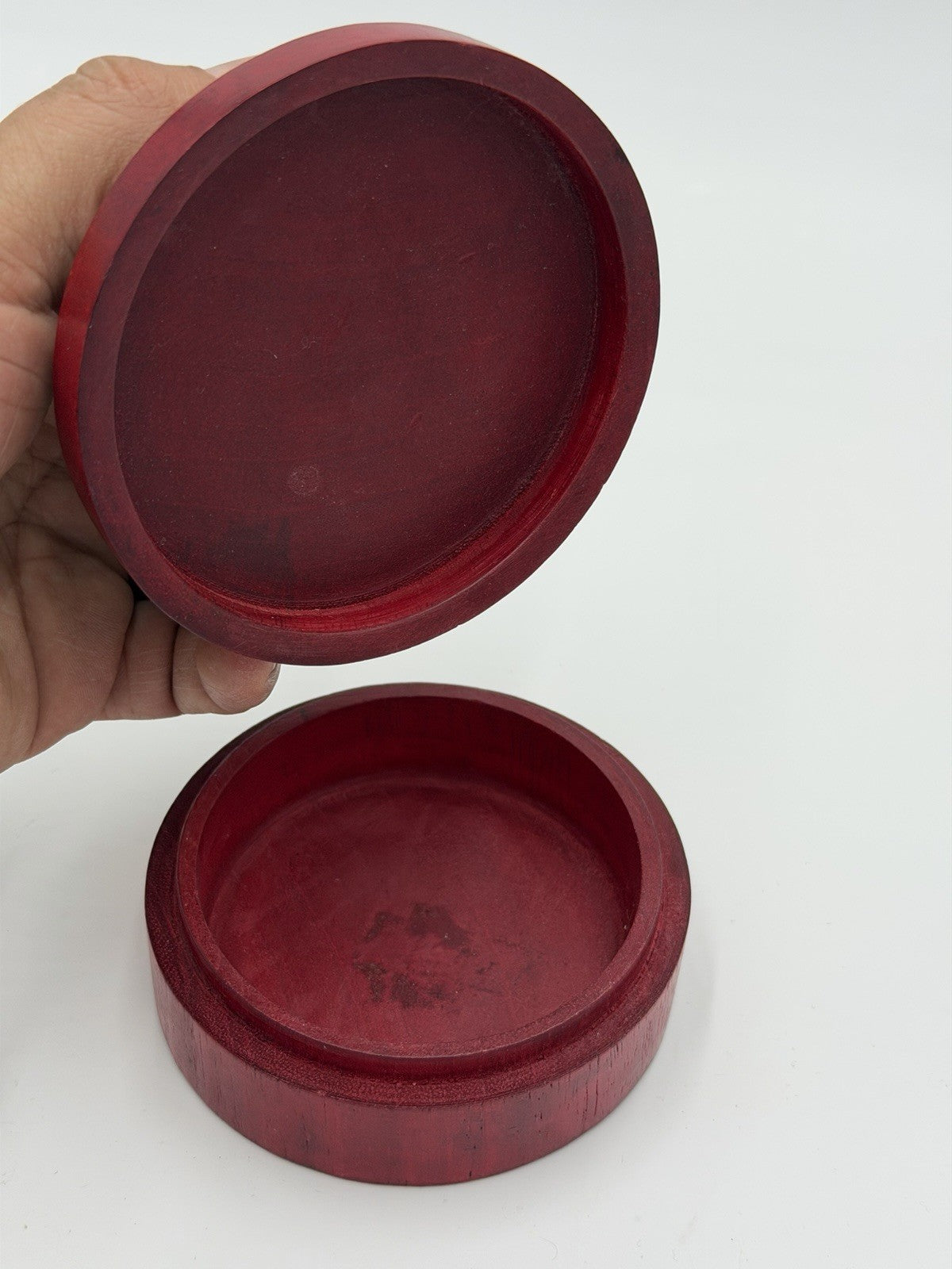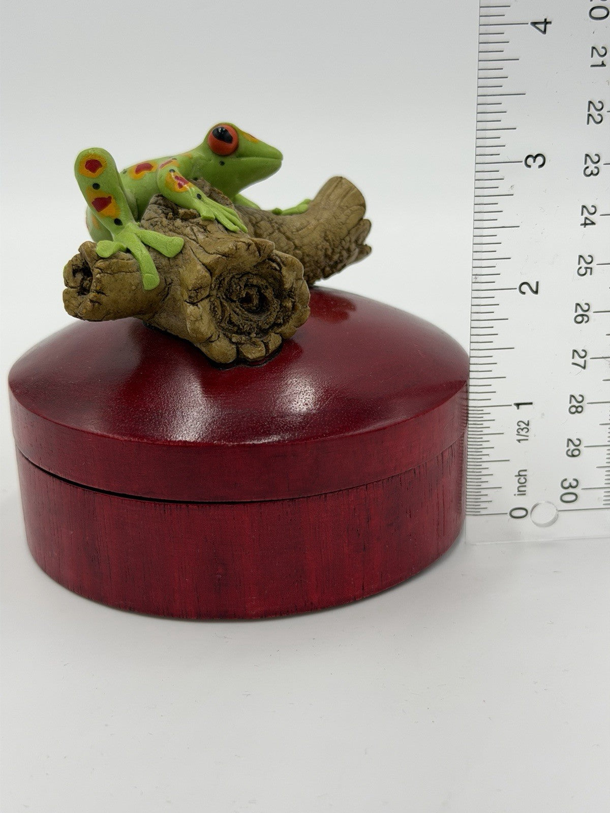 Folk Art Wood Trinket Box Green Tree Frog Resting on Log Round Jewelry Box