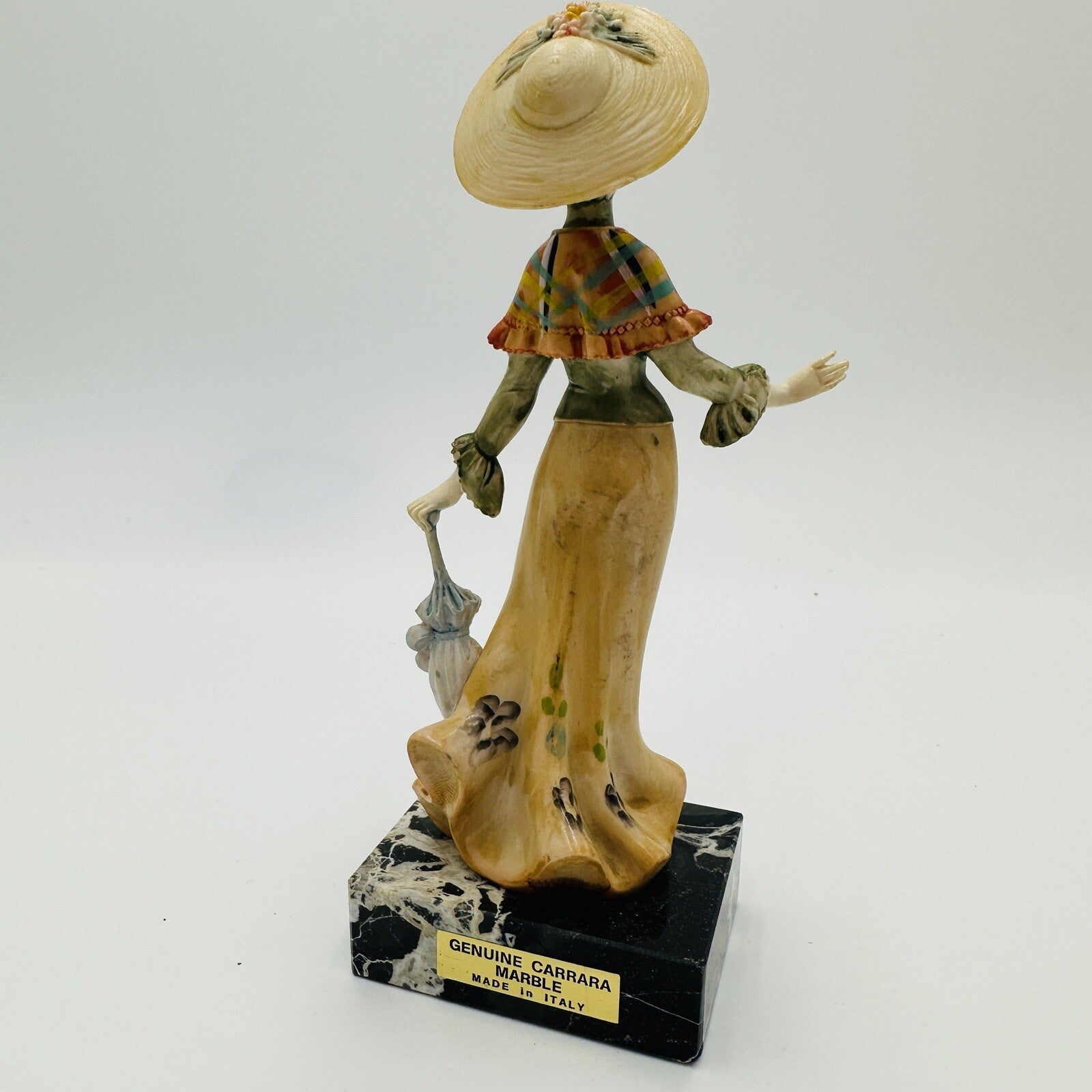 LADY WITH HAT HOLDING AN EMBRELLA, HAND PAINTED FIGURINE ON GENUINECARRARA MARBLE MADE IN ITALY