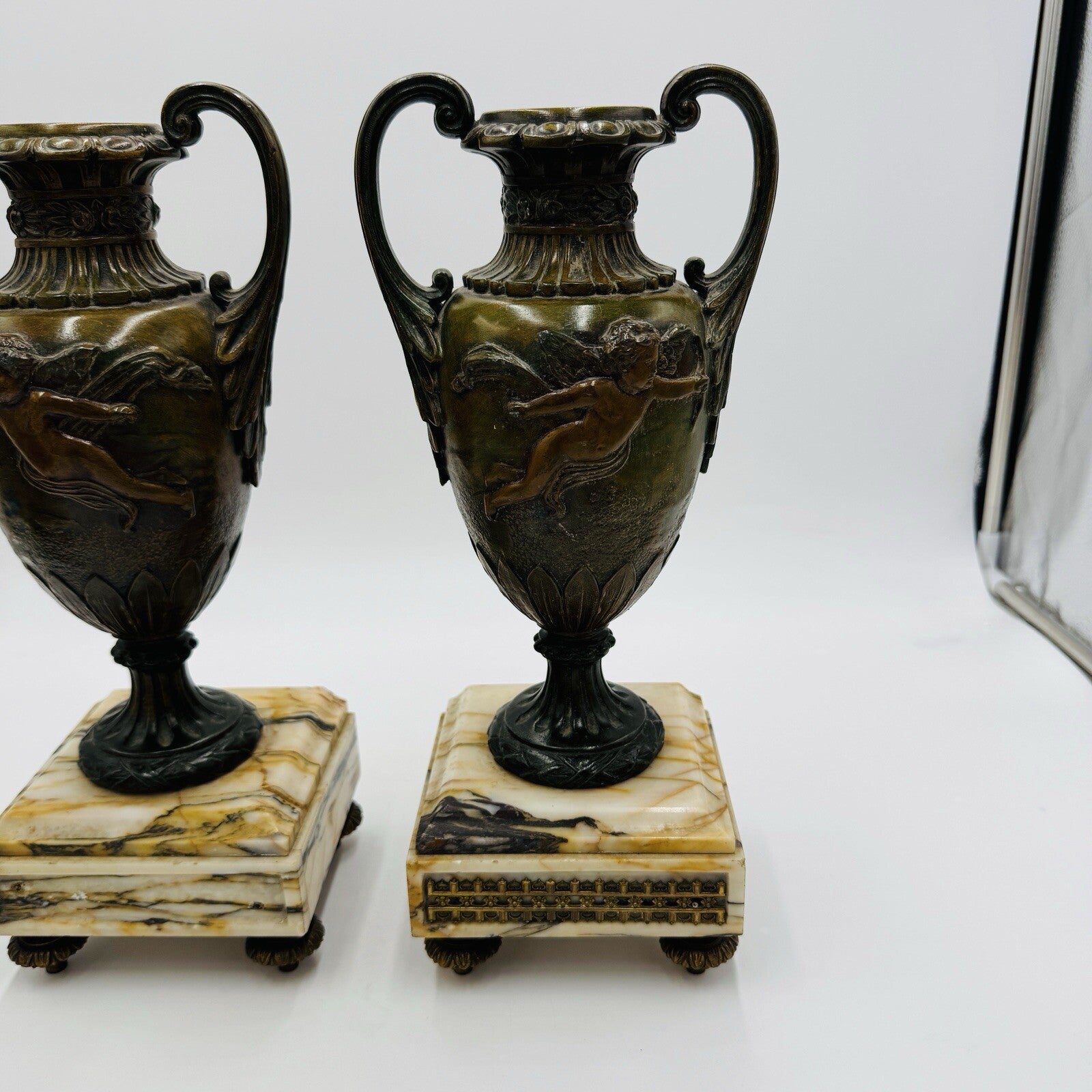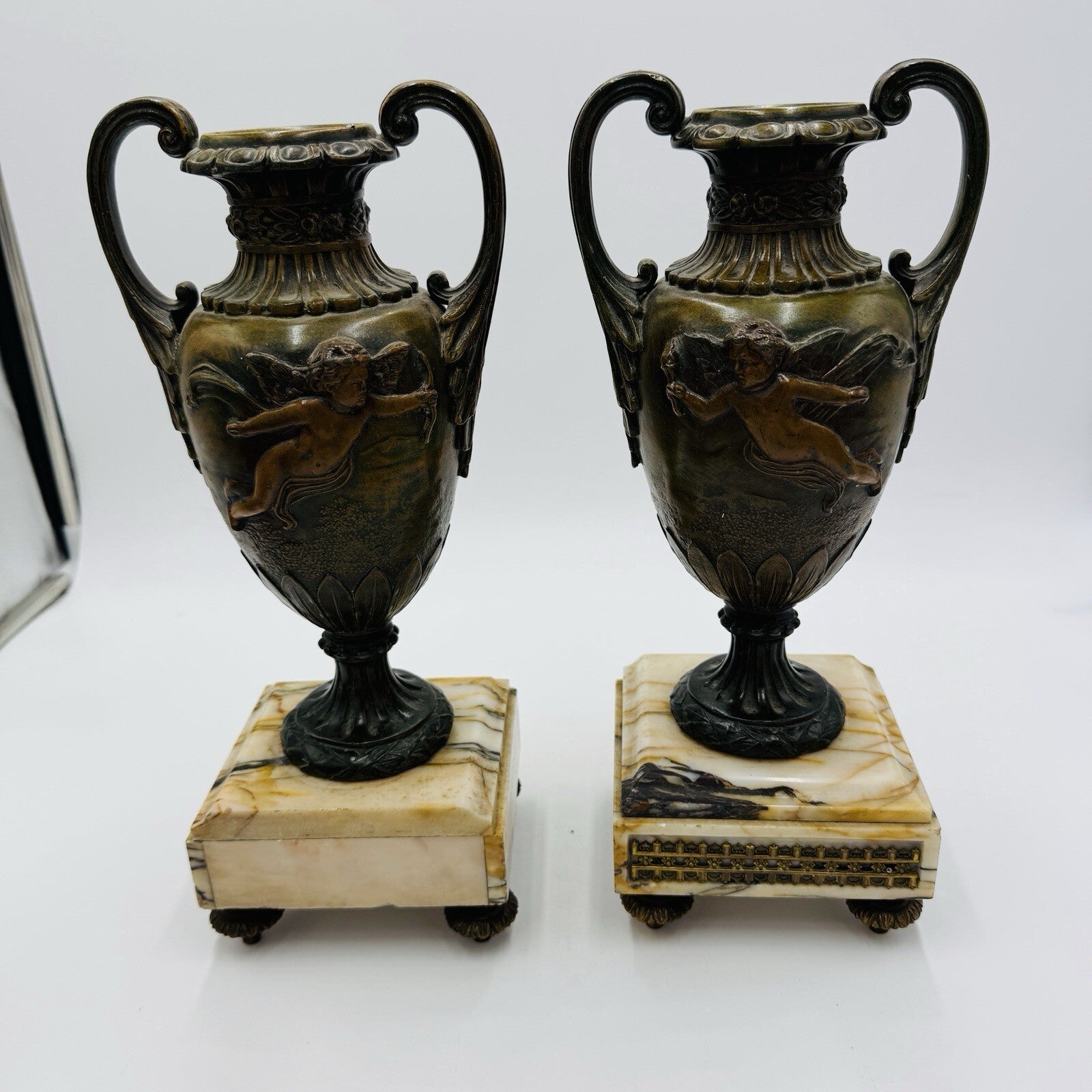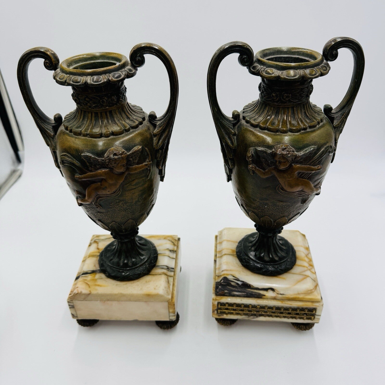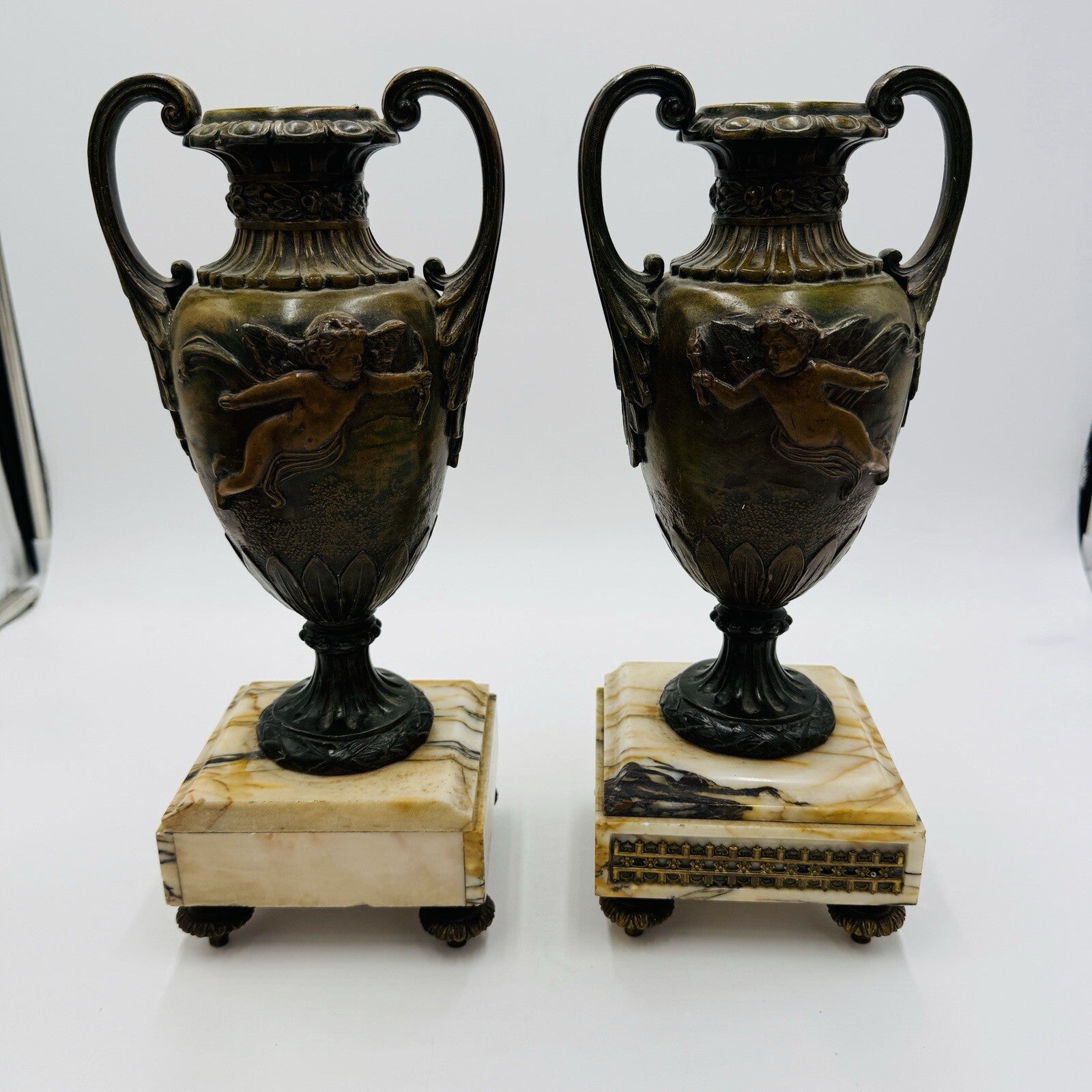 French metal vases rare 1800s Chateau ornate chimney cherubs marble base 13.5in