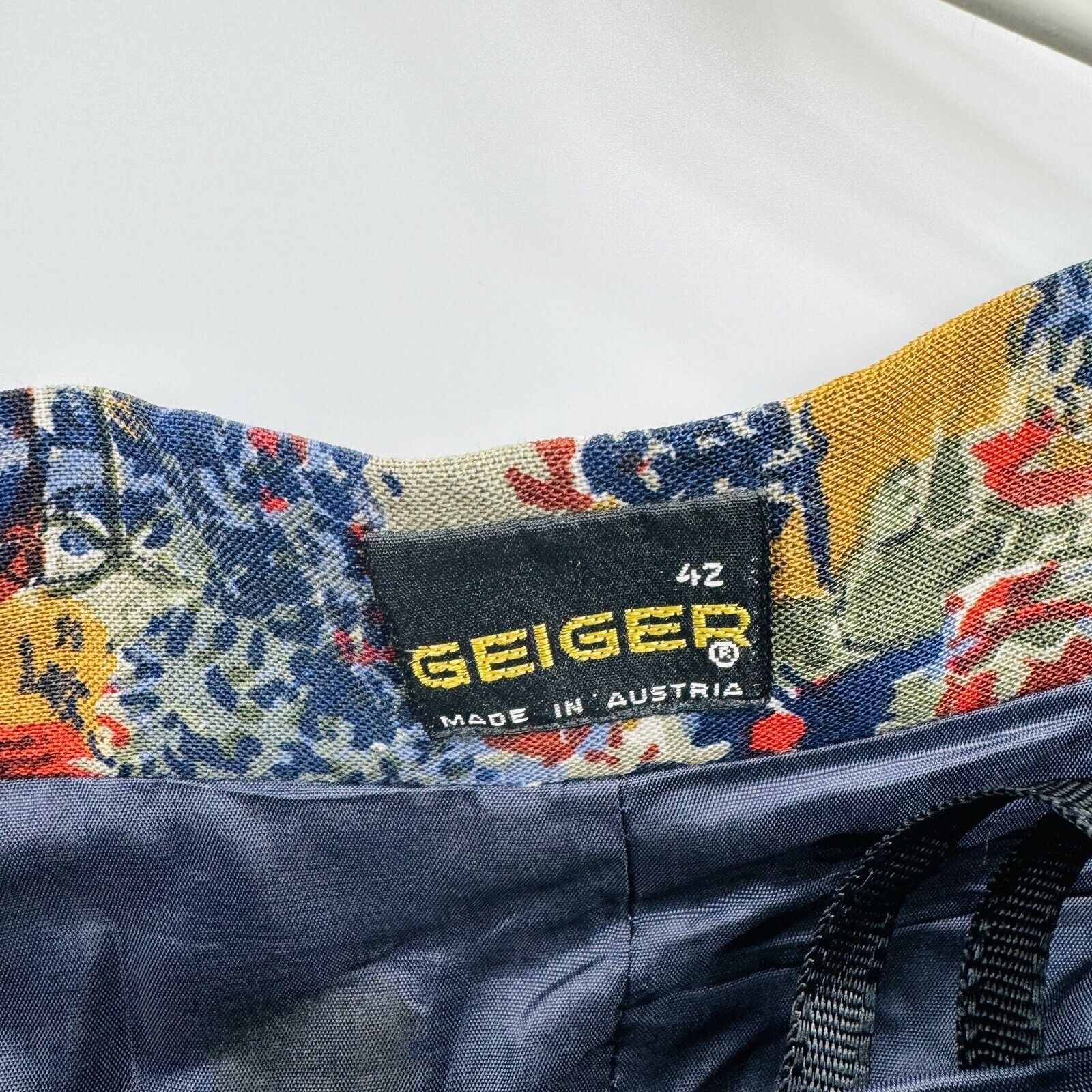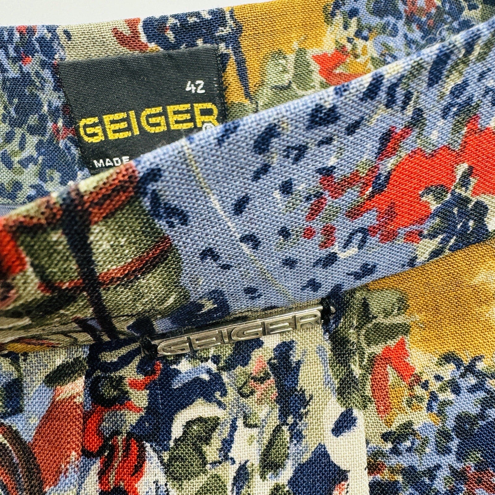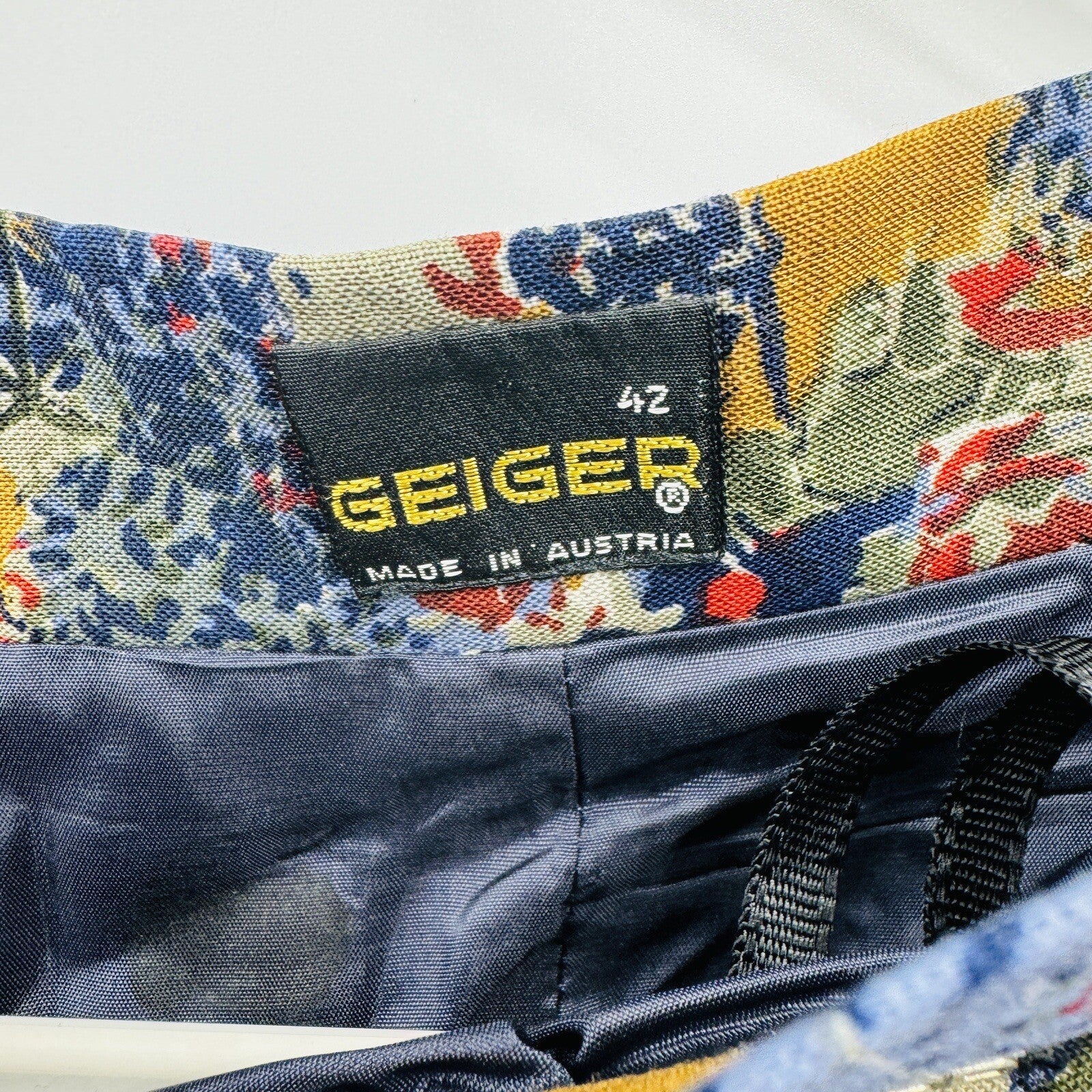 This vintage Geiger skirt is a beautiful addition to any wardrobe. The pleated print on pure wool fabric gives it a unique and timeless look. The skirt is handmade in Austria and features a zip closure, making it perfect for casual occasions.