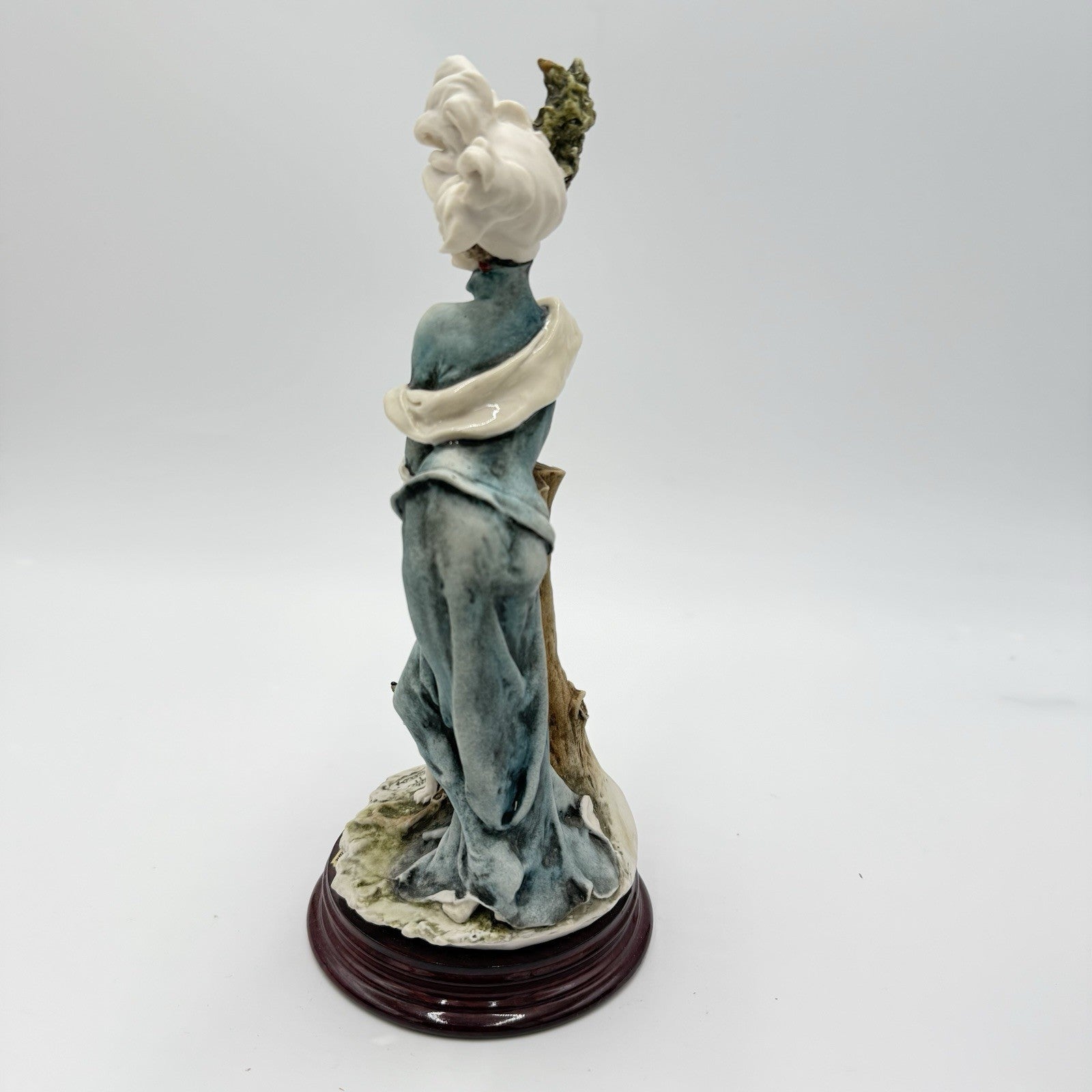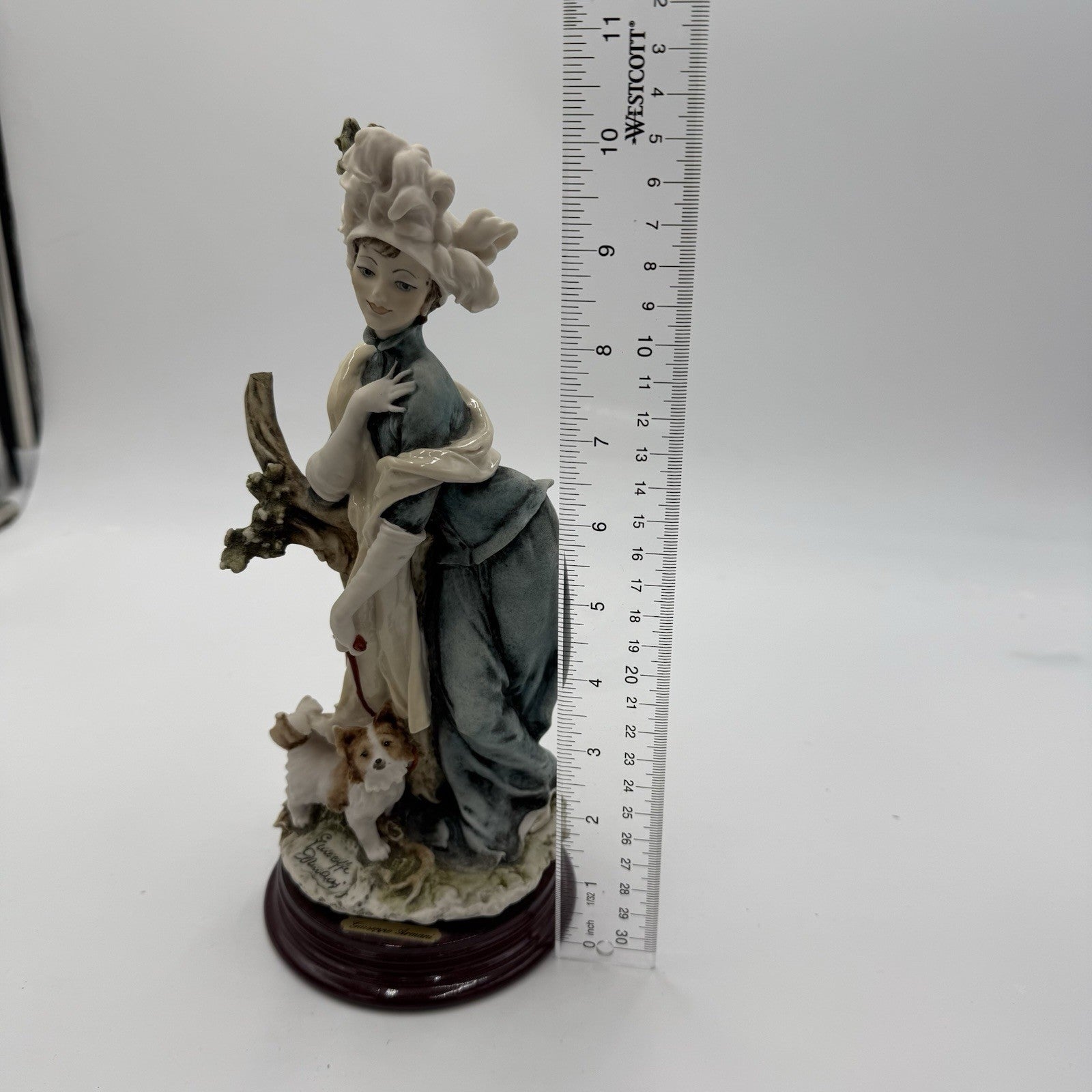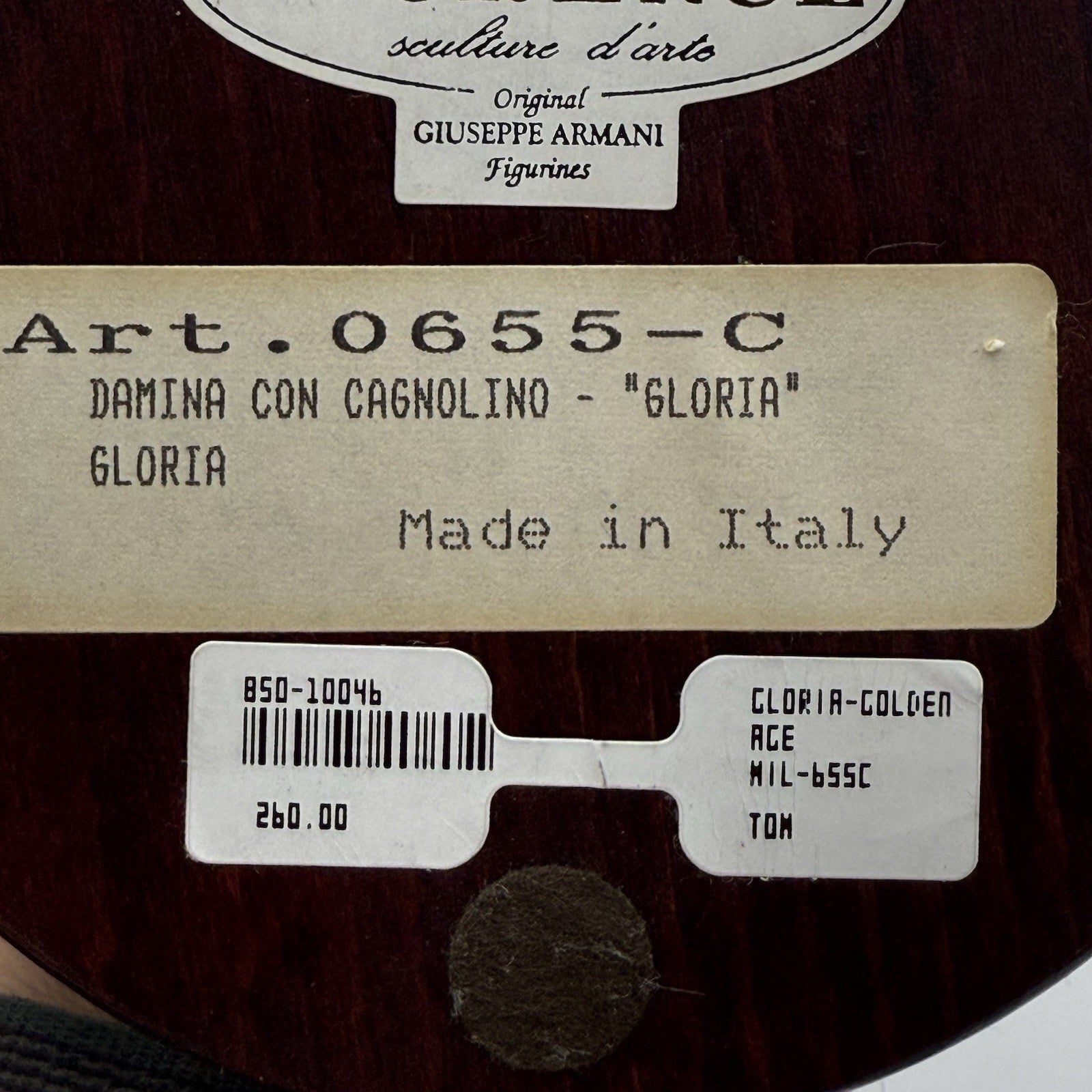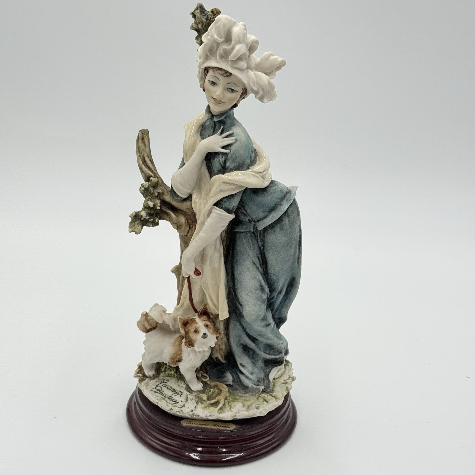 The Giuseppe Armani Italy Gloria With Little Dog Broken Branch Sculpture from 1993 is a medium-sized porcelain sculpture featuring a lady with a dog. Created by the artist Giuseppe Armani, this limited edition piece is signed and showcases intricate details in a multicolor finish. The sculpture captures a romantic theme with an Italian style, making it a timeless decorative collectible for any room in your home. Made in Italy, this original piece is a unique addition to any art collection, celebrating the beauty of people and their beloved pets.