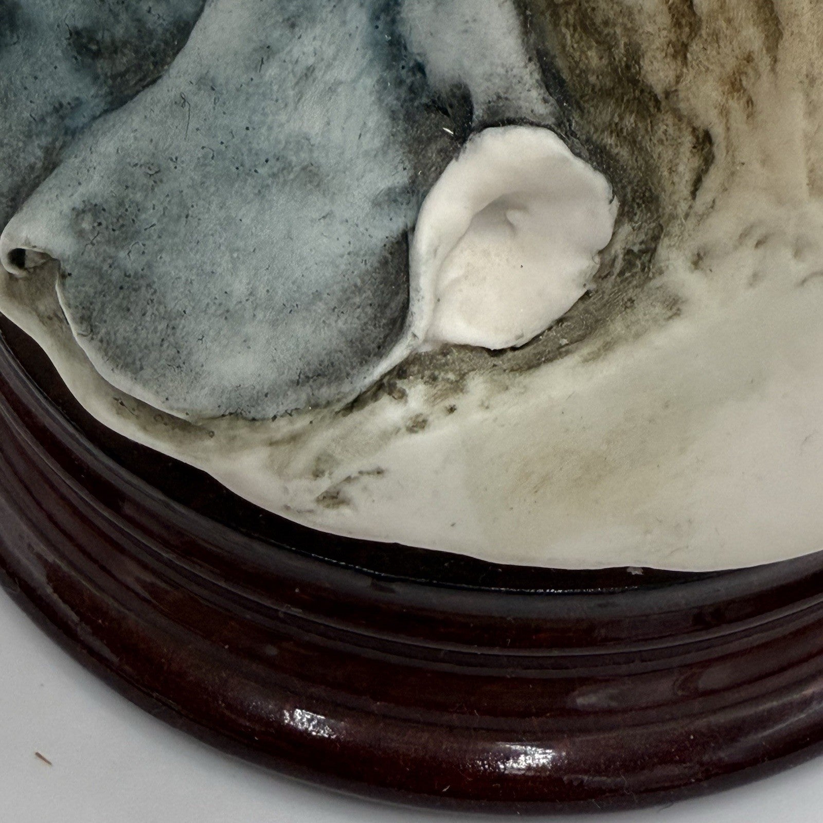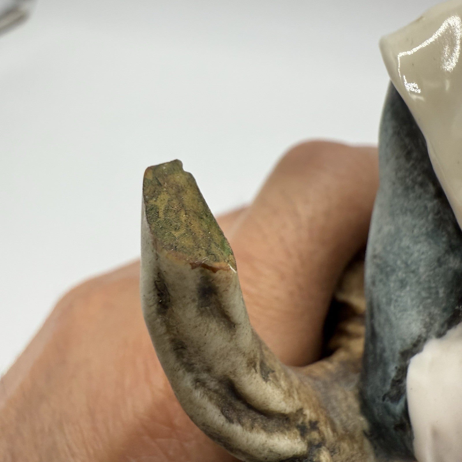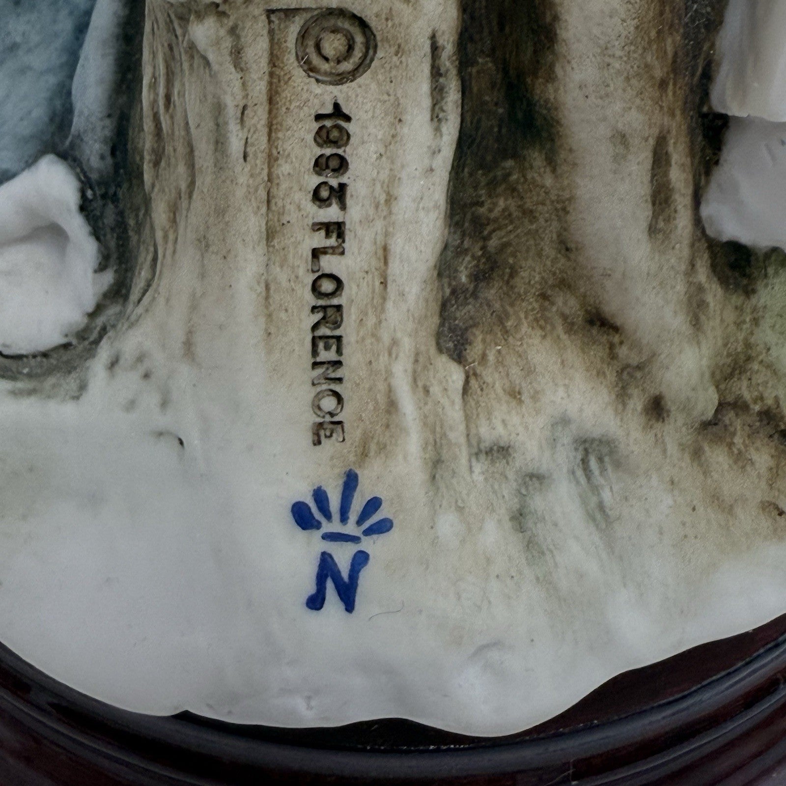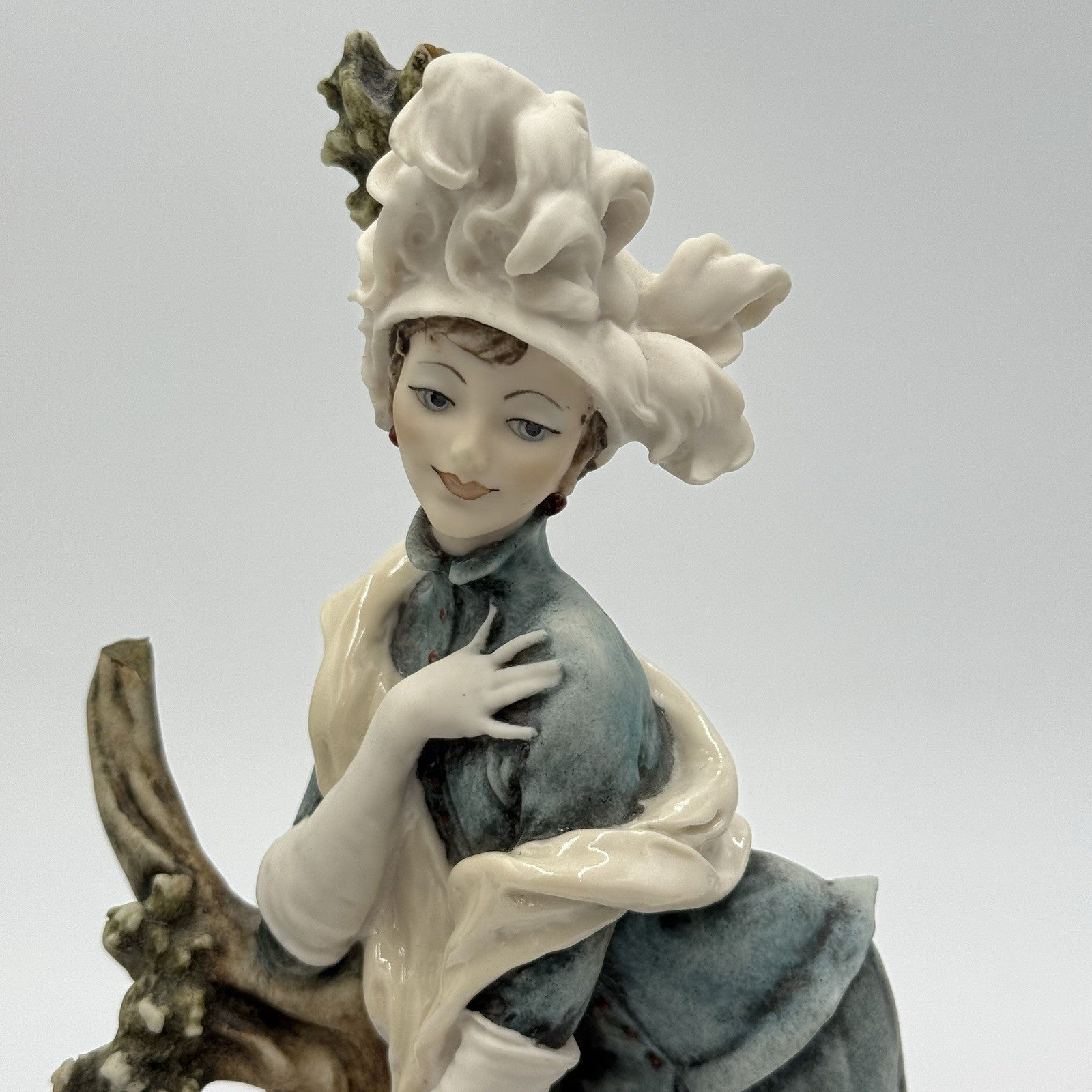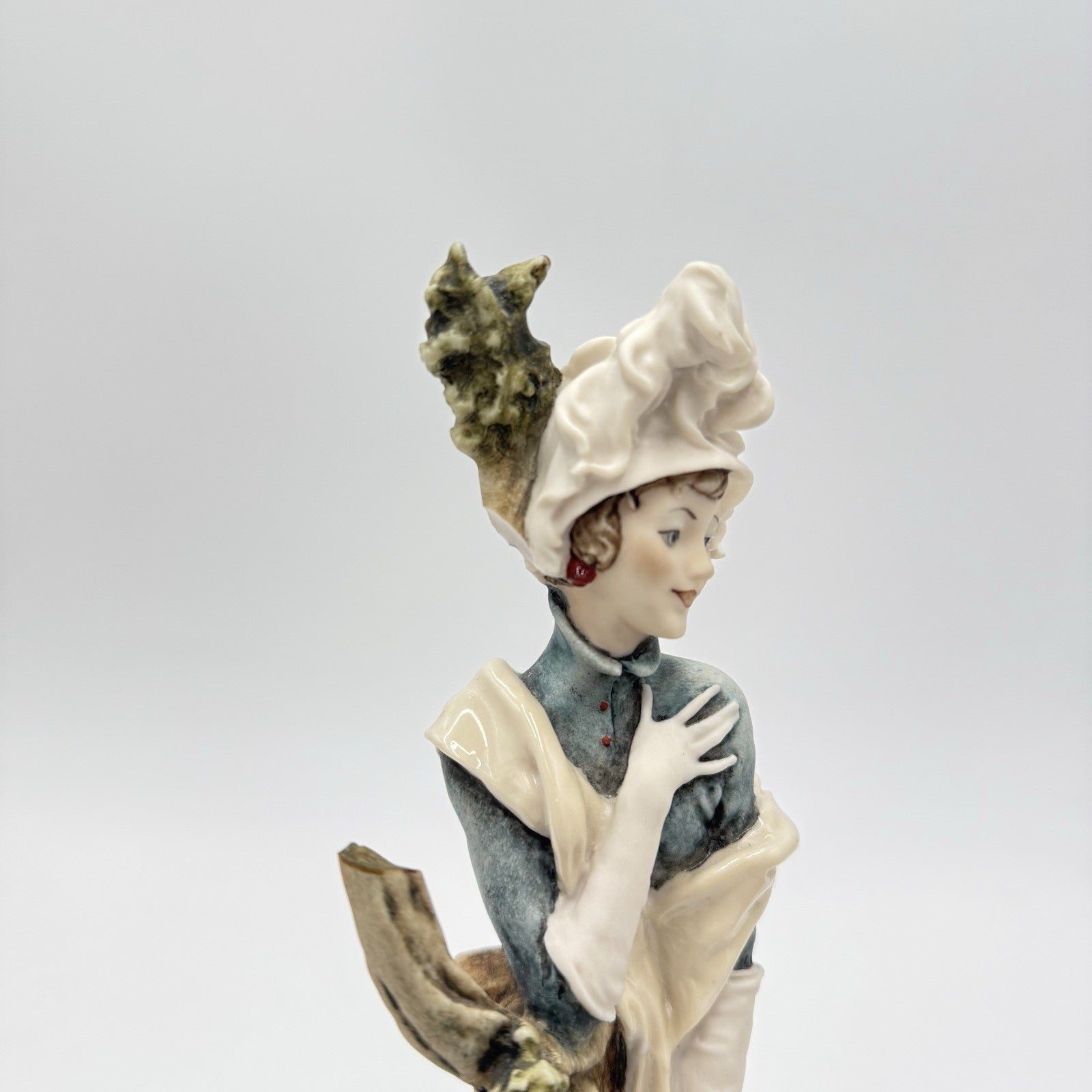 The Giuseppe Armani Italy Gloria With Little Dog Broken Branch Sculpture from 1993 is a medium-sized porcelain sculpture featuring a lady with a dog. Created by the artist Giuseppe Armani, this limited edition piece is signed and showcases intricate details in a multicolor finish. The sculpture captures a romantic theme with an Italian style, making it a timeless decorative collectible for any room in your home. Made in Italy, this original piece is a unique addition to any art collection, celebrating the beauty of people and their beloved pets.