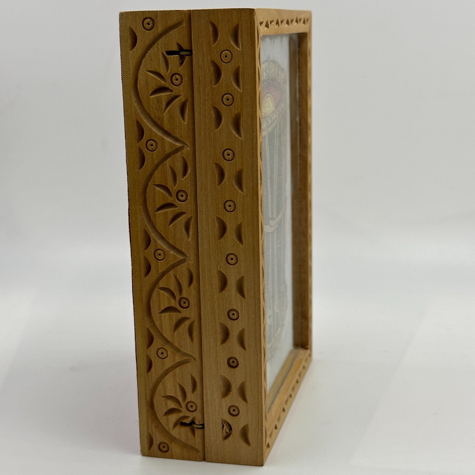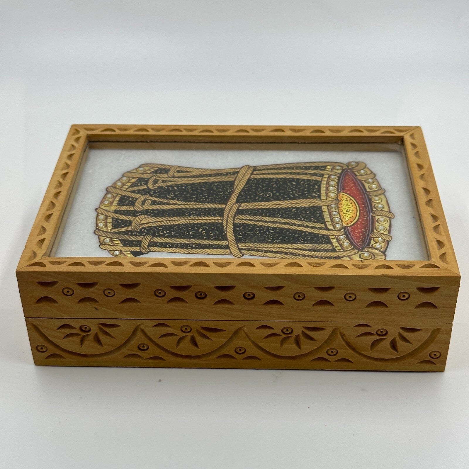 Carved Wooden Jewelry Box with The Nodding Head Dhol Drum on Lid Red Velvet.