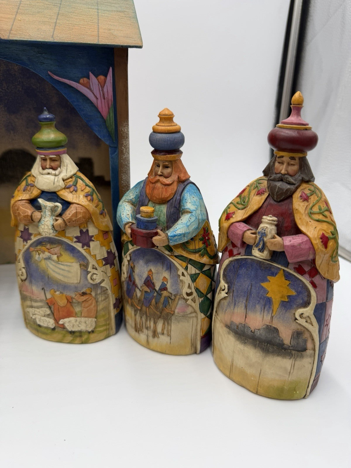 The Jim Shore Heartwood Creek 2003 Nativity 9 PCs set includes figures of Joseph, Jesus, Shepherd, Animals, Wise Men, and Stable, all beautifully crafted from wood and resin materials. Designed by artist Jim Shore, this medium-sized collectible set is part of a religious-themed collection perfect for Christmas. The multicolored Nativity set from 2003 features intricate details and is a vintage piece that will make a lovely addition to any holiday decor.