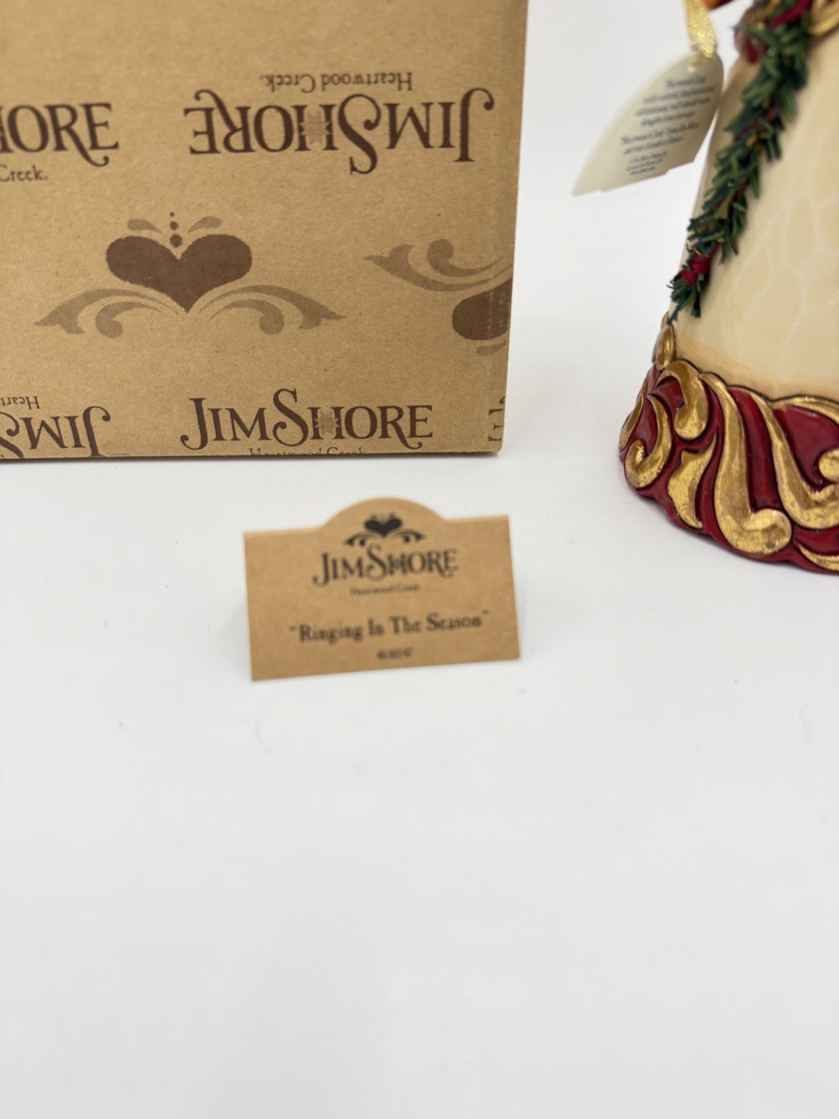 The Jim Shore Ringing in the Season Gold Rim Santa with Bell Christmas Figurine stands at 10 inches tall and features a multicolor resin design by artist Jim Shore. This collectible sculpture from the Jim Shore Heartwood Creek collection depicts Santa Claus with a bell, making it a festive addition for any room during the Christmas season. The brand's attention to detail and character capture make this figurine a unique and charming piece for adults who appreciate decorative collectibles. Crafted in 2012, this figurine comes in a box packaging and embodies the spirit of Christmas with its Santa-themed design.