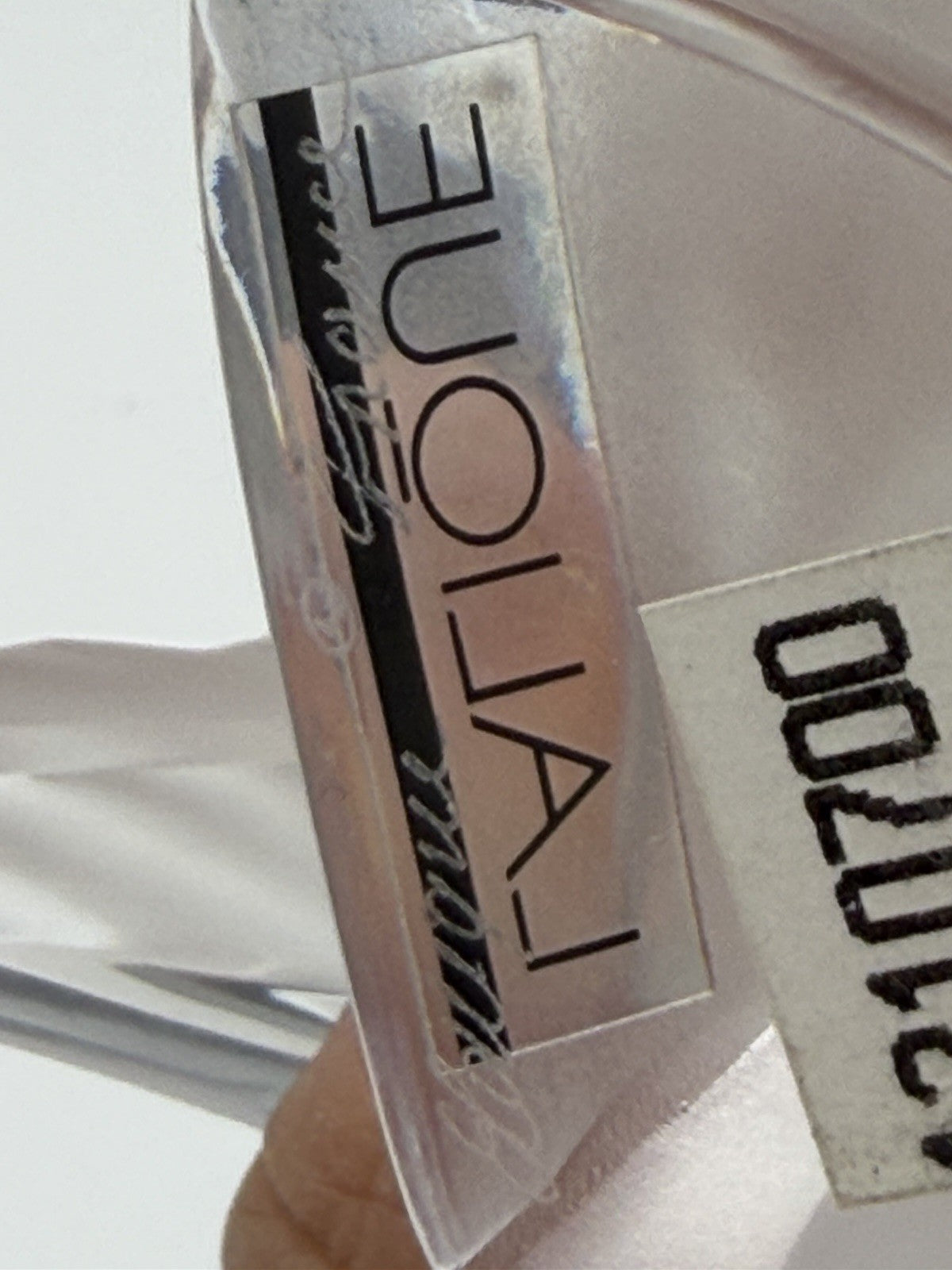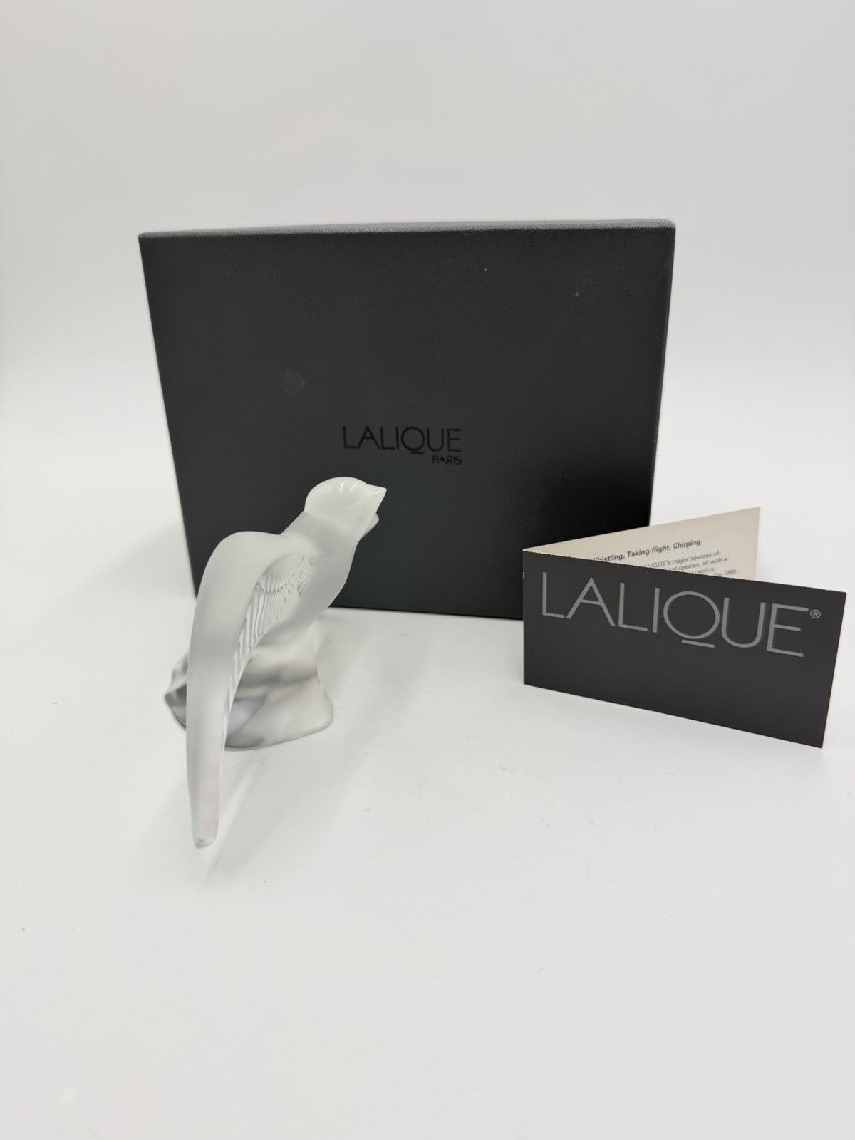 The Lalique Crystal France Paris Swallow Taking Flight Martinet Bird Frosted Figurine is a vintage sculpture made of clear crystal, featuring a solid pattern and a matte finish. Signed by Lalique France, this art glass piece depicts a swallow in flight, embodying the Art Deco style popular in the 1990s. The figurine comes in its original packaging from France, making it a unique and exquisite decorative item for any bird lover or collector of fine glassware. Standing at 5.25 inches tall and 4.25 inches long, this delicate sculpture is a true testament to the craftsmanship and elegance of Lalique Crystal.