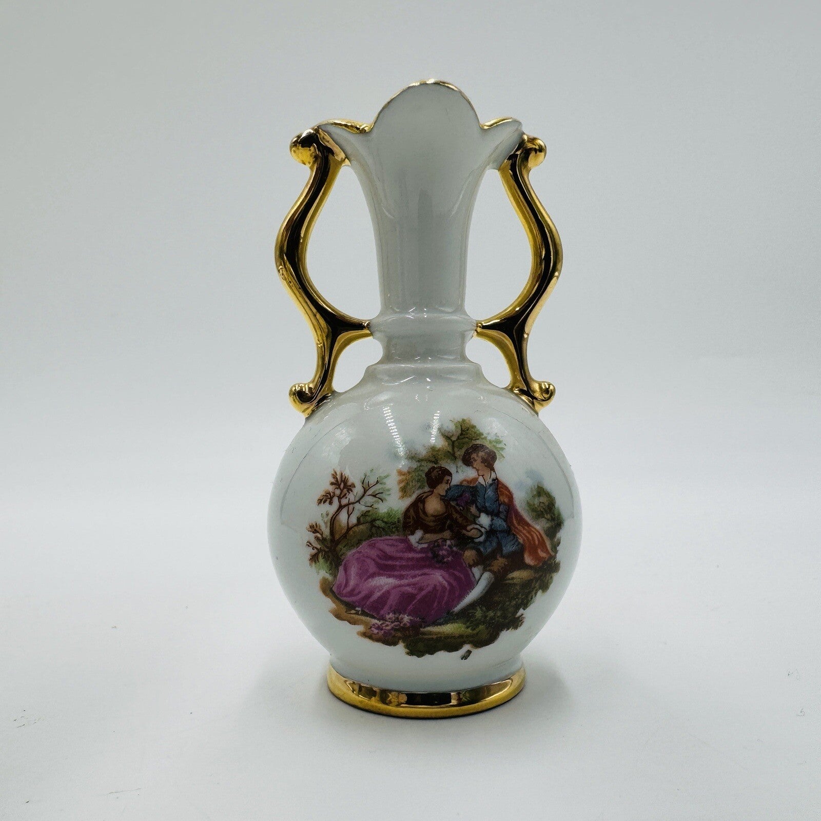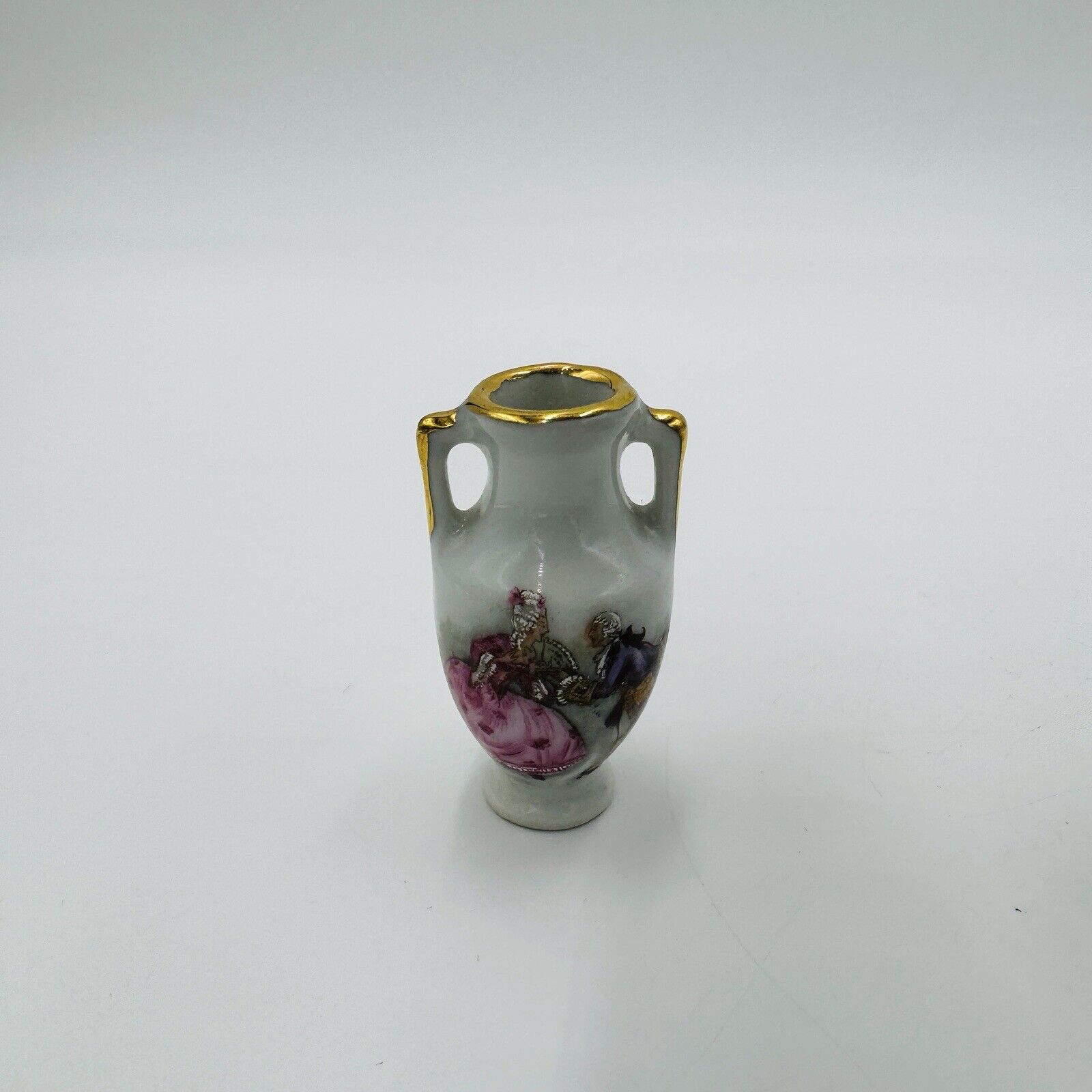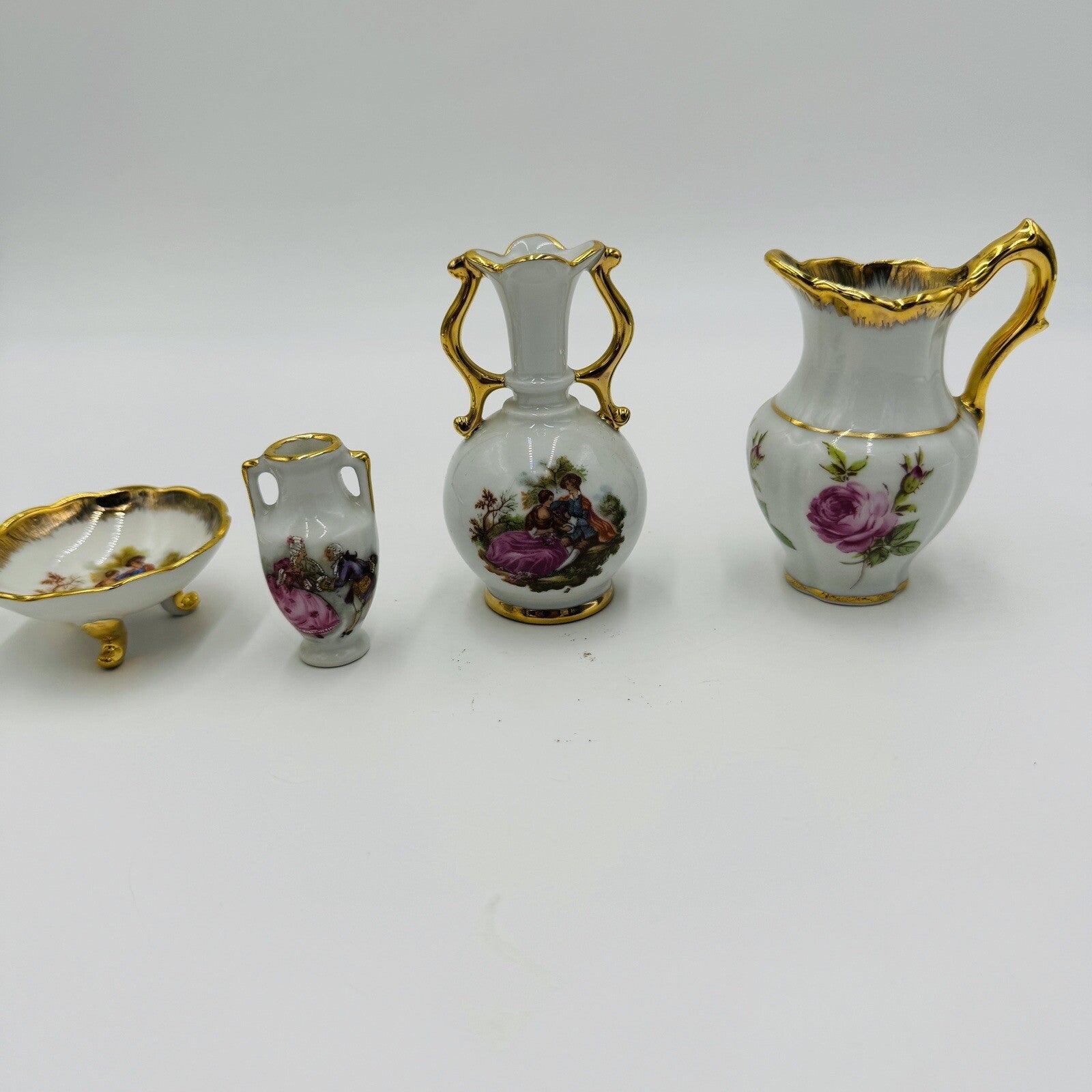 This is a set of 4 miniature vases made of porcelain by Limoges, France. The vases are painted with a romantic scene and floral pattern in multicolor. They are abstract in shape and have a French style. The set is an original from the 1950s and comes with four pieces, including a vase, urn, and bowl. The vases are small, measuring 1", 2", and 3" in height.