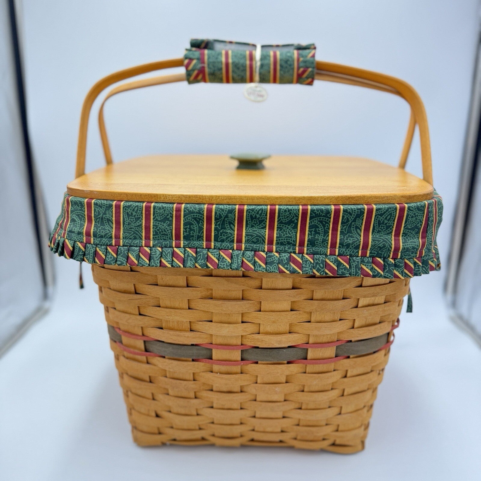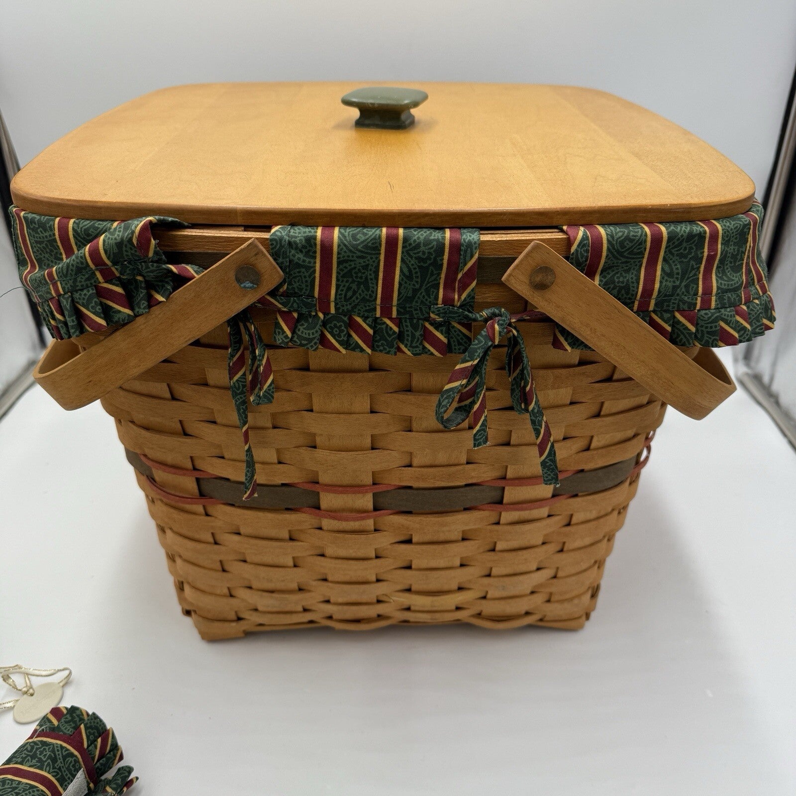This beautiful Longaberger basket set is a must-have for any collector or lover of handwoven baskets. Made from high-quality hardwood maple, this square-shaped basket features a natural finish and is adorned with a green color that is perfect for the holiday season. The basket measures 12 inches in height and 13 inches in width, making it a large and sturdy piece that can be used for all occasions.