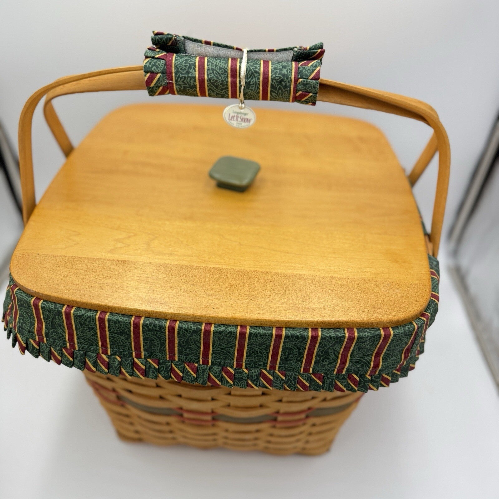 The basket comes with a lid and handle, making it easy to store and transport. It is also engraved with the Longaberger brand name and features a woven pattern that is both elegant and unique. Whether you're looking for a Christmas gift or simply want to add to your collection, this 9th edition Holiday Hostess Evergreen Basket Set is a perfect choice.