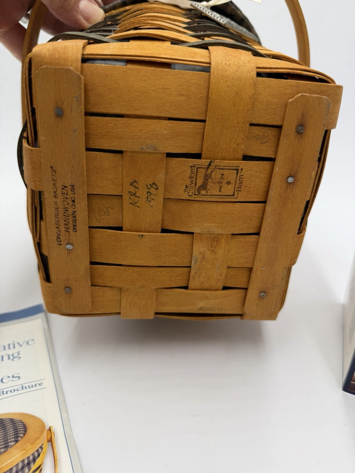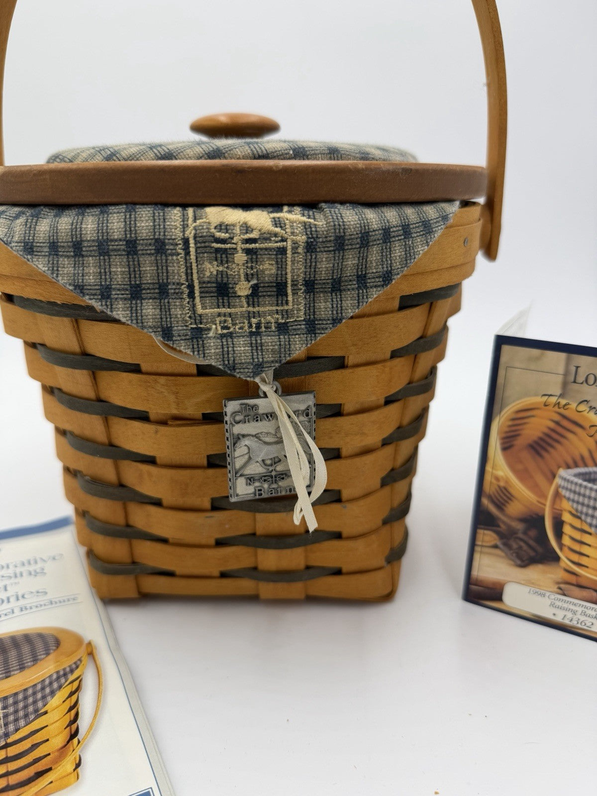 The Longaberger Crawford Barn Raising Basket is a vintage collectible round basket with a tie-on liner protector lid. Handmade in the United States in 1998, this multicolor basket features a wood-finished surface, measuring 8" in diameter and 6 1/2" in height (not counting the handle). Perfect for all occasions, this original piece from the late 20th century exudes quality craftsmanship and timeless charm, making it a cherished addition to any decor collection.