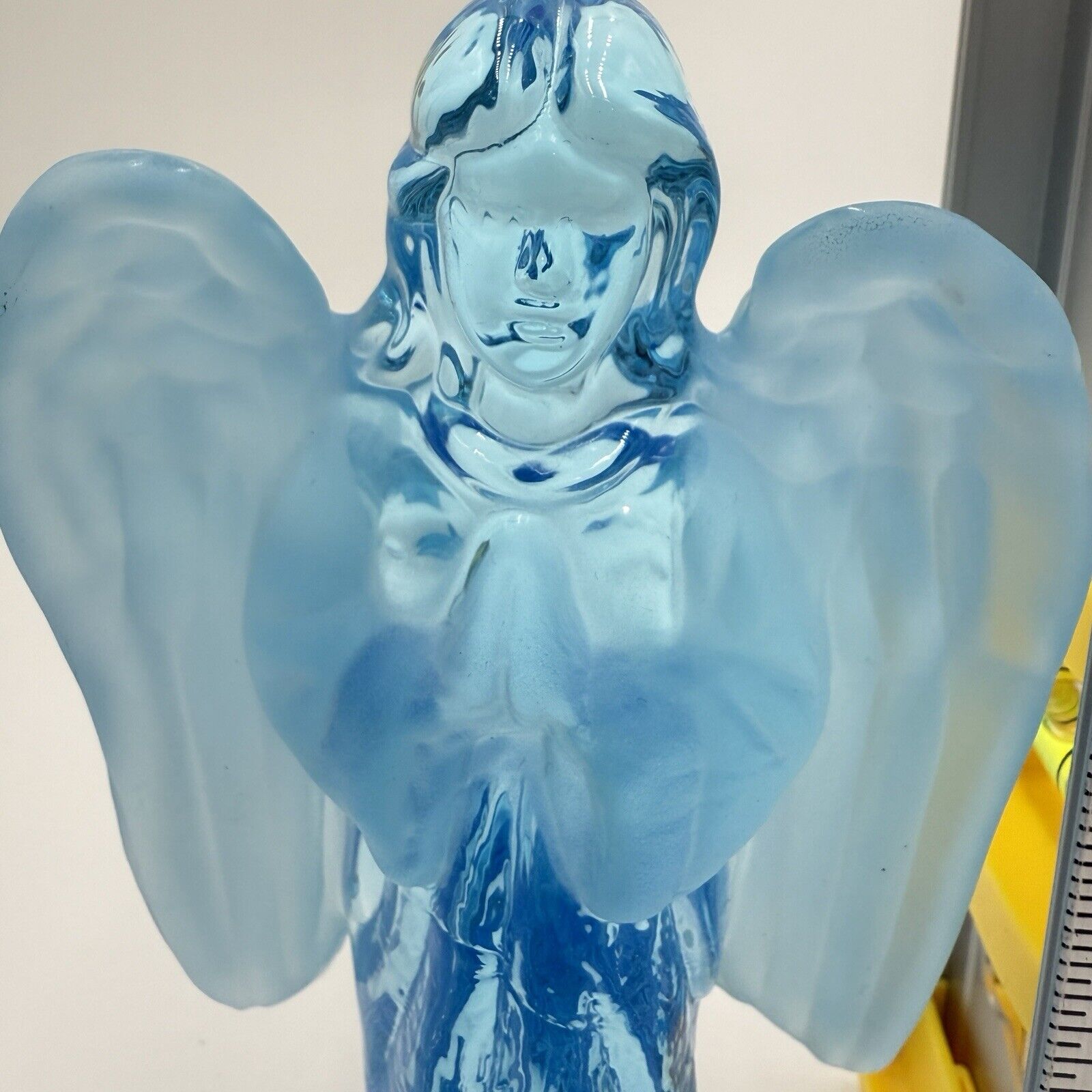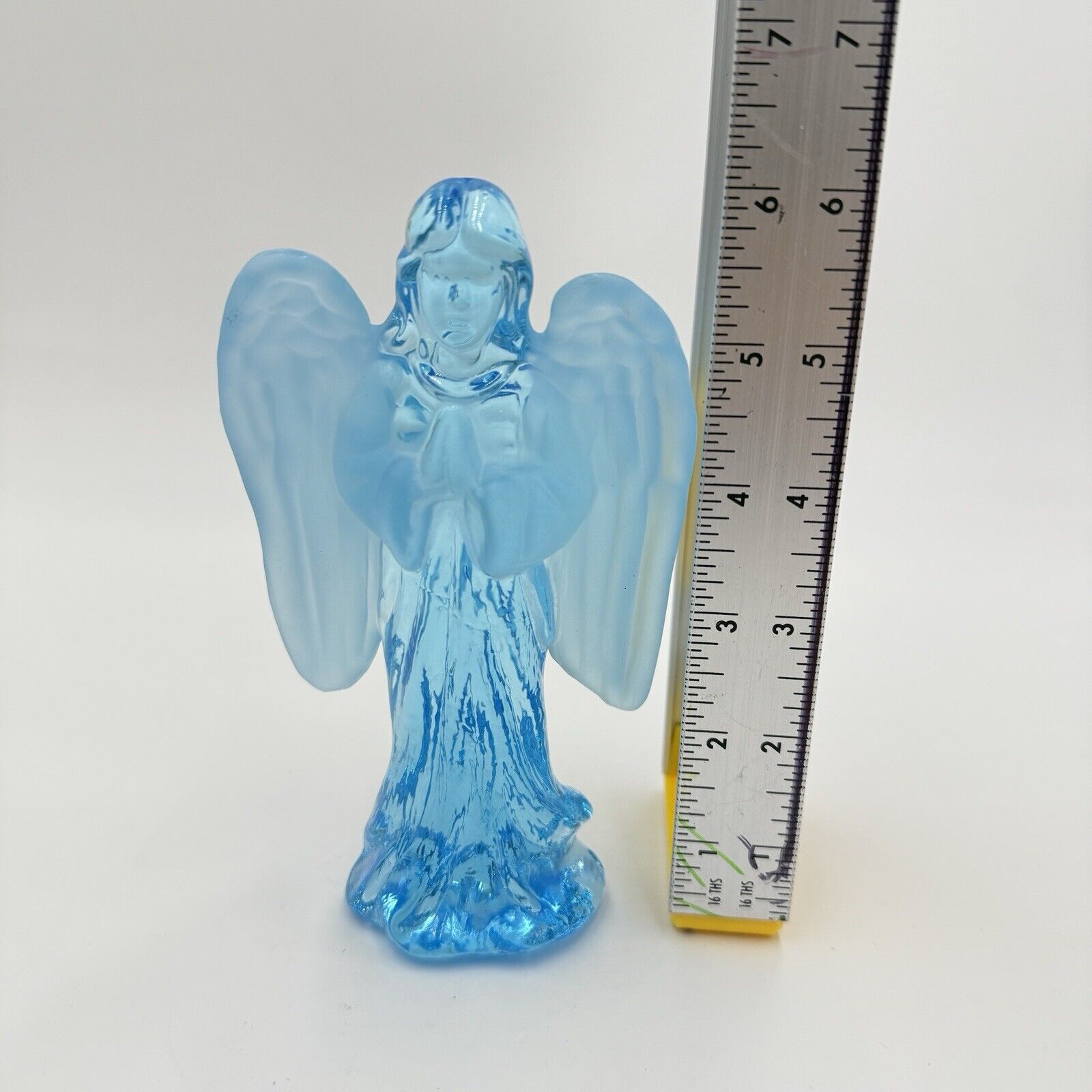 This Mid-Century Modern art glass figurine features a solid blue color with frosted two tones. Standing at 6 inches tall, the angel figurine is made of glass with a glossy finish. It is a vintage decorative piece that showcases European production style and is unmarked by a specific brand.