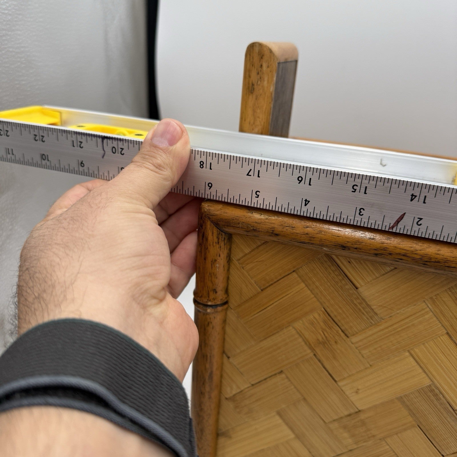 Elevate your living room with this stunning MCM bamboo and brass accents wicker weave rattan magazine rack. The natural color and vintage/retro style make it a perfect addition to your home decor. The rack is made of high-quality rattan, wicker, and bamboo materials and has a lacquered finish that adds to its elegance.