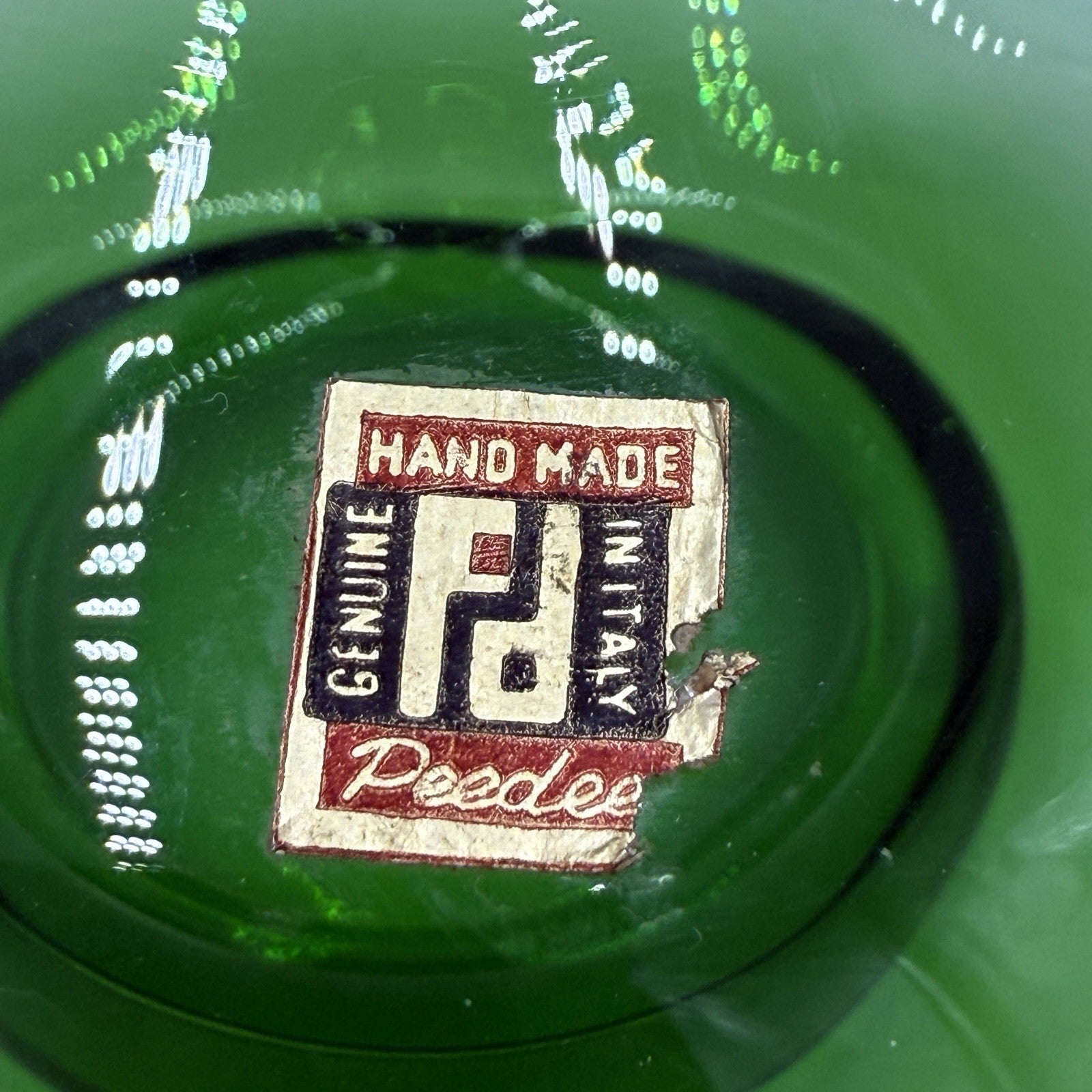 This MCM Peedee Art Glass Green Decanter from Italy is a stunning piece of vintage drinkware that will impress your guests. Measuring at 7 inches in height, it comes with a glossy finish and a beautiful green color that is perfect for any occasion. The decanter is made of high-quality glass and features a unique design that is characteristic of Mid-Century Modern style.