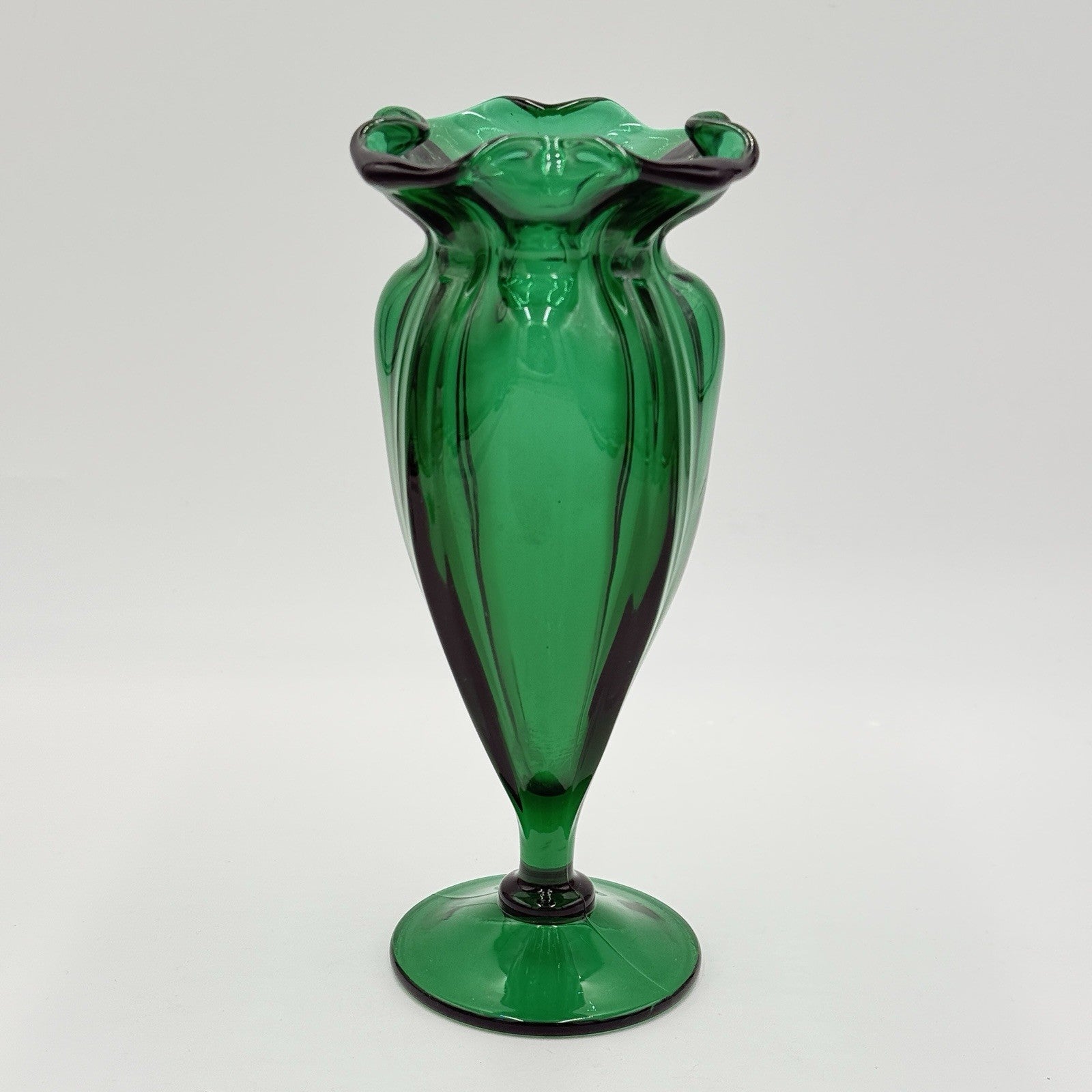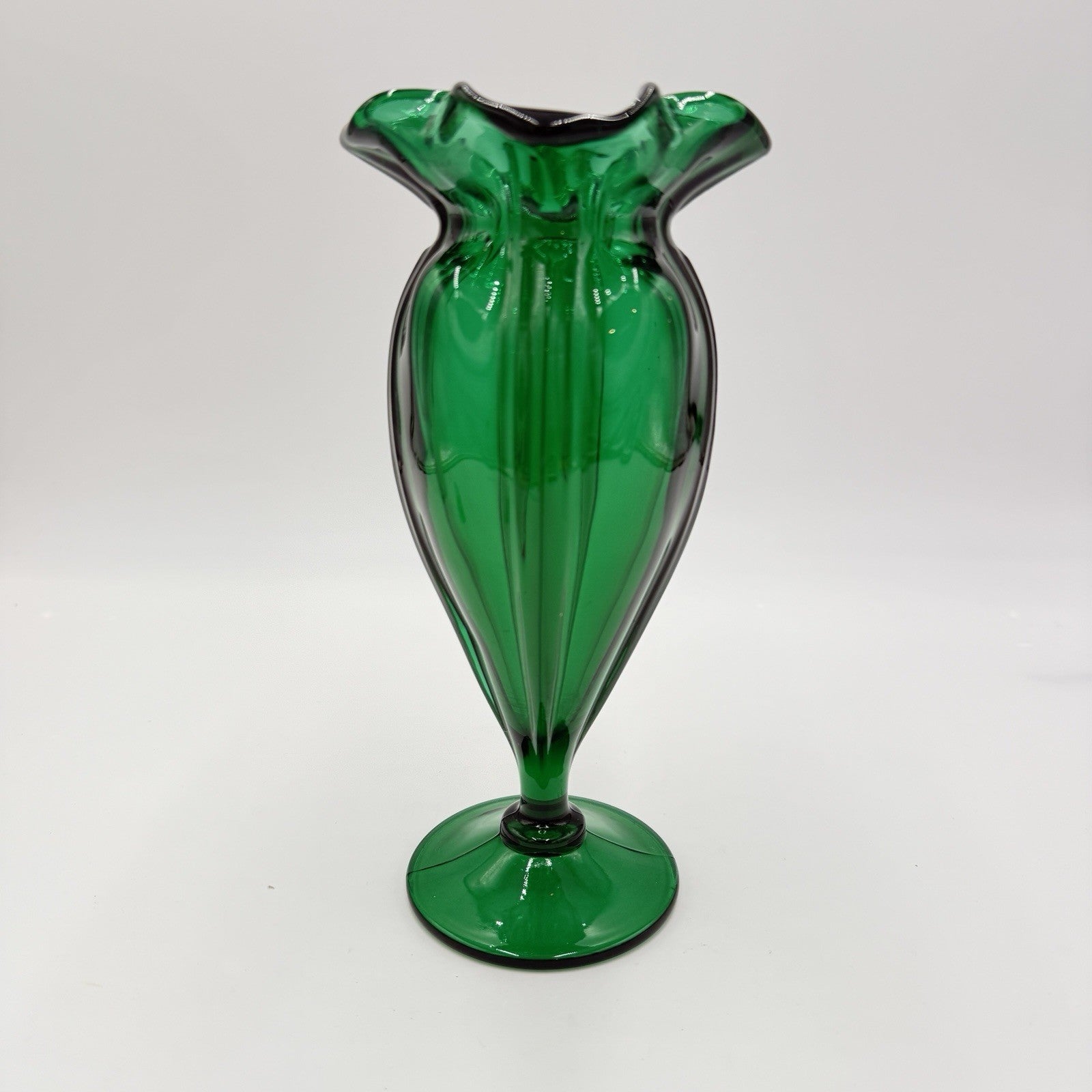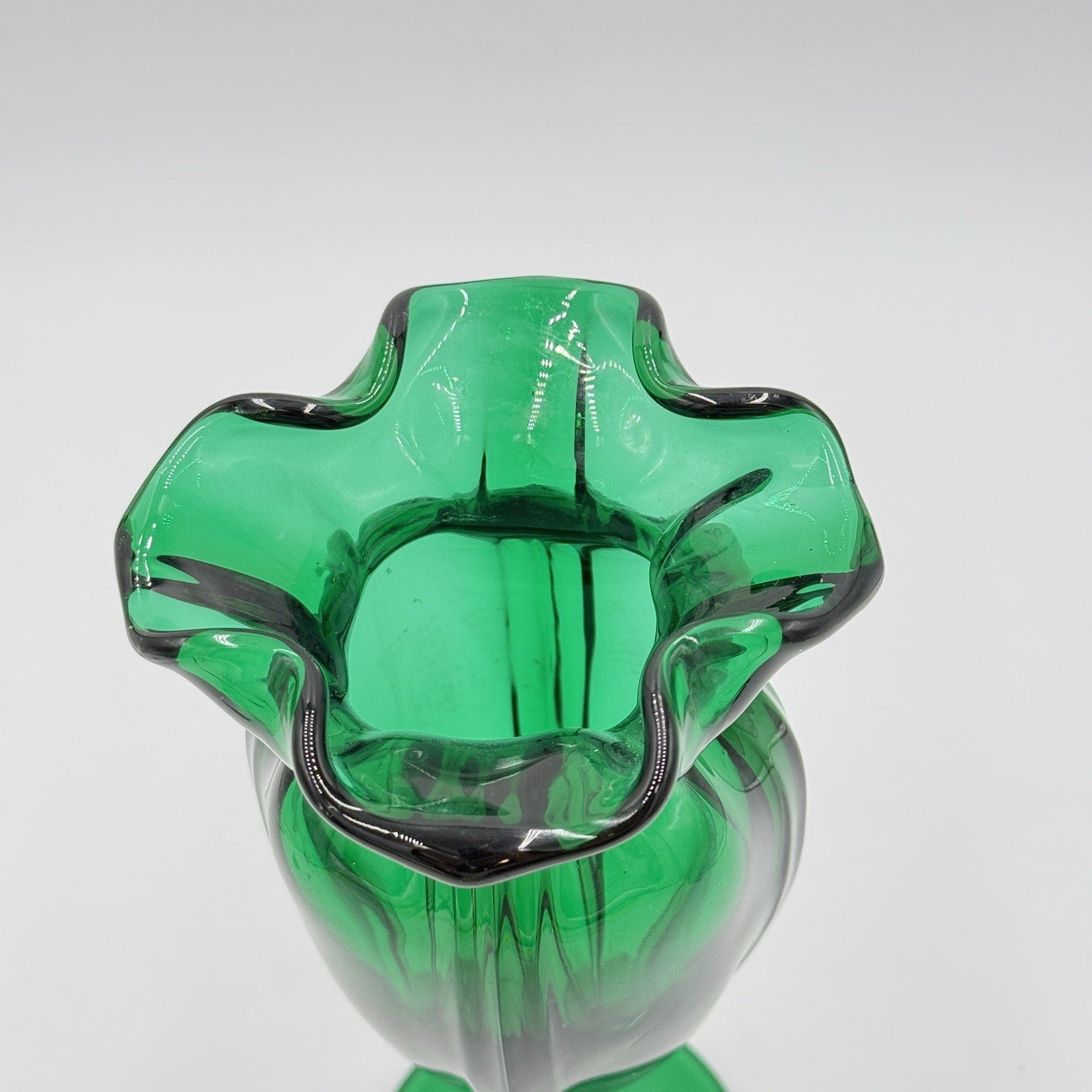 MCM Wayne Husted Stelvia emerald green art glass ruffled compote Vase 9.5”
