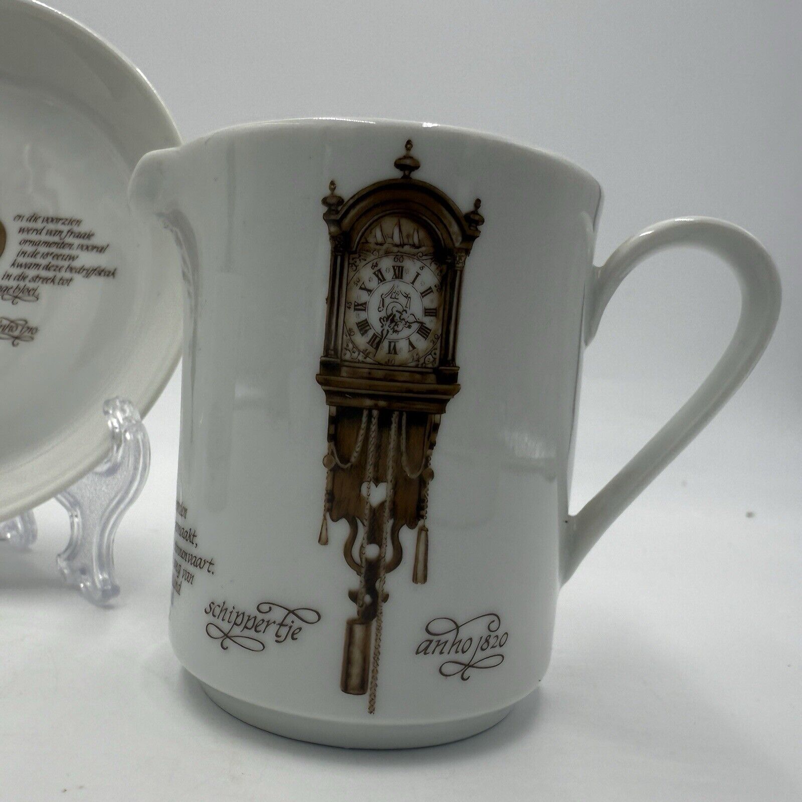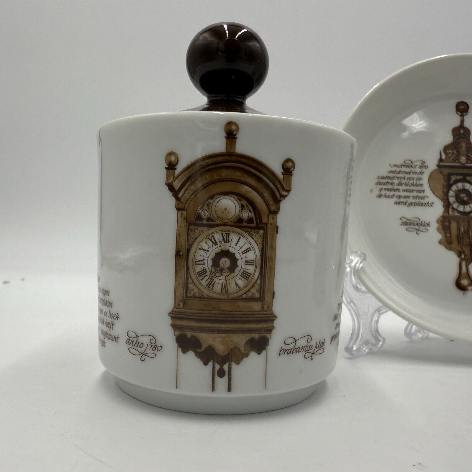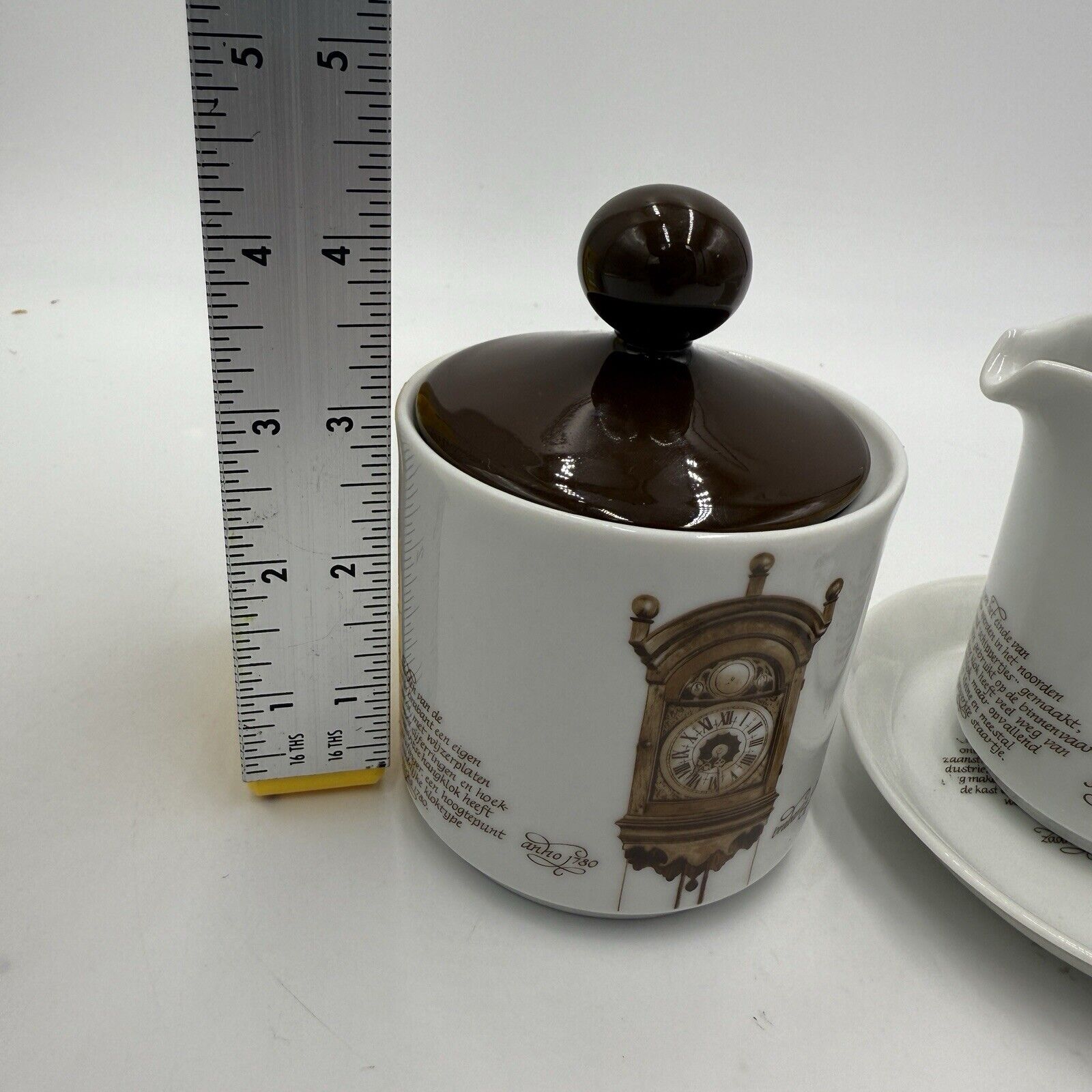 This antique set from Mitterteich Porzellan features a charming old clock pattern on a brown and white background. The set includes a lid, saucer, creamer, and sugar bowl, all made of high-quality porcelain with a glossy finish. The round shape and medium size make this set perfect for any kitchen or dining room, and the vintage style adds a touch of mid-century modernism to your décor.