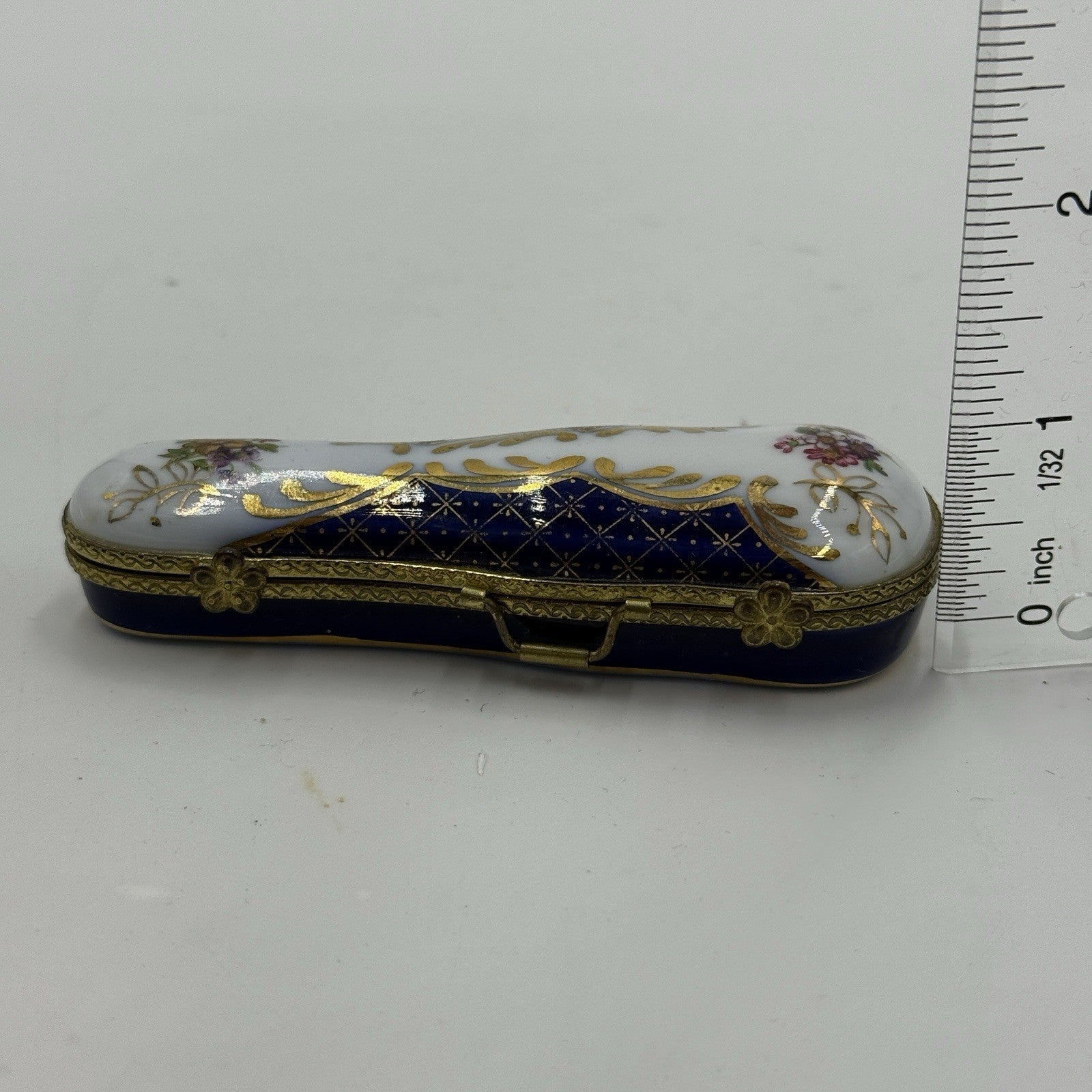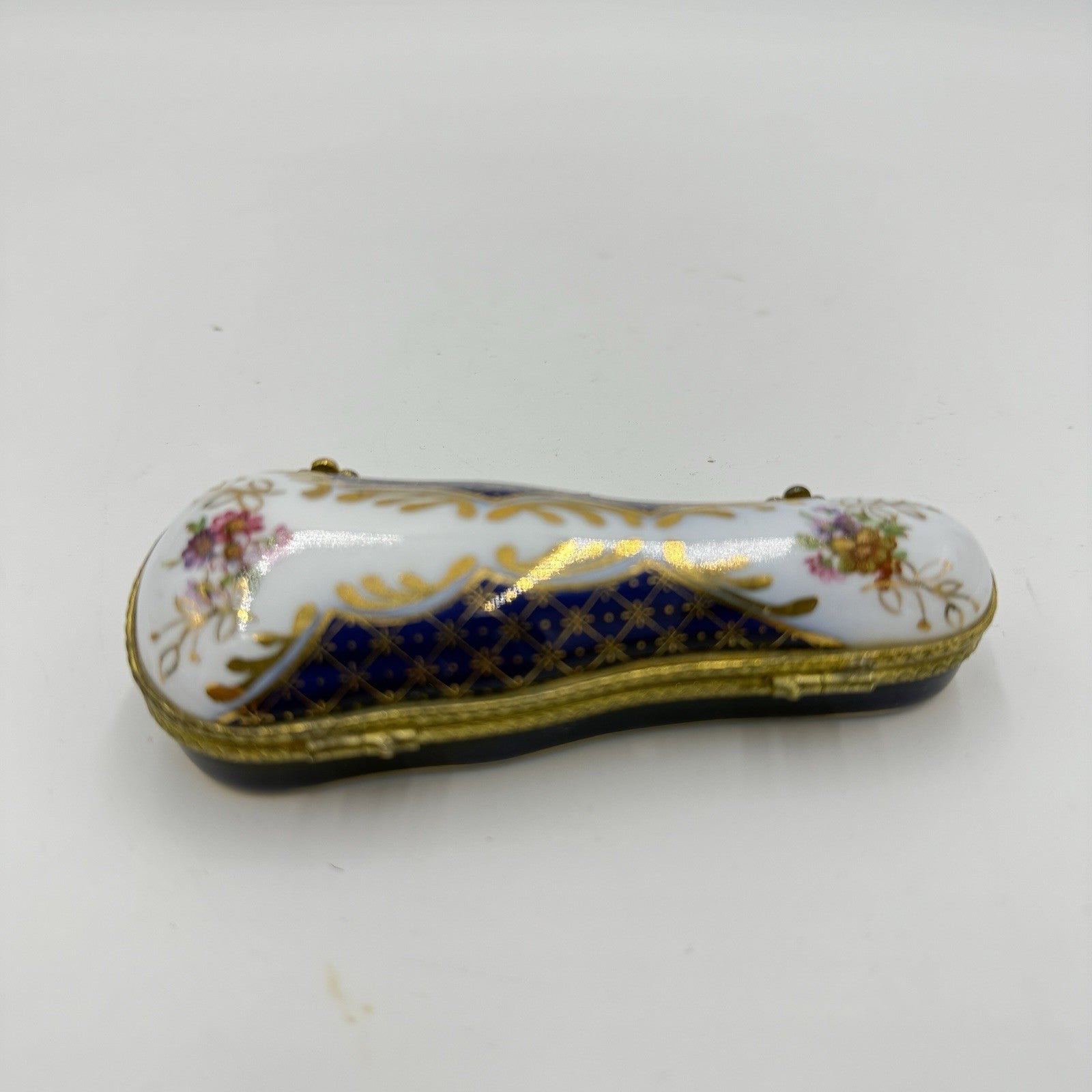 This product is a beautifully crafted miniature violin case trinket box made of porcelain with a cobalt floral design. Handmade in Germany, this unique piece would make a stunning addition to any collection of fine jewelry or trinket boxes. Perfect for storing small treasures or jewelry, this box combines intricate design with fine craftsmanship to create a one-of-a-kind piece for any collector's display.