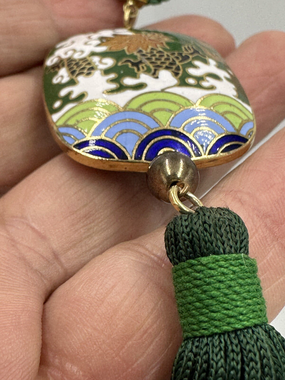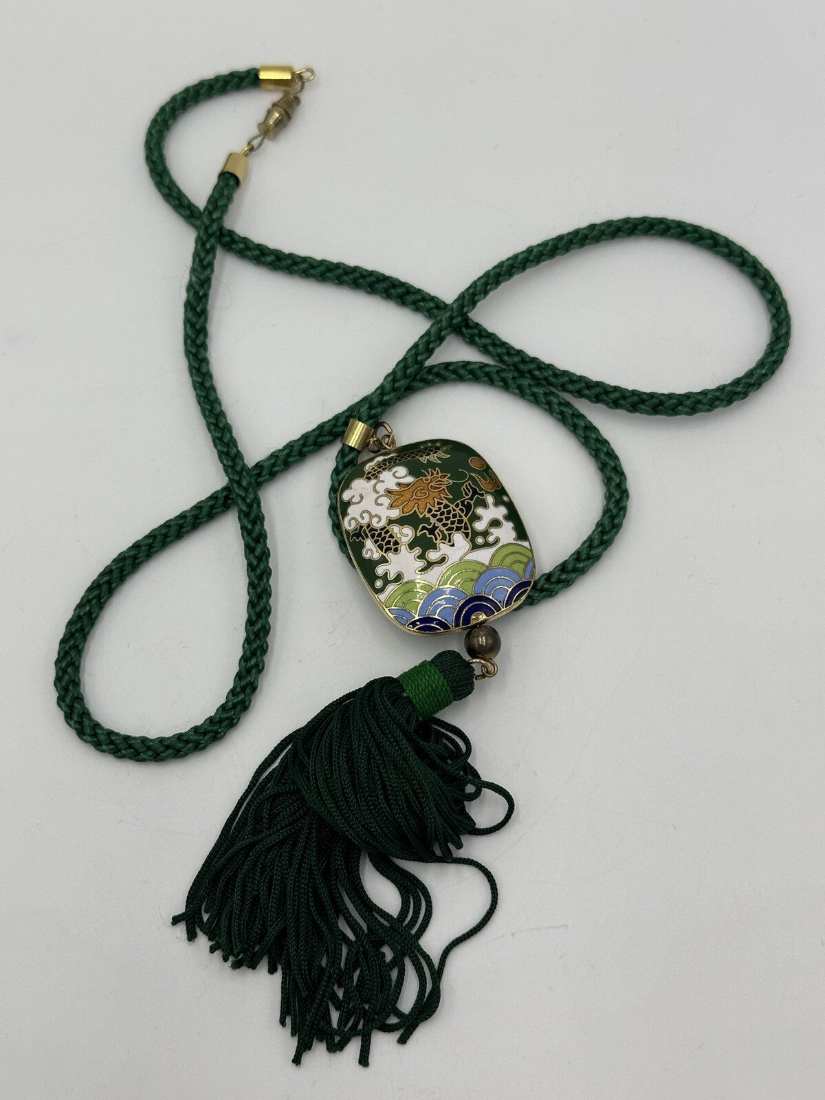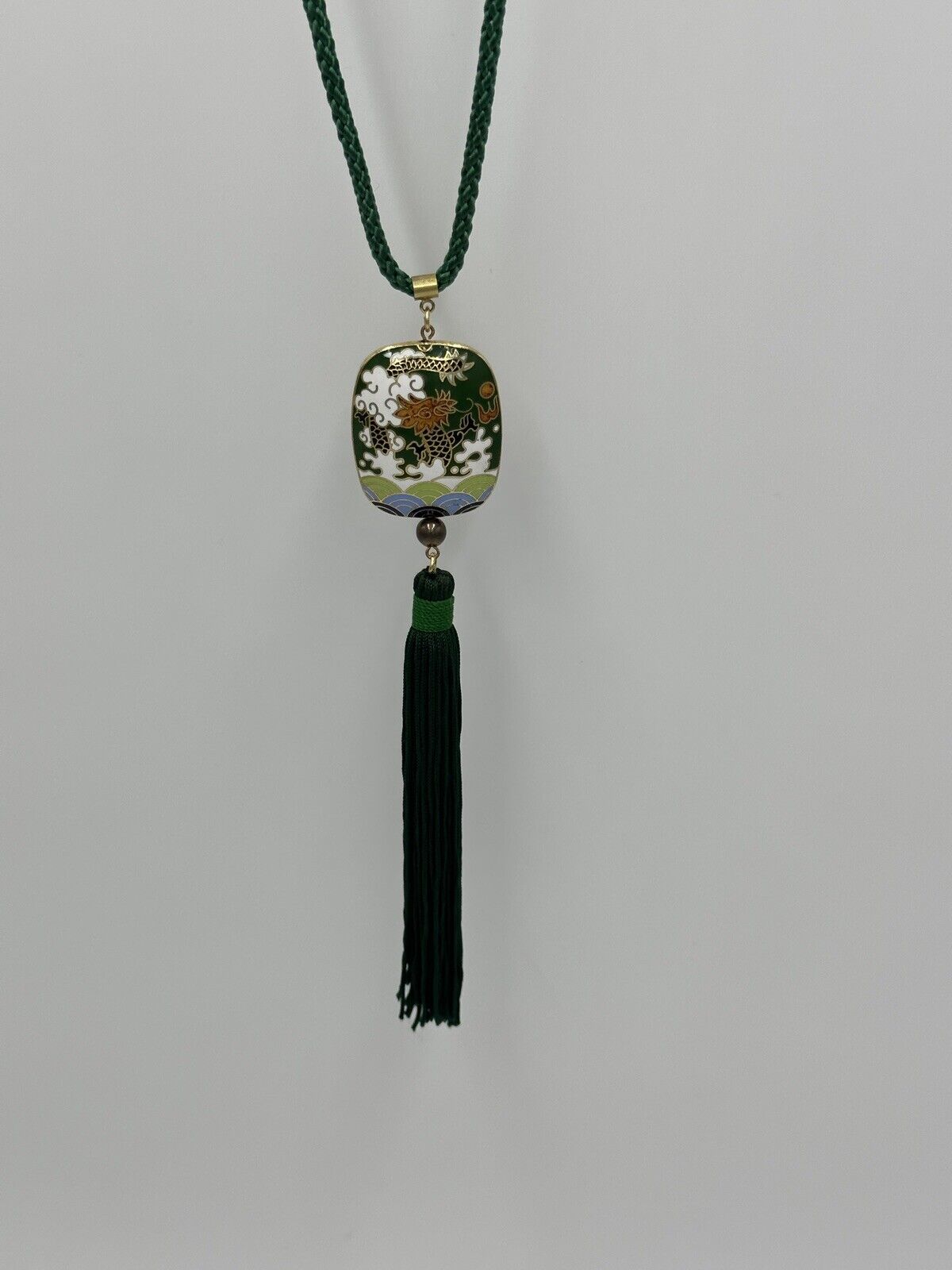 Necklace Tasseled Enamel Pendant Asian Dragon Design Gold Tone Vintage Green