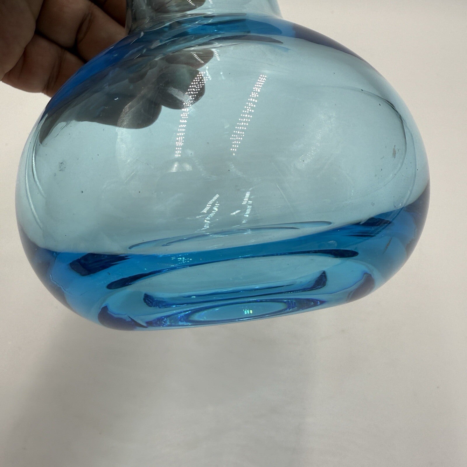 This vintage art glass vase from Oiva Toikka is a stunning piece that will add a touch of mid-century modern style to any decor. Hand blown in Finland in 1965, this 9" vase features a glossy finish and a beautiful blue color. The vase is multi-shaped, making it a unique and eye-catching addition to any collection.