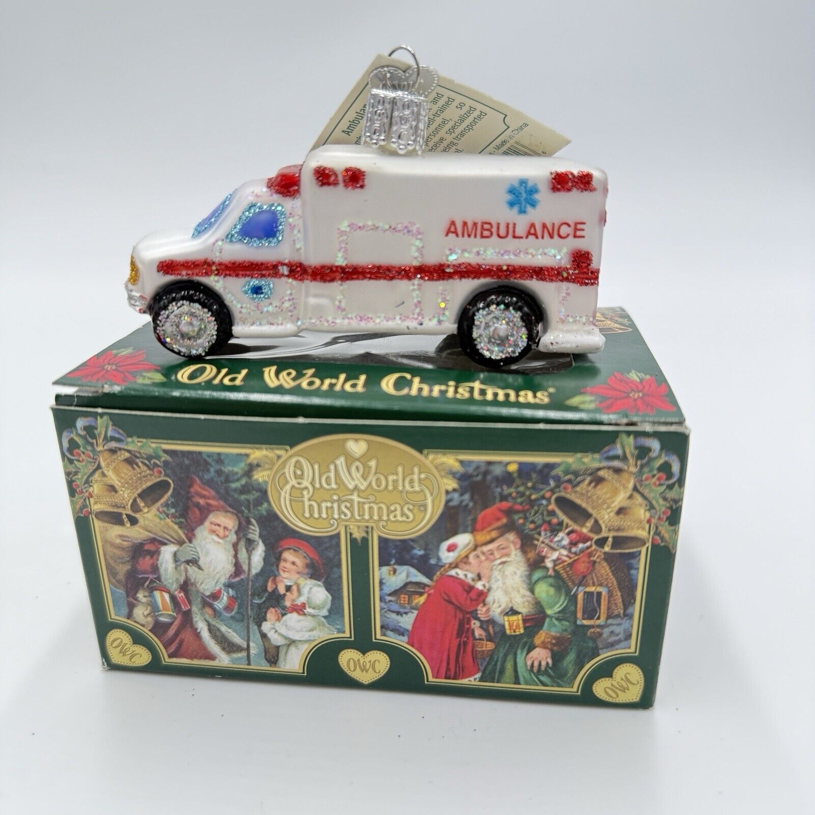 This is an Old World Christmas glass ornament in the shape of an ambulance. It is part of the holiday-themed collection of ornaments and is hand-blown in China. The ornament features an EMT first responder volunteer theme, making it a unique and decorative piece for Christmas.
