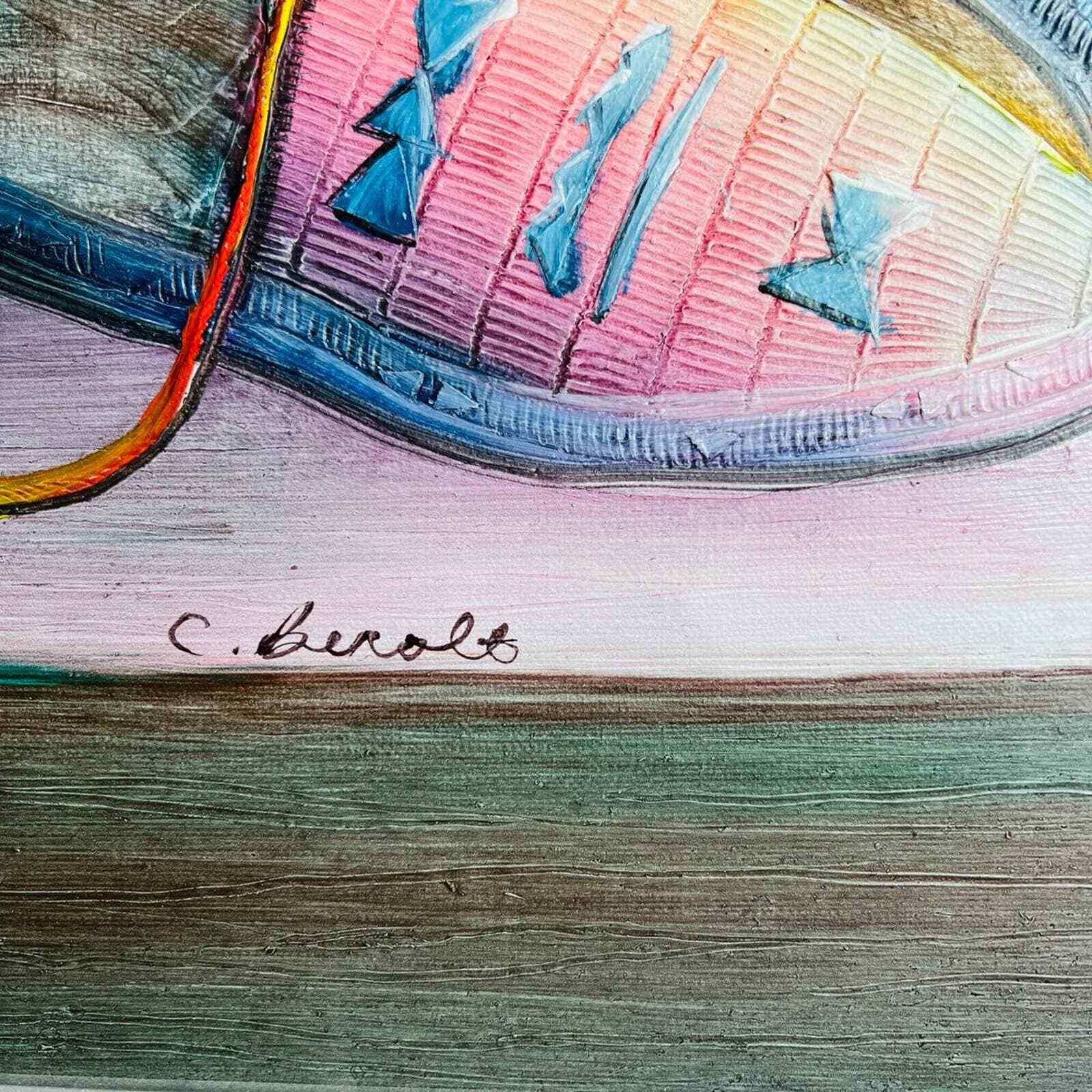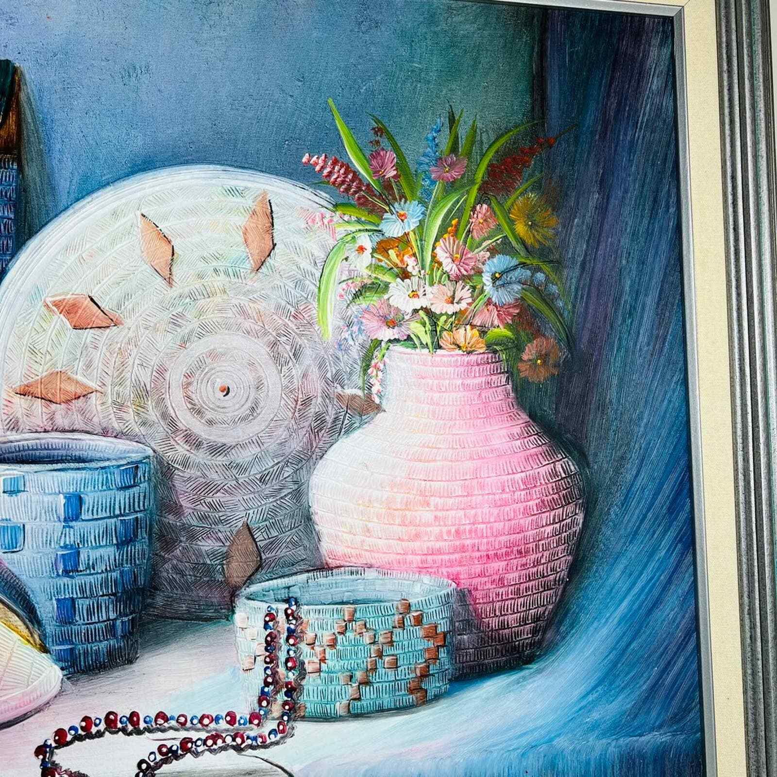 Original Oil Painting. This is signed "C. Benolt", which is a listed artist named Charles Redmond Benolt. This person is famous for his Southwestern native American Pottery paintings, his aquatis fish, and floral still life. His Native American scenes are of brightly colored 3-d looking pottery, flowers, and assorted Native American artifacts... His southwestern scenes seem to be the most popular, He uses a technique of layering up the paint thick in areas like the designs on the pottery, petals of flowers etc.