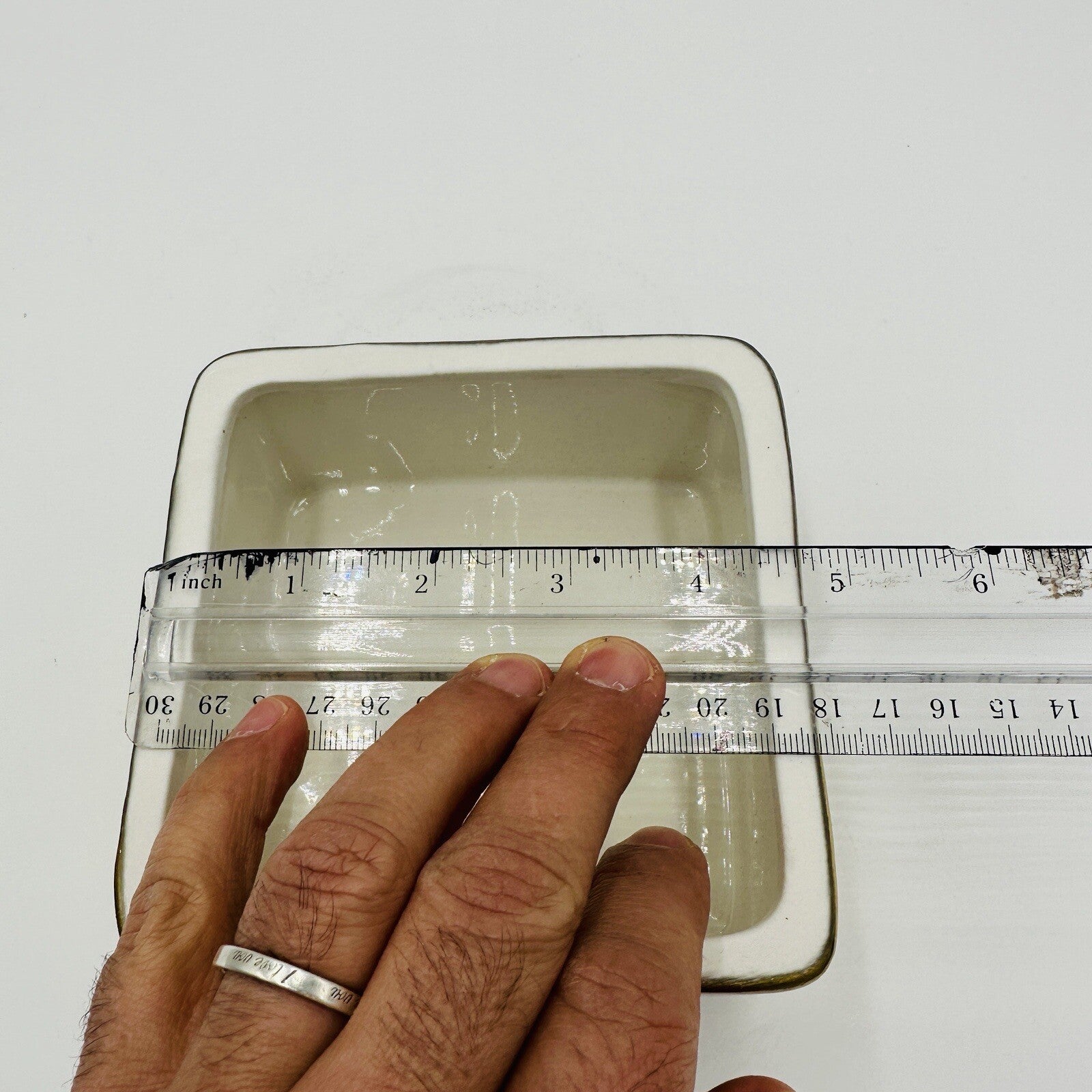 4.5 in x 2 inMissing the lid. Box is in good condition