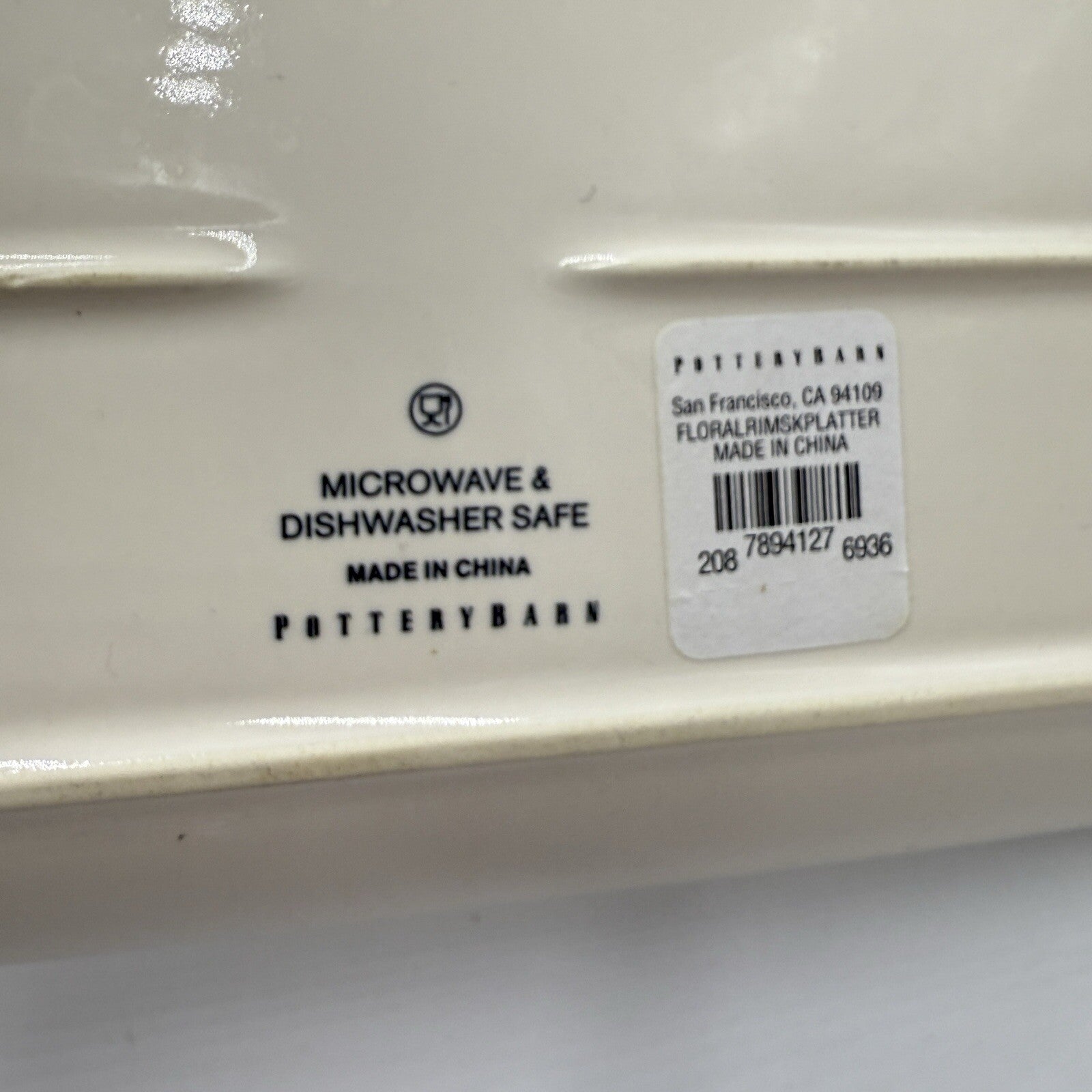 This is a Pottery Barn oval platter featuring a floral pattern. It is made of stoneware and measures 15.5 inches in diameter. The platter is part of the Spring Floral product line and is dishwasher and microwave safe. It has a glossy finish and a contemporary style, with hand-painted details. The item is from California and was manufactured in China.