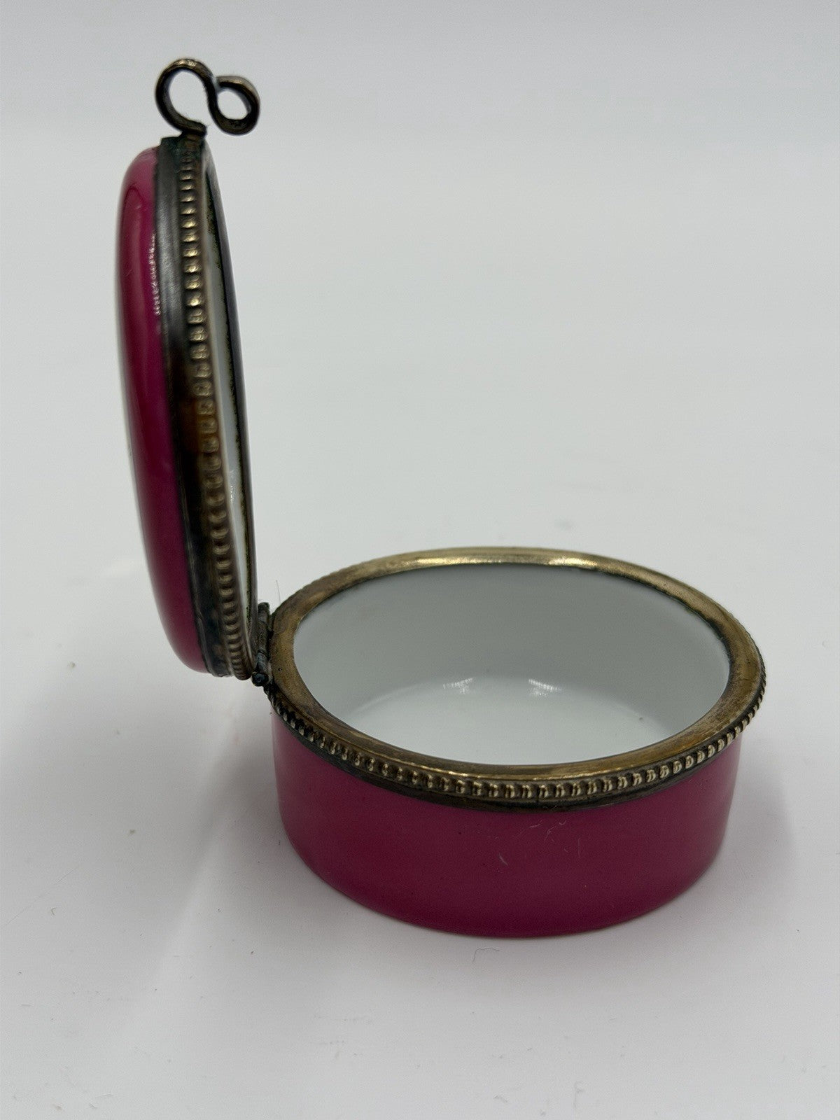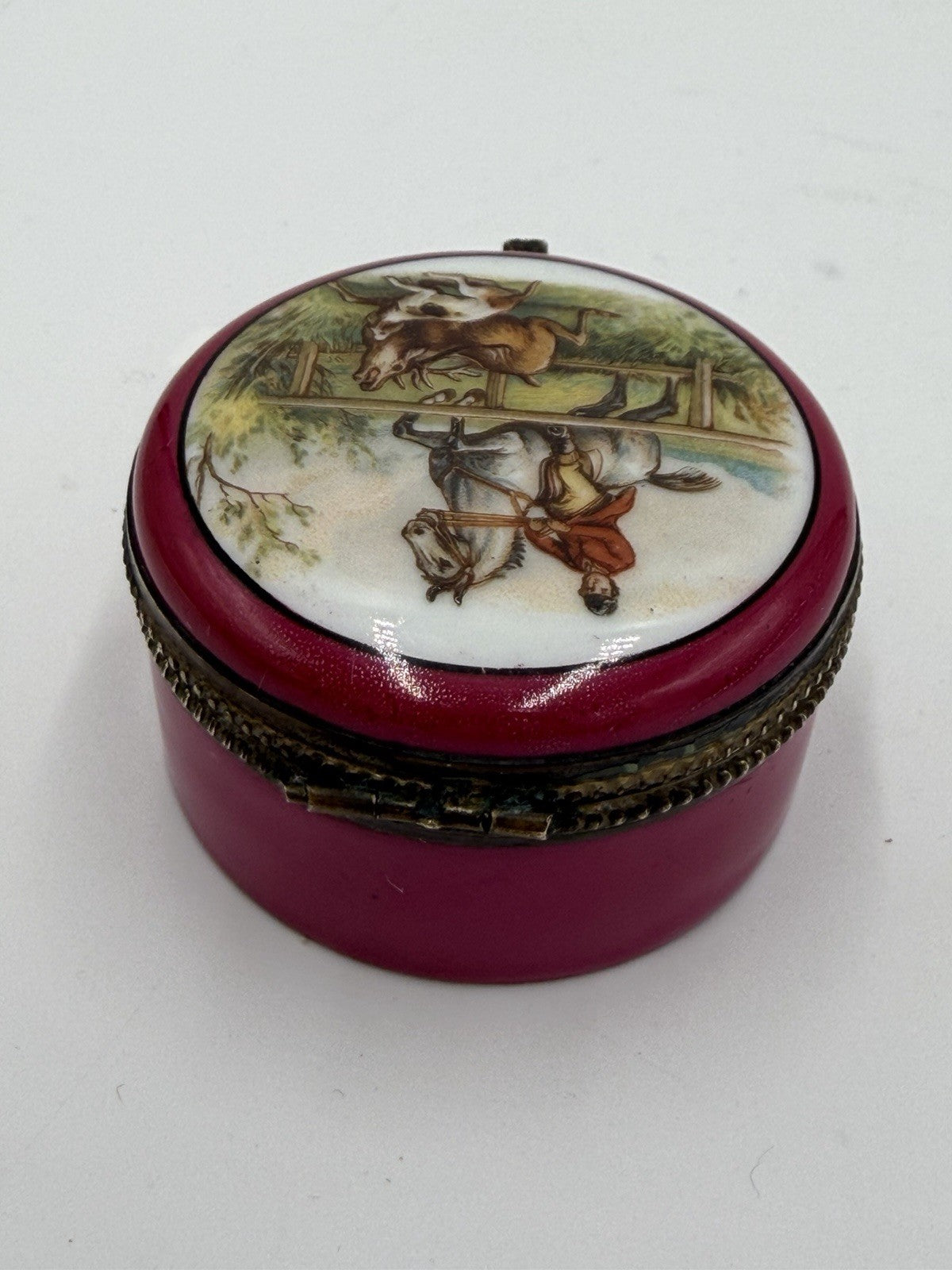 This rare antique Czechoslovakian painted porcelain trinket box features an equestrian hunt scene, making it a unique and collectible item. The round box, measuring about 1" in height, showcases a Victorian style with a pink color scheme and intricate details of a horse riding hunter. Made of porcelain and metal, this original piece from the early 1900s is a valuable addition to any collection of keepsake boxes or decorative items, especially for those interested in equestrian themes.