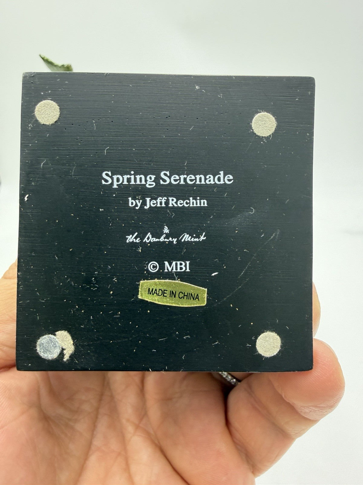 The RARE Danbury Mint SPRING SERENADE Yellow WARBLER Bird Figurine BY Jeff Rechtin is a beautifully crafted resin figurine depicting a yellow warbler bird, perfect for the spring season. Hand painted with intricate details, this collectible piece from the late 20th century is a unique addition to any room's decor. The figurine comes unboxed and features a bird theme, making it a special item for adults who appreciate bird-related sculptures and figurines. A beautiful and original piece by Danbury Mint, this figurine is a must-have for collectors of bird-themed items.