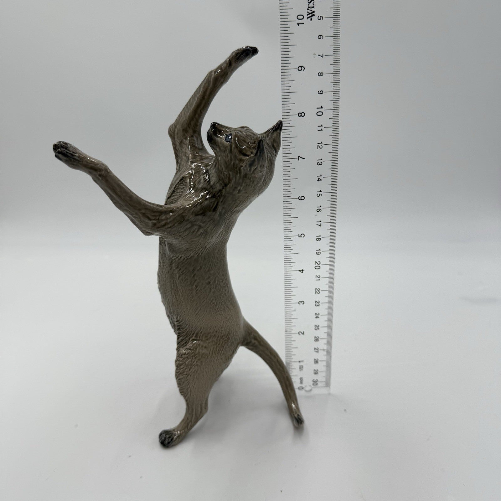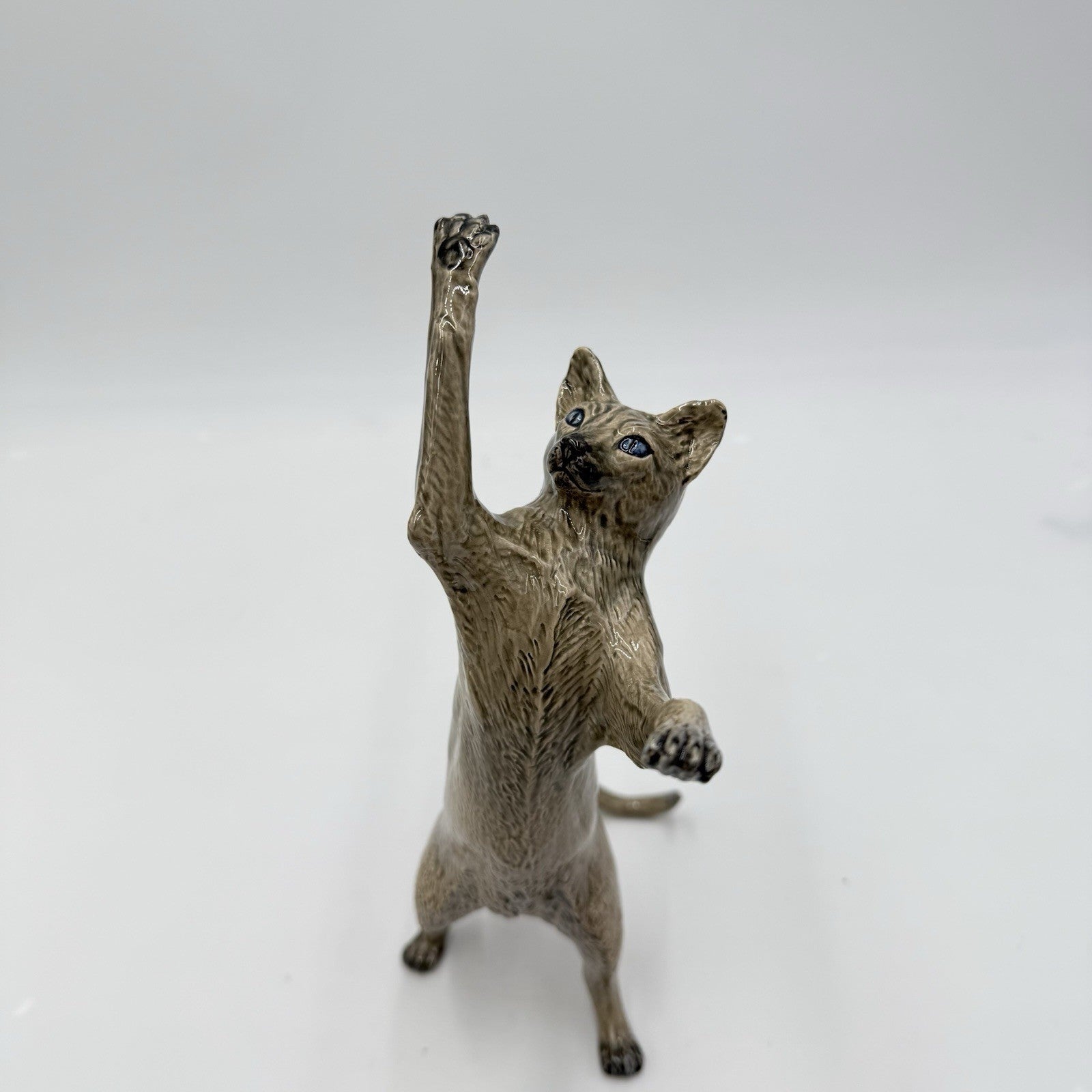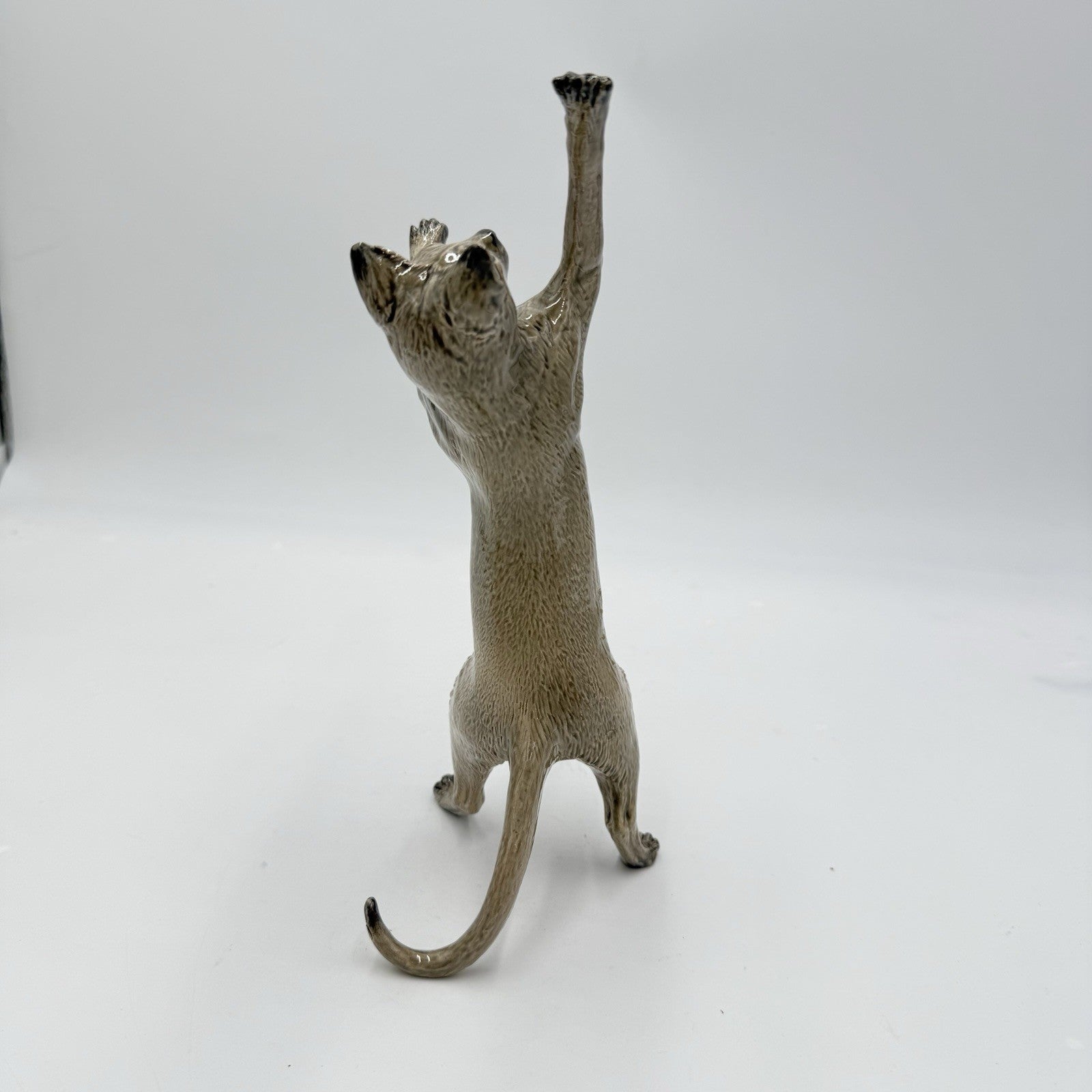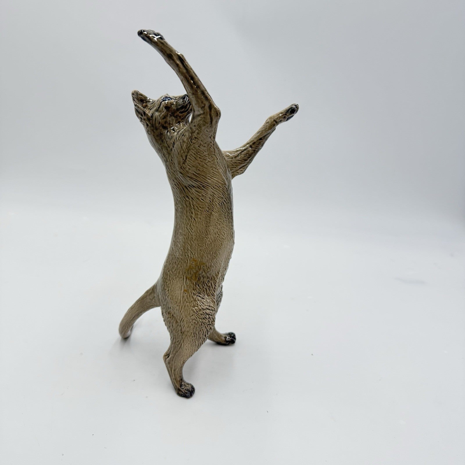 This rare HEREDITIES England porcelain Charm of Creamware stretching cat figurine is a charming piece for cat lovers. Standing at 9 inches tall, this medium-sized figurine depicts a mischievous cat in a unique stretching pose, making it a delightful addition to any collection. Crafted in the 1980s in the United Kingdom, this original piece from the Cats collection by HEREDITIES England showcases a cat theme with a touch of charm. Perfect for all occasions, this figurine is a lovely decorative collectible for adults who appreciate cat sculptures.