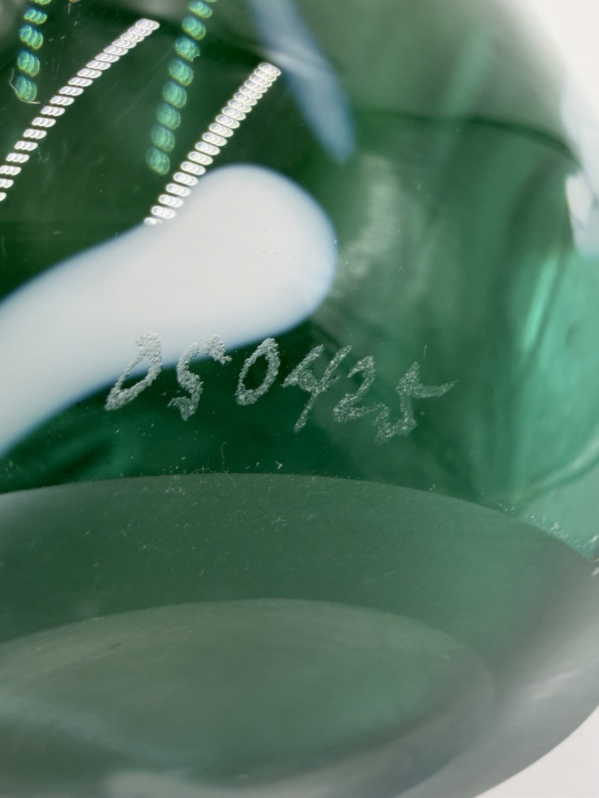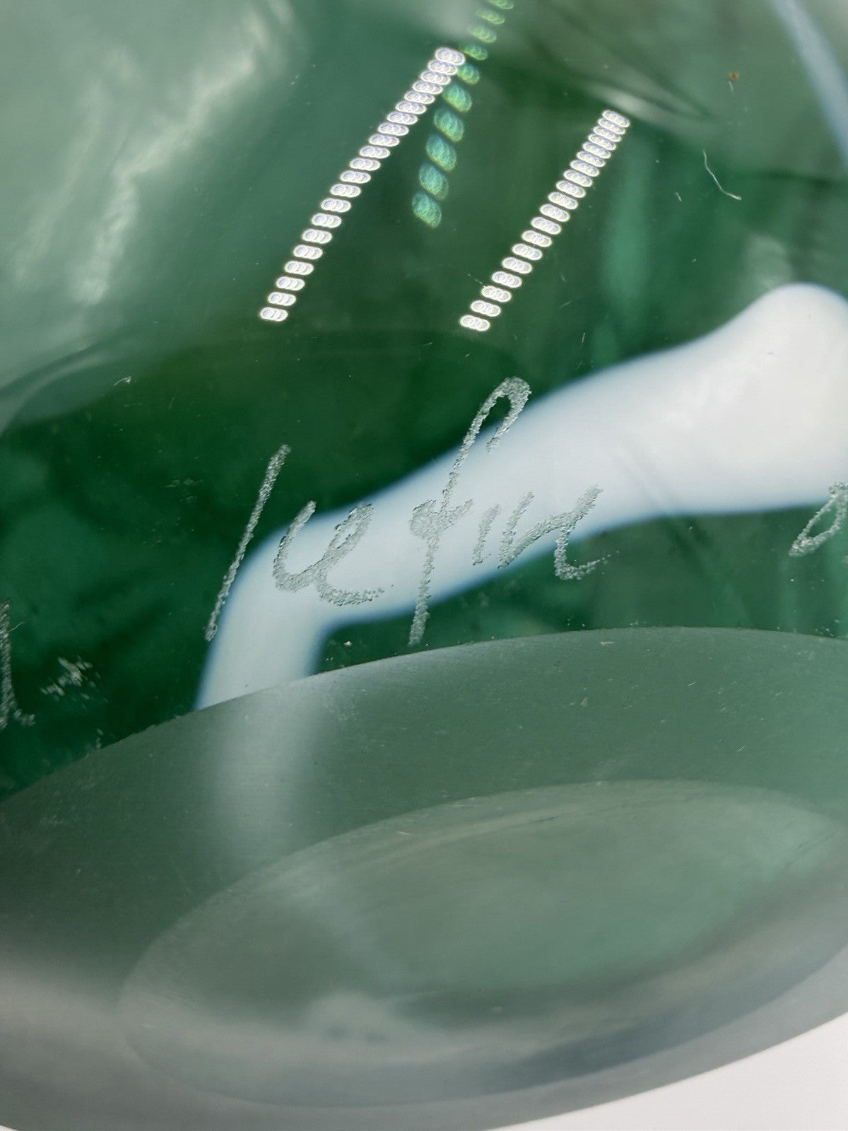 This rare vintage James Kingwell Ice Fire Art Glass green large 11” vase is a unique and eye-catching piece of decorative pottery and glassware from the 1970s. Hand-blown and signed by the artist, this vase features a swirl pattern inspired by fire, showcasing a contemporary abstract style. The glossy green finish and incised backstamp add to its appeal, making it a standout addition to any art glass collection. Made in the United States, this studio-produced piece has a 3D effect and embodies the art glass production style of the era.
