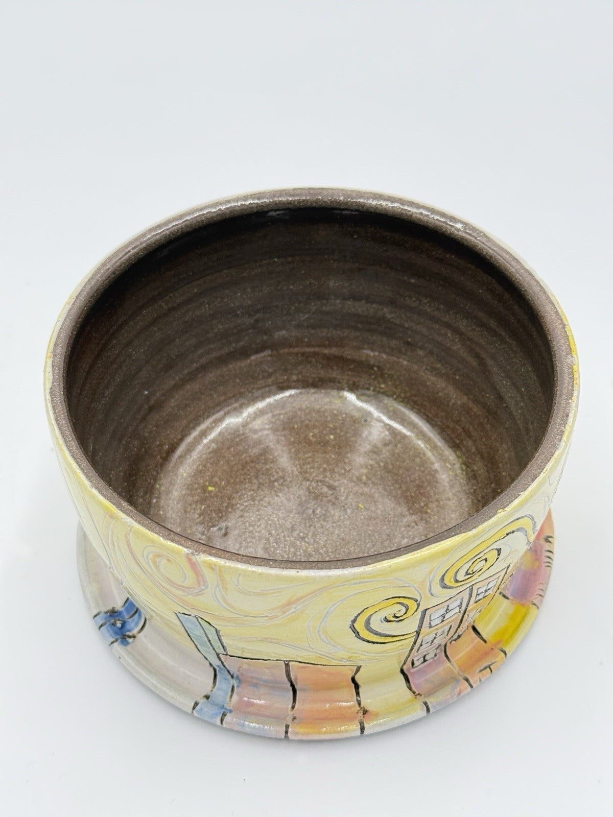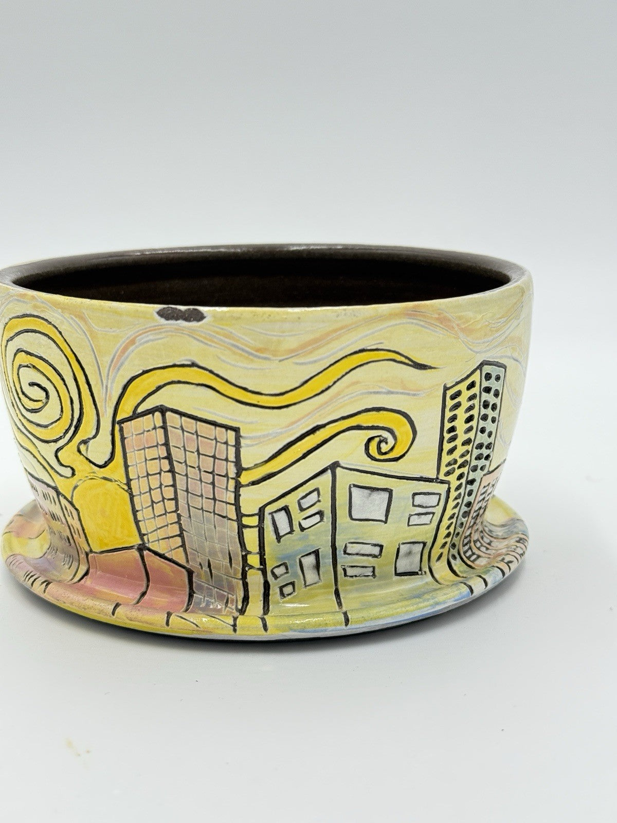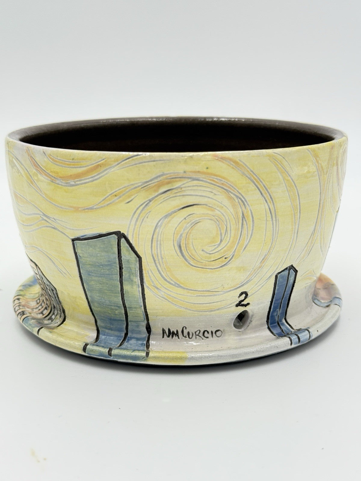 This rare Seeds for Bees" planter by N.M. Curcio studio art pottery is a unique piece of contemporary style. The planter is made of stoneware material and has a glossy finish. The multicolor abstract pattern features a city subject, making it a great addition to any home decor. The planter is 3" in height and 6" in width, perfect for showcasing your favorite plants. This original piece was produced in the United States using traditional pottery techniques.