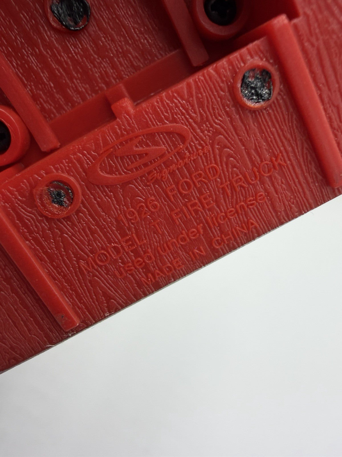 The Signature Models 1928 DieCast REO Fire Engine in red 1/32 scale is a collectible toy truck replica of a fire department vehicle. Made of diecast material, this model features a Ford truck design with a specific theme of fire departments. Manufactured in 2003 in China, this piece is a detailed and authentic representation of a vintage fire engine from 1928. Perfect for enthusiasts of diecast vehicles or fire department memorabilia, this model offers a unique addition to any collection.