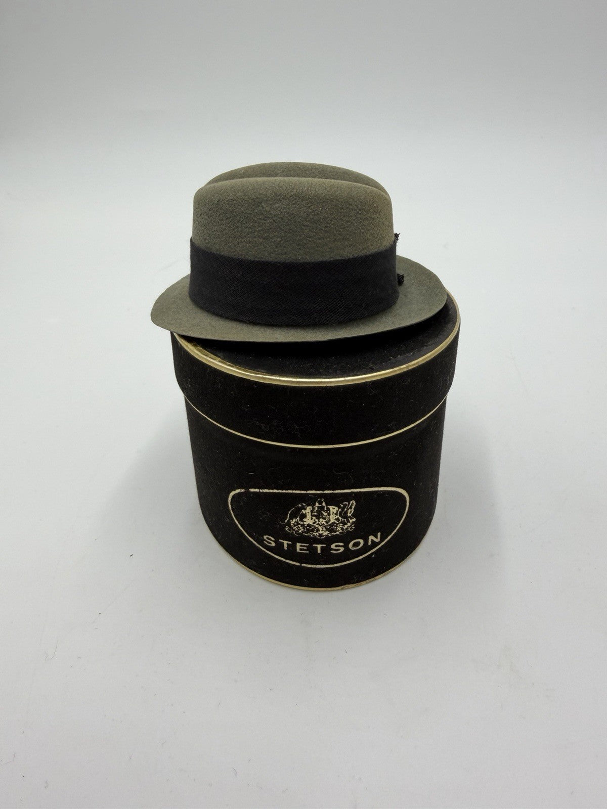 The Stetson Salesman Sample Miniature Hat is a vintage accessory from the 1950s, crafted from wool felt in a classic Fedora style. This original, gray-colored hat comes with its original box and is made in the United States. Perfect for collectors or enthusiasts of vintage men's hats, this miniature Stetson hat is a unique and nostalgic piece of apparel.